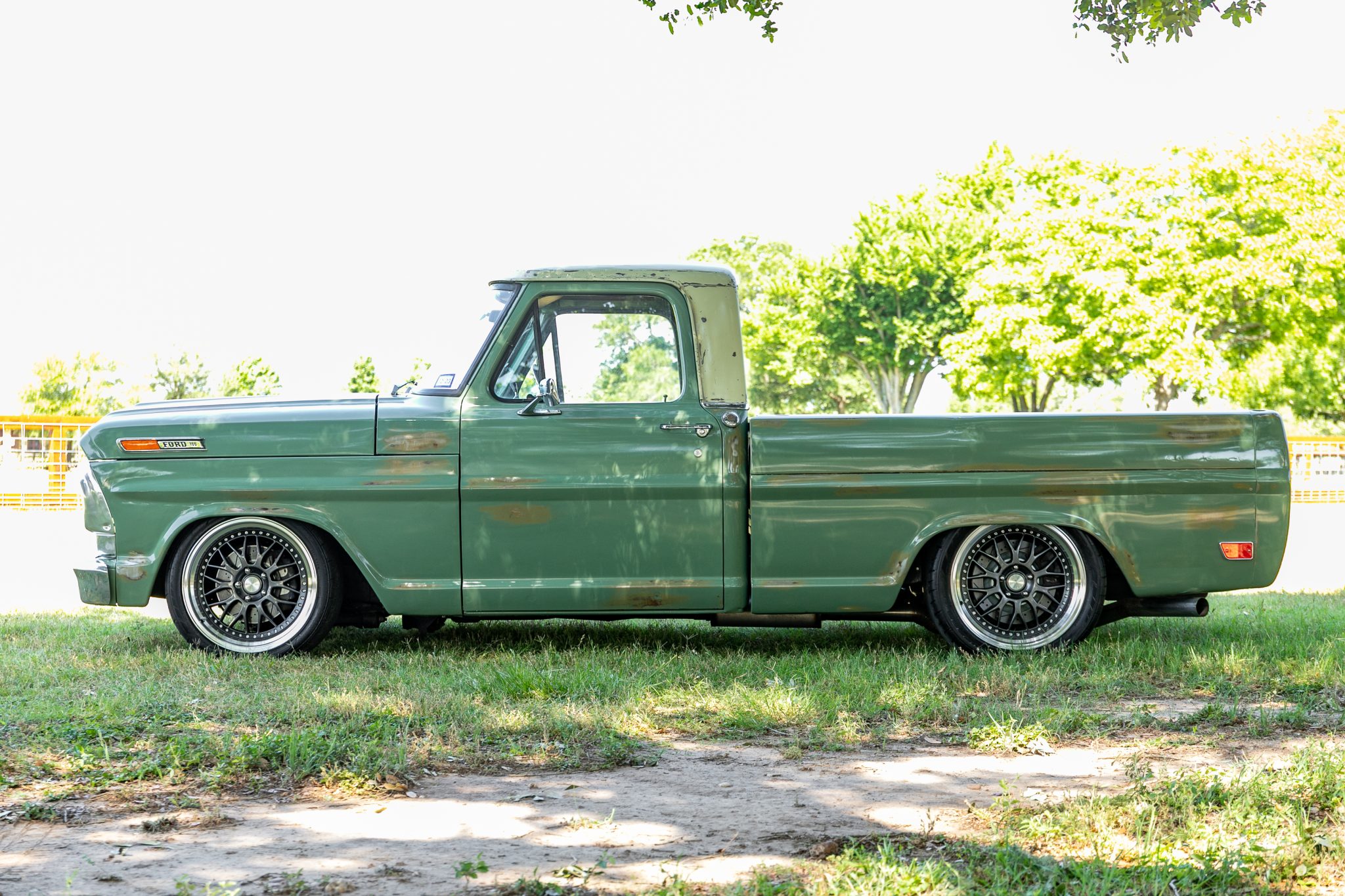 Gray 19″ ESR SR01 alloy wheels feature bright lips and are mounted with 275/35 front and 305/33 rear Nitto NT555 G2 tires. Independent front suspension components and rack-and-pinion steering from a 2008 Ford Crown Victoria have been installed, and the rear suspension was converted to an independent setup using components from a 2015 Ford Mustang. Team321 adjustable coilers have been installed, and stopping power is from power-assisted four-wheel disc brakes with cross-drilled and slotted rotors. The seller notes a whine from the power steering pump.