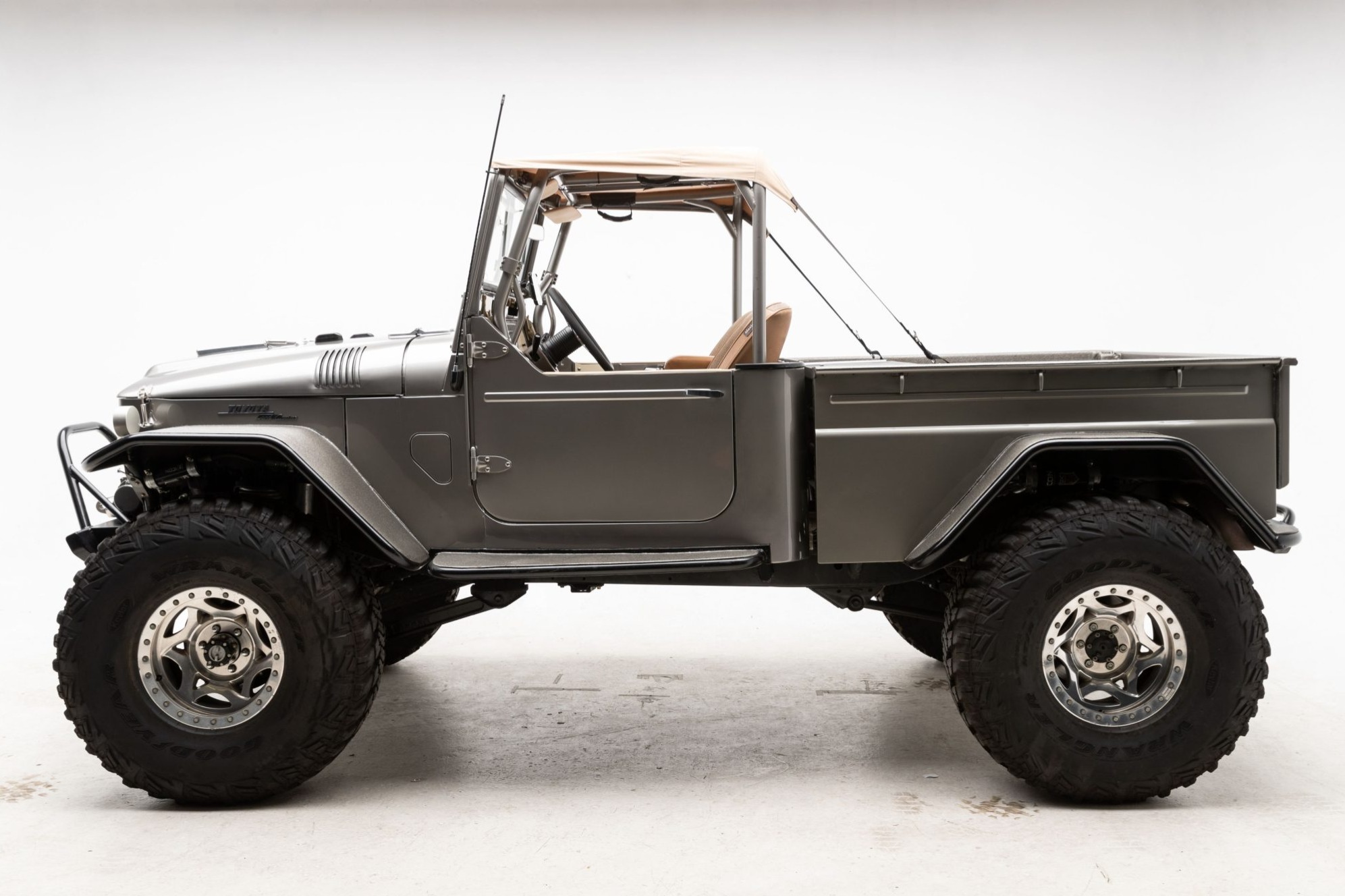 Walker Evans Racing 17″ beadlock wheels are mounted with 40×13.50″ Goodyear Wrangler kevlar tires all around, and Aisin manually locking hubs are fitted up front. The suspension is raised approximately 3″ using an Icon Slinky system with 2.5″ reservoir shocks, custom-made coil springs, adjustable panhard bars and rear links, and Slee Off-Road trailing arms. Additional modifications include a power steering system with hydraulic assist, a 105-series Land Cruiser steering box with a drop pitman arm, and disc brakes at each corner.