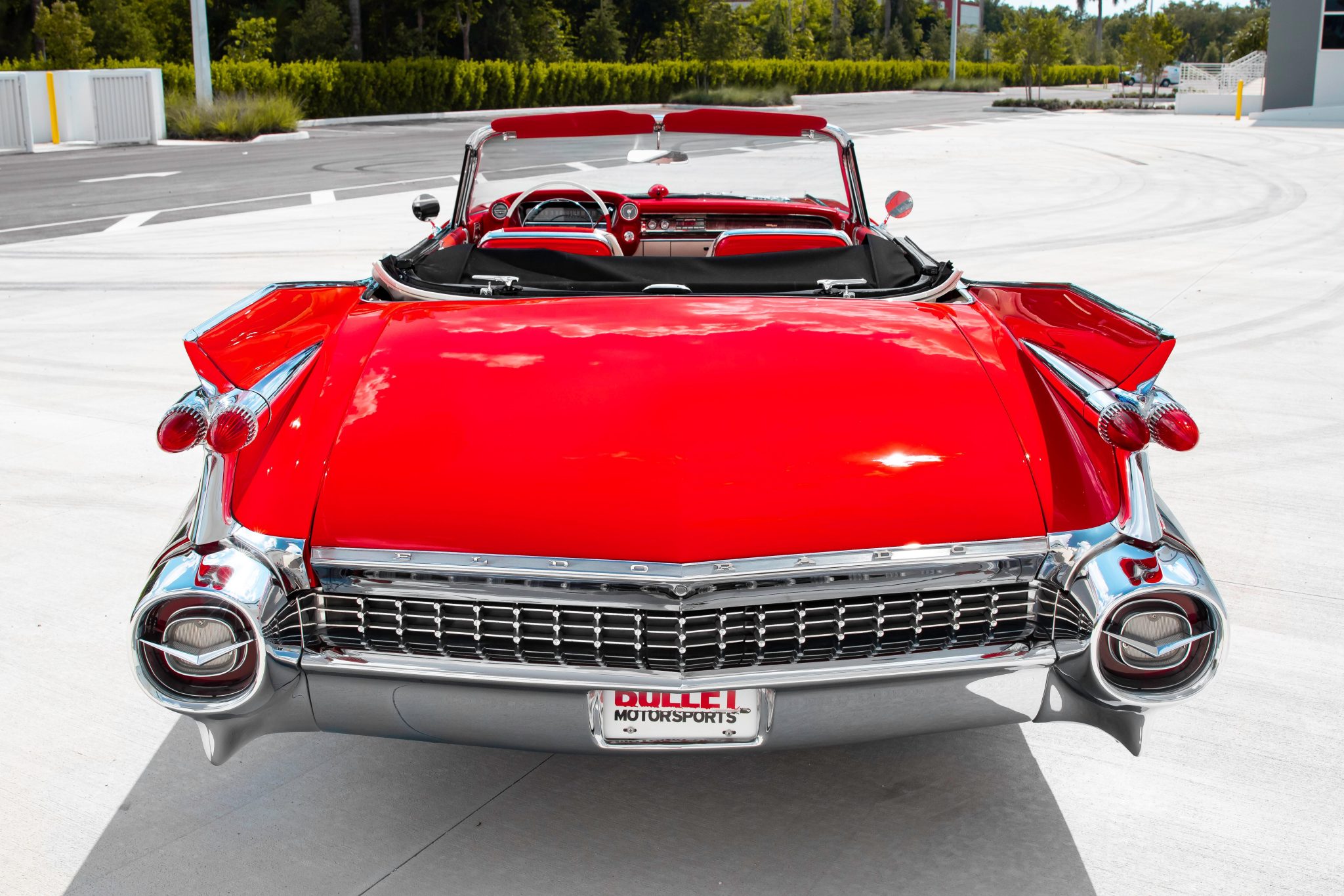 The power-operated white convertible soft top is shown raised in the gallery below. Steel wheels measure 15″ in diameter and are fitted with full covers as well as wide-whitewall tires. Braking is from power-assisted drums at all four corners.