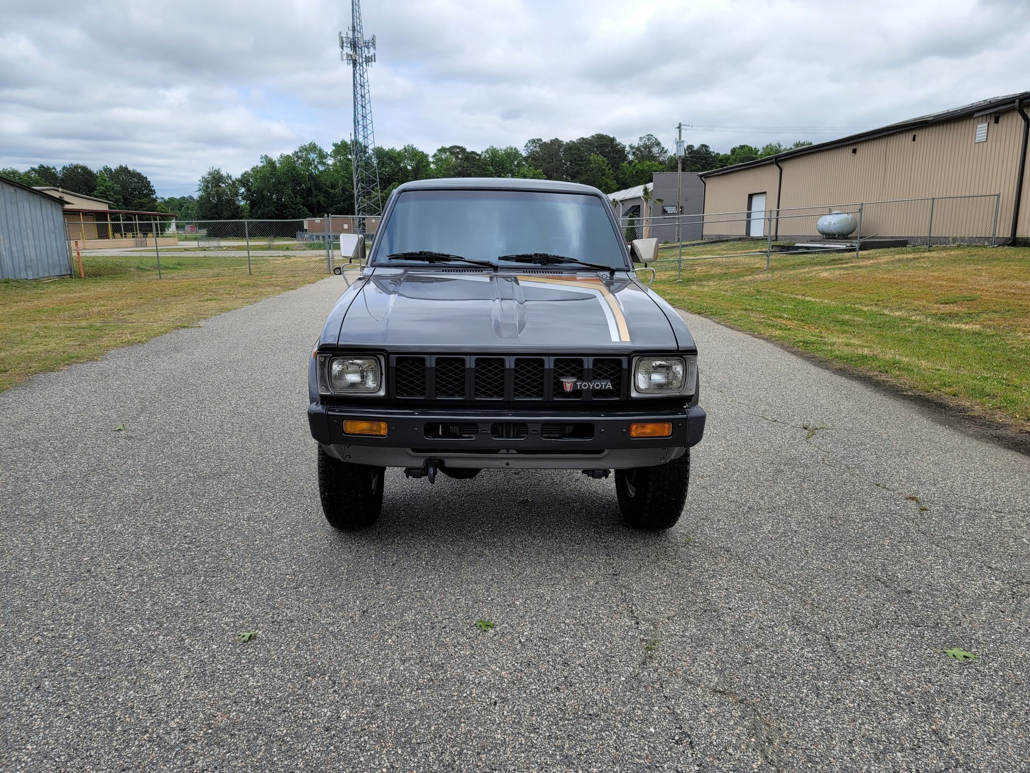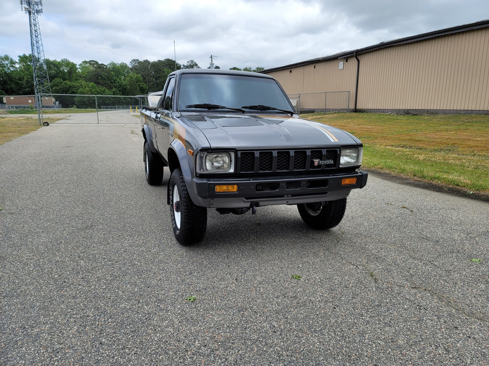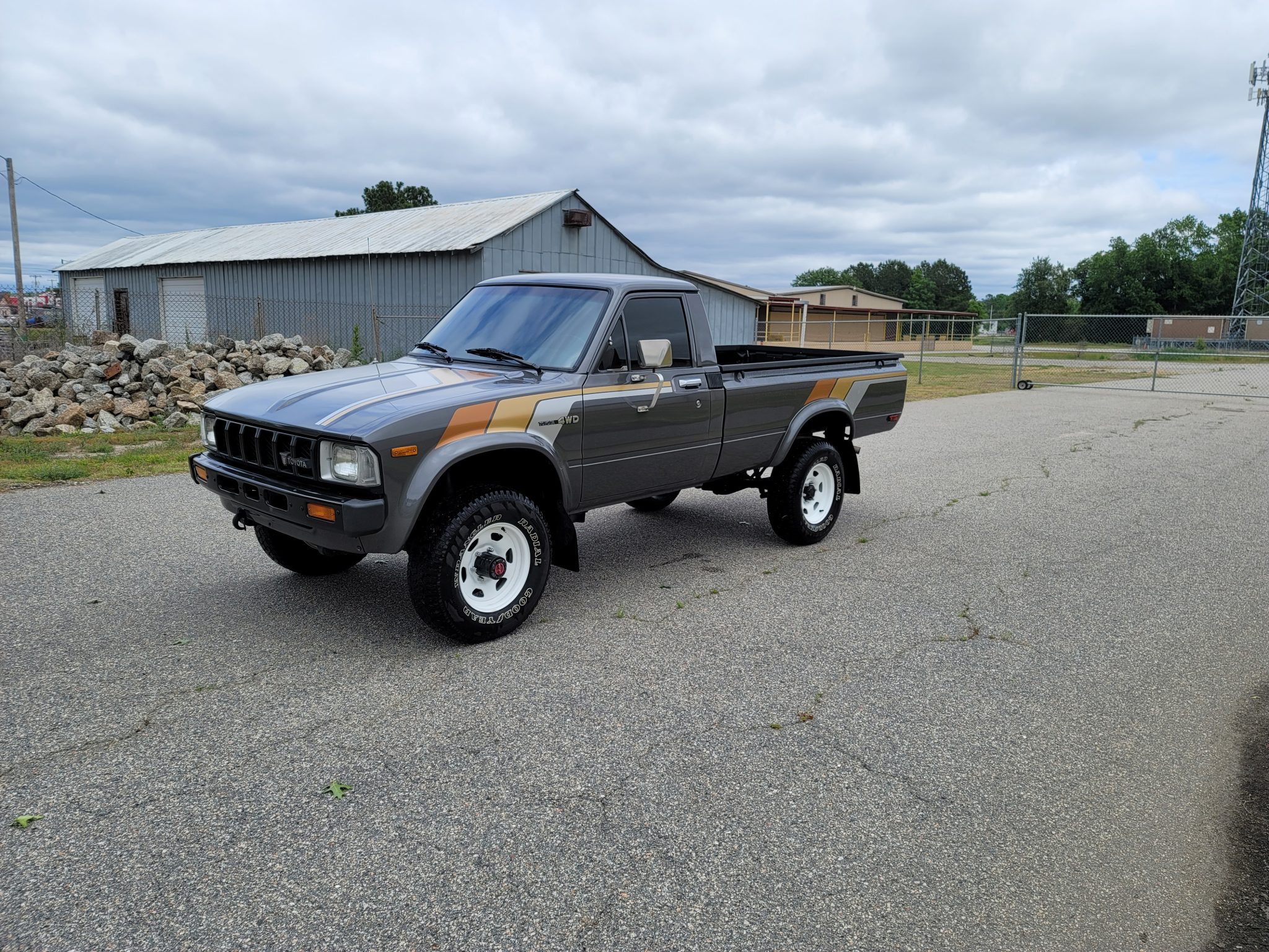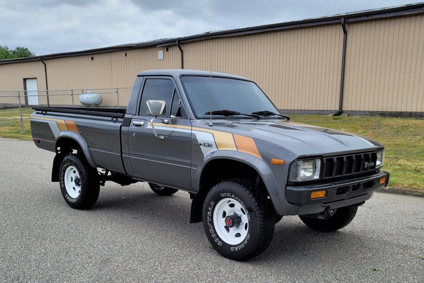 Steel 15″ wheels are finished in white and wear 235/75 Goodyear Wrangler Radial tires, and a spare is mounted under the bed. The truck is equipped with power-assisted steering and brakes along with manually locking Aisin front hubs. The seller notes flat-spotting on the tires due to prolonged periods of storage.