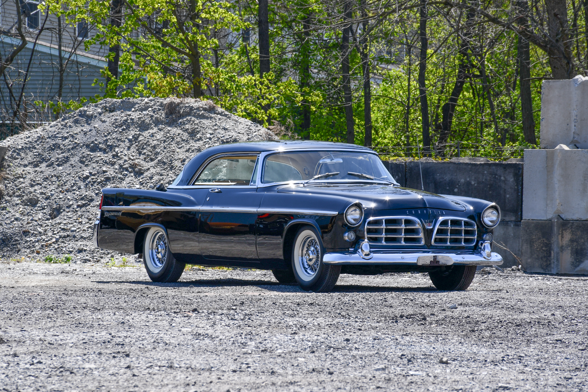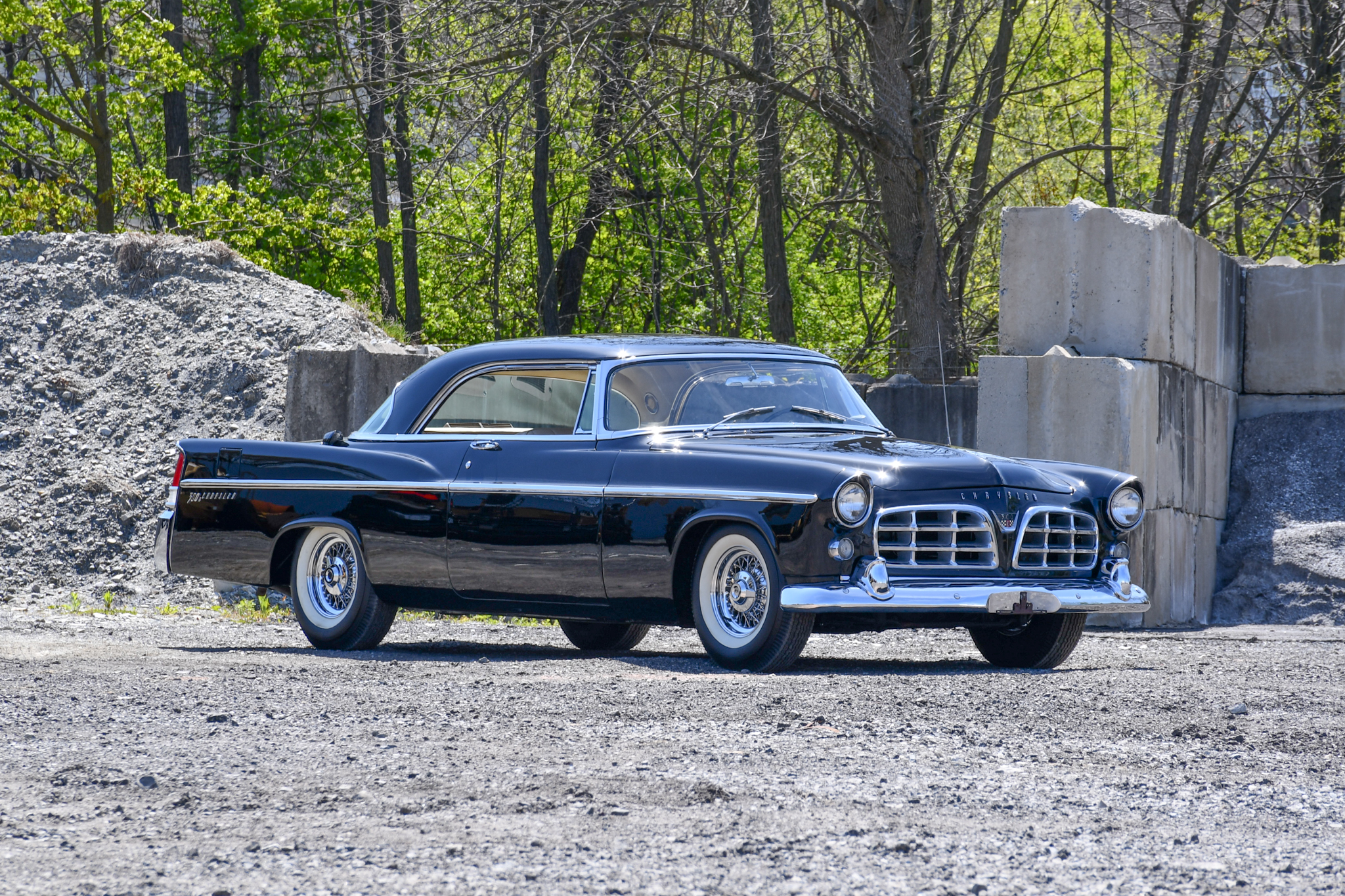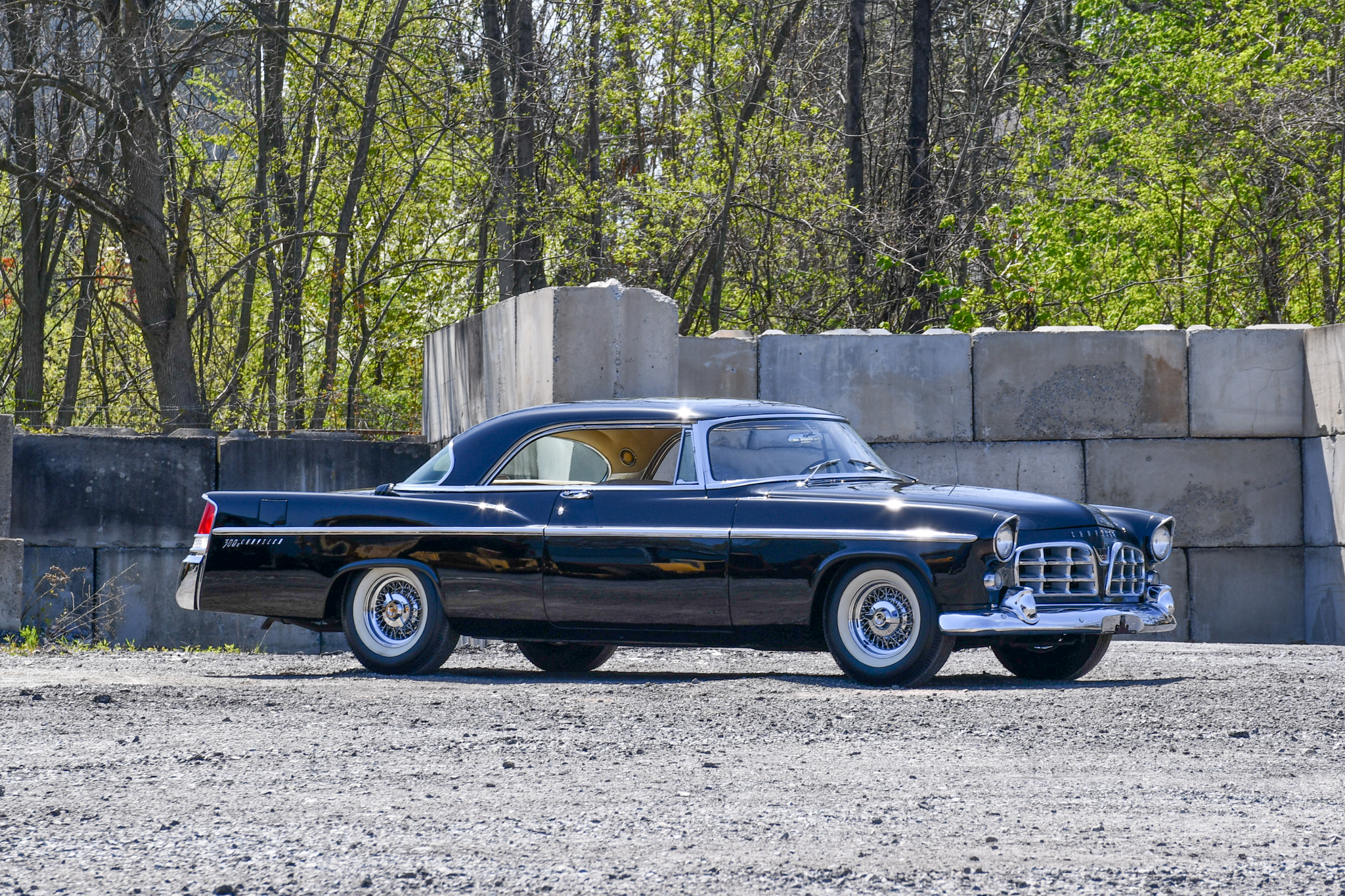 Chrome 15” wire wheels with spinner hubcaps were a factory option and wear Universal white wall tires. The 300 series featured stiffer suspension than contemporary Chrysler models, and braking is handled by four-wheel drums.
