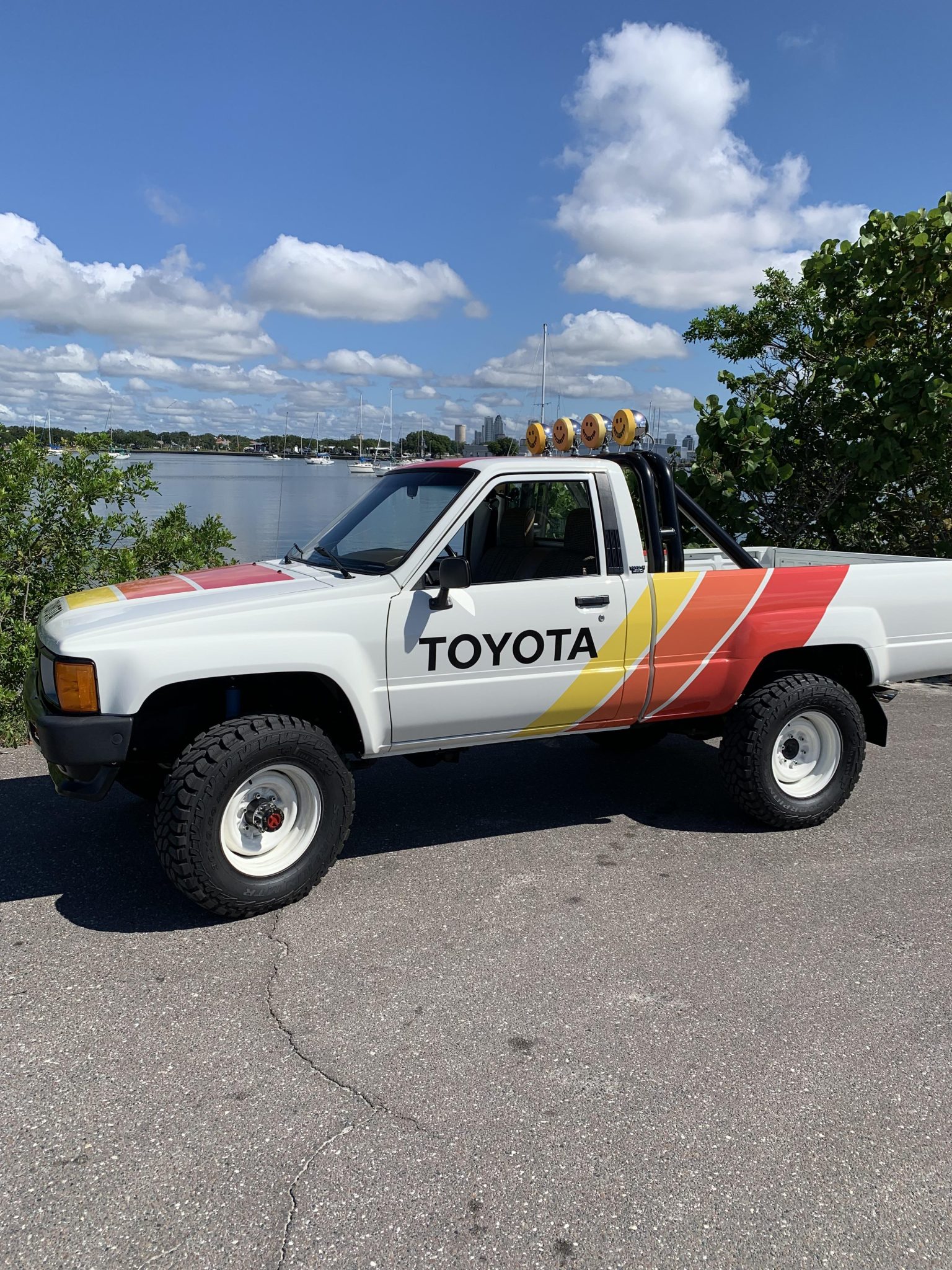 White-painted 15″ steel wheels are mounted with 30×9.5″ Pirelli Scorpion MTR tires with 2015 date codes. A spare wheel and tire are stored beneath the bed. The truck is equipped with manually locking front hubs as well as Bilstein shocks, and stopping power is provided by front disc and rear drum brakes. The steering gear was replaced in September 2021, and the seller notes that the rear brake line was repaired under current ownership.