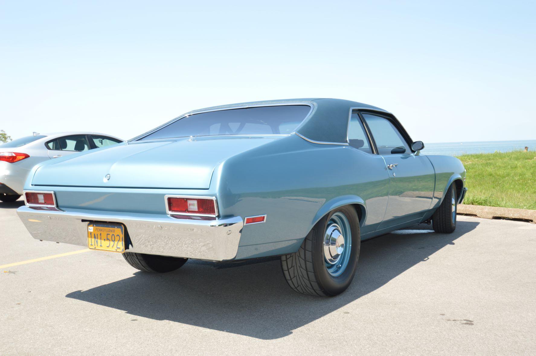 Blue-painted 14″ front and 15″ rear steel wheels with chrome hubcaps wear 195/70 Douglas All-Season and 275/60 Nitto NT555R Extreme Drag tires, respectively. The car is equipped with adjustable Cal-Trac rear traction bars, power steering, and power-assisted front disc brakes. The seller states that Hotchkis front and rear sway bars, front lowering springs, and 2″ front drop spindles have also been installed.