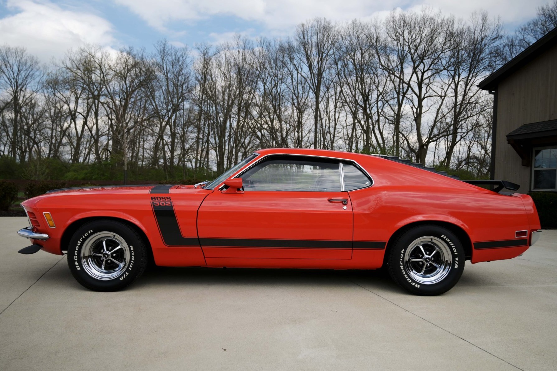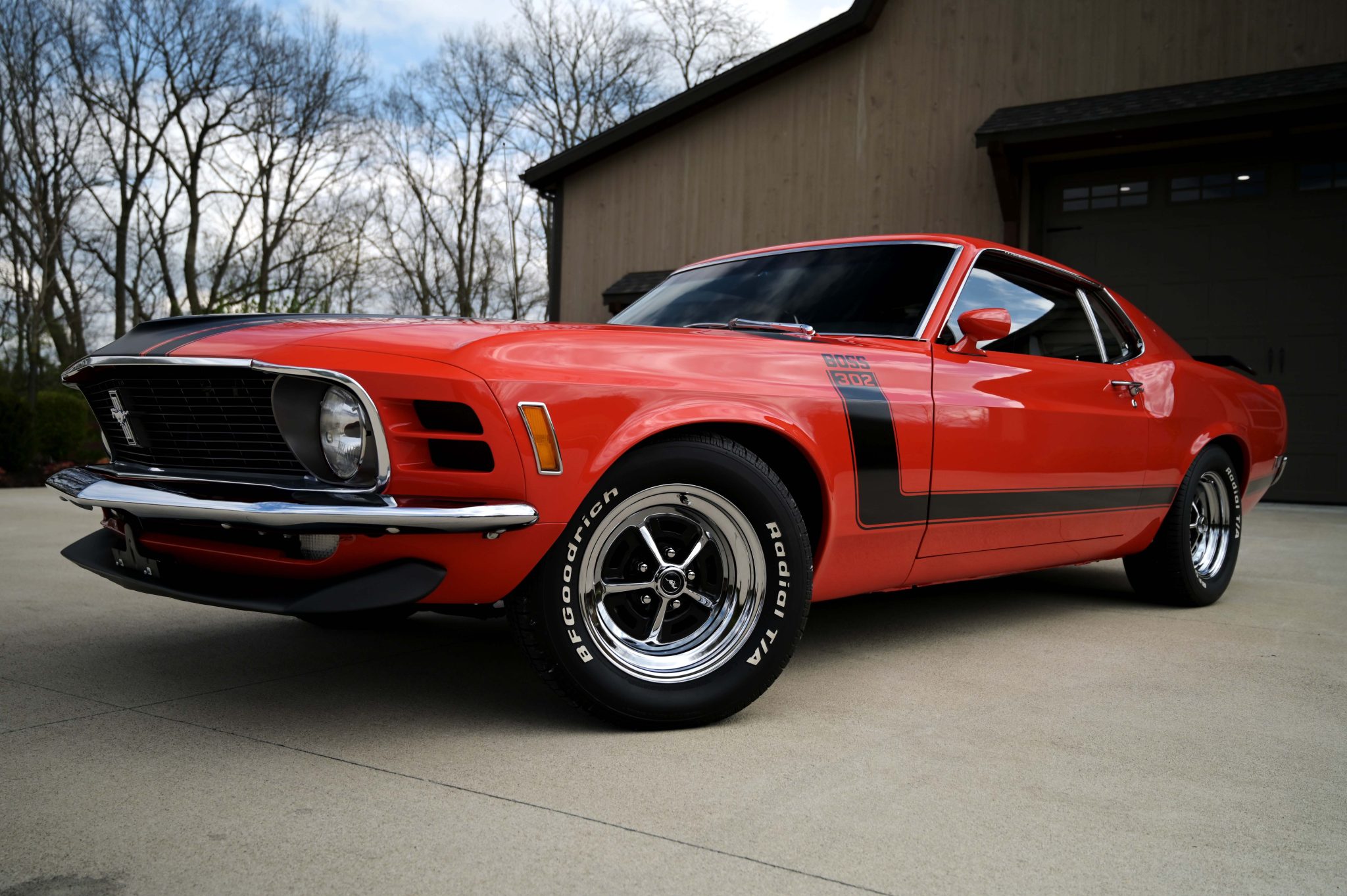 The 15” Magnum 500-style wheels are mounted with BFGoodrich Radial T/A white-letter tires. A space-saver spare is housed in the trunk. Power-assisted front discs were standard equipment on the 1970 Boss 302.