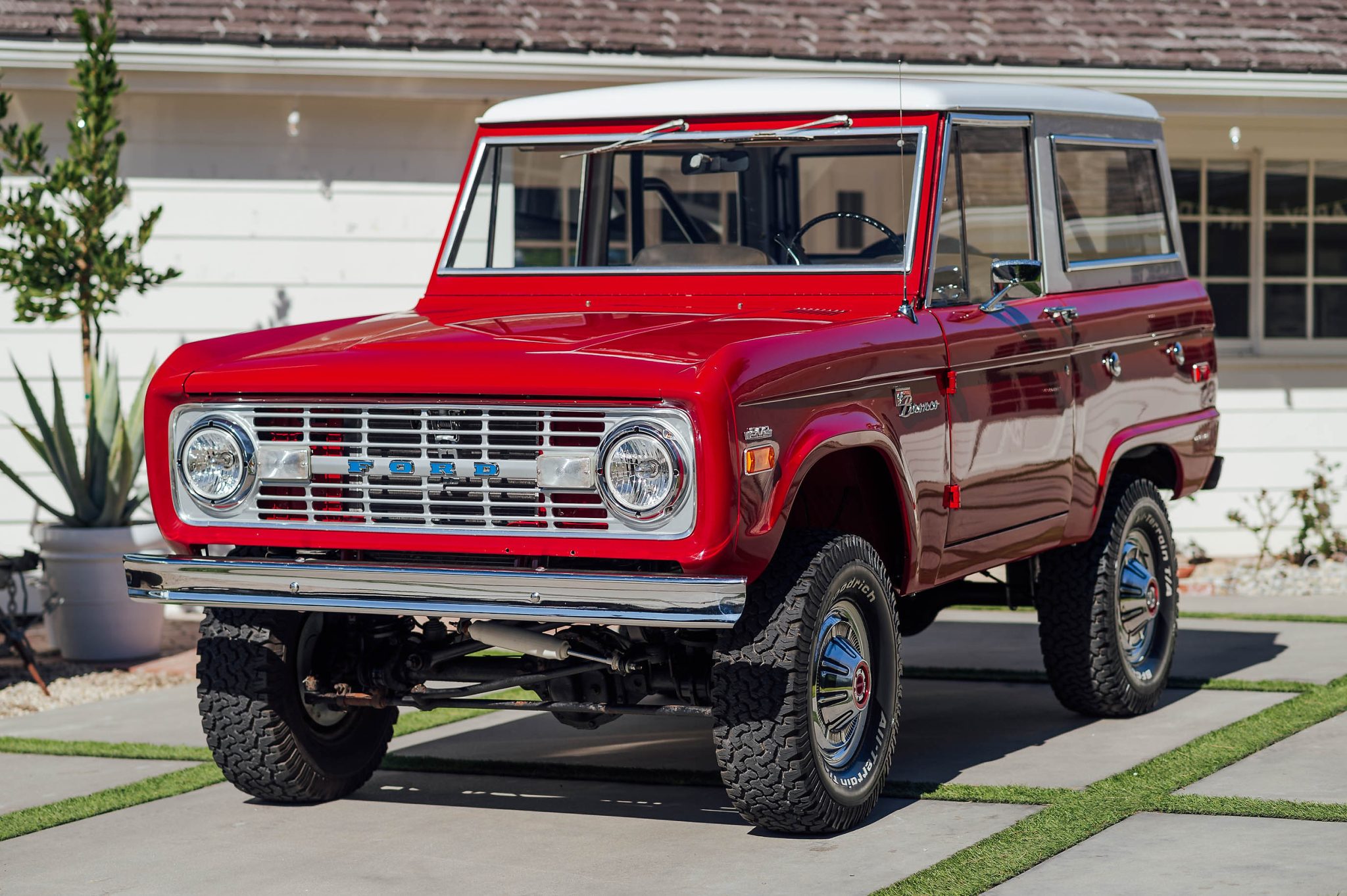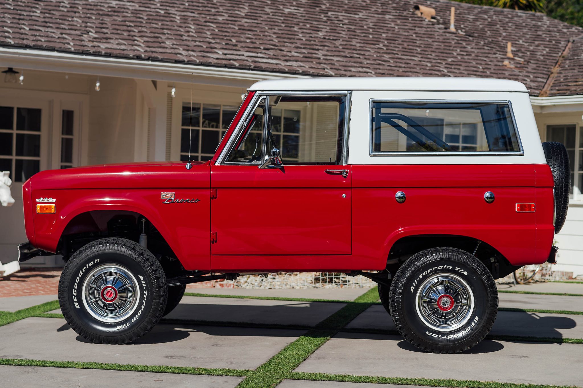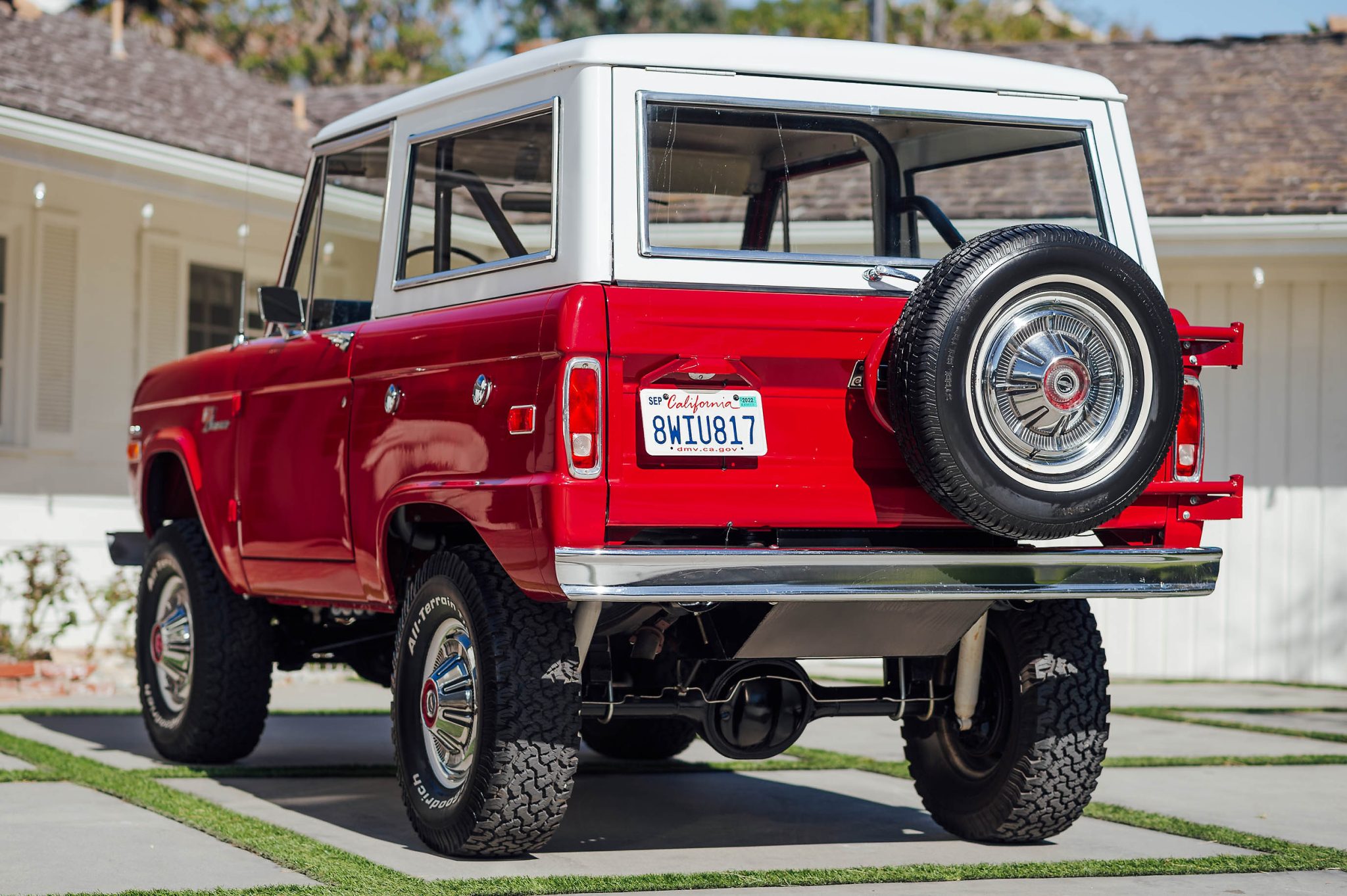 Steel 15″ wheels wear factory covers and are wrapped in 31×10.5 BFGoodrich All-Terrain T/A tires. A 295/75 whitewall spare is mounted on the swing-away rear carrier. The truck is equipped with manually locking front hubs, and modifications include a suspension lift along with aftermarket power steering and brakes.