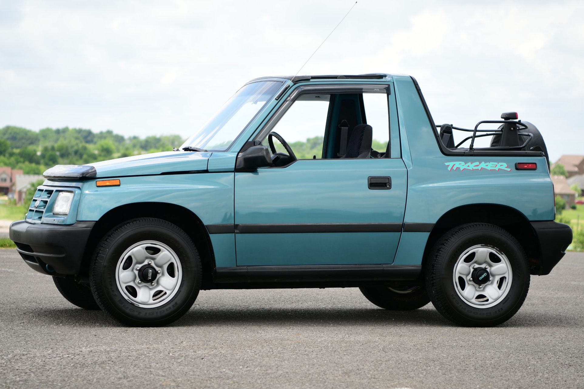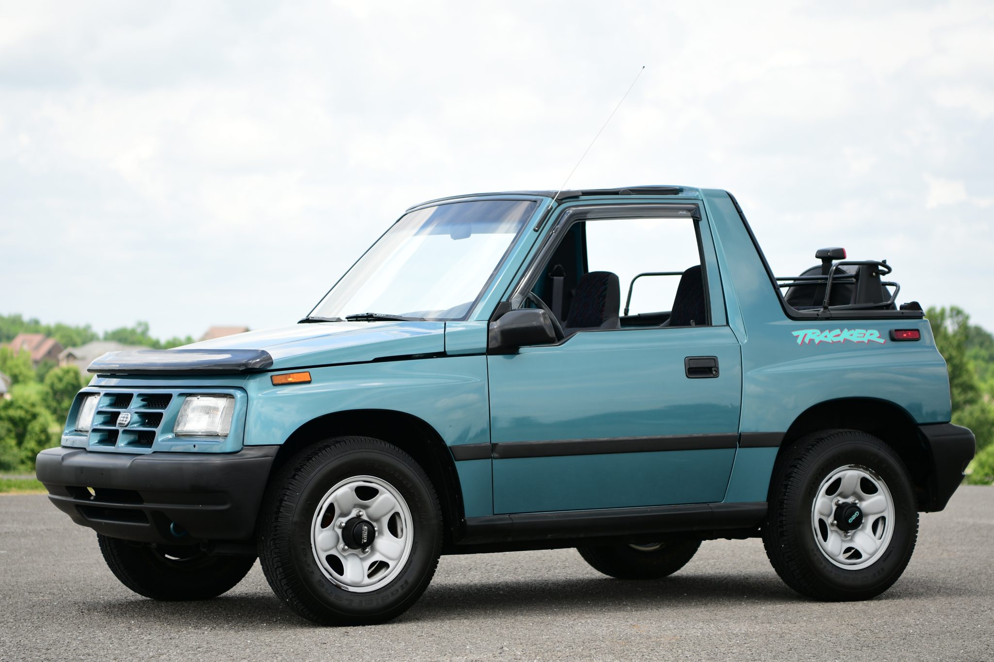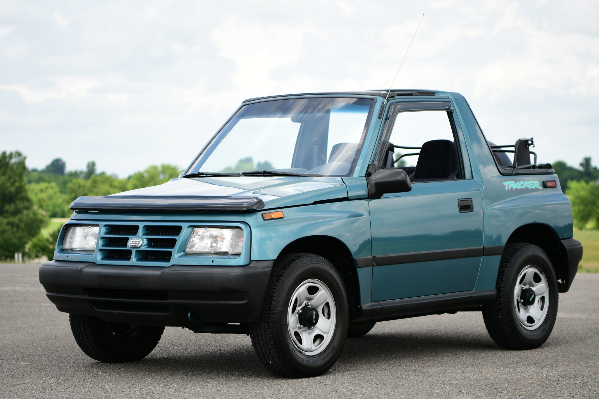 Factory 15″ wheels are mounted over automatically locking front hubs and wear 205/75 BFGoodrich Radial Long Trail T/A tires. A full-size spare wearing a Tracker-branded cover is mounted to the swing-out tailgate.