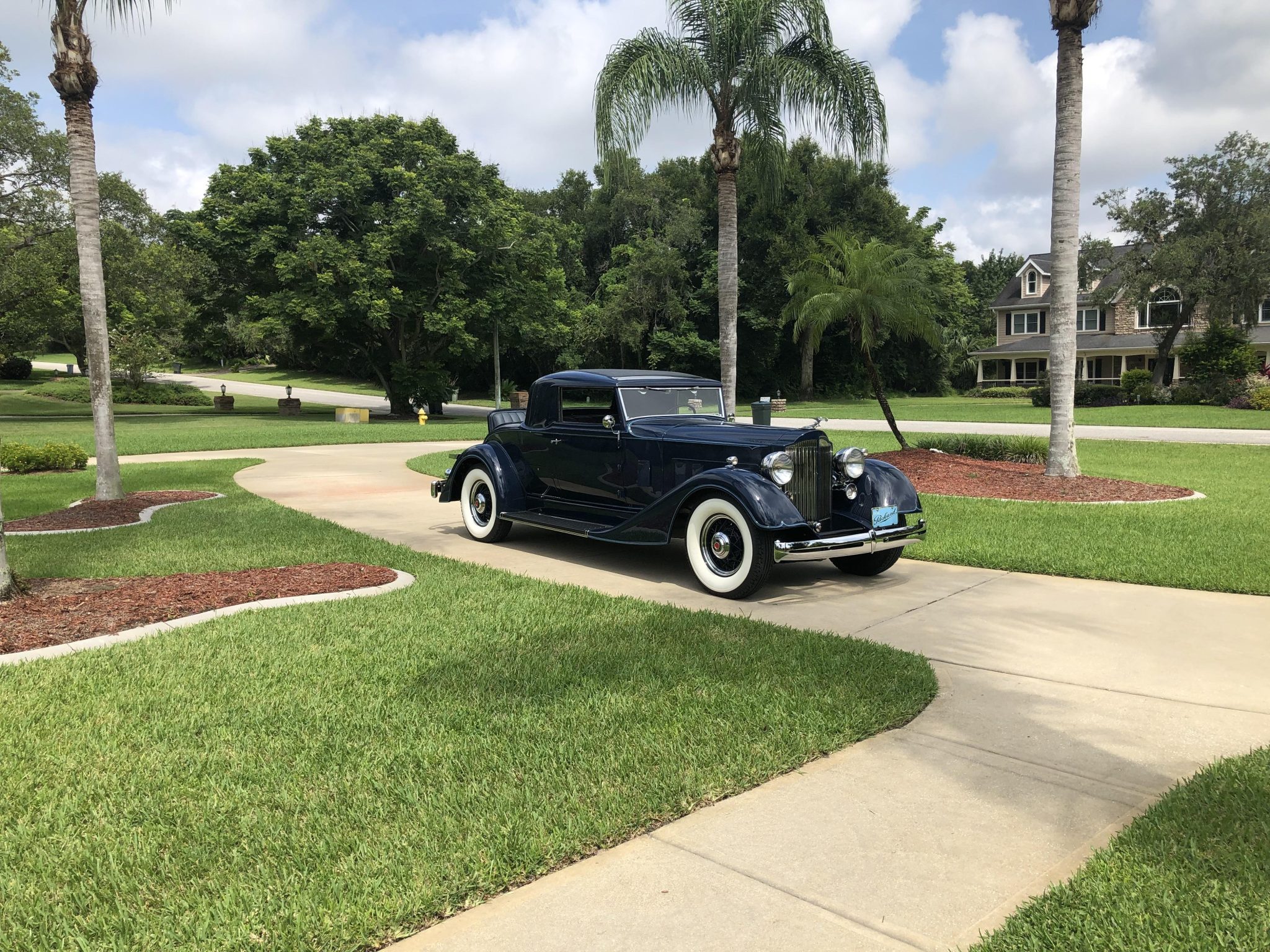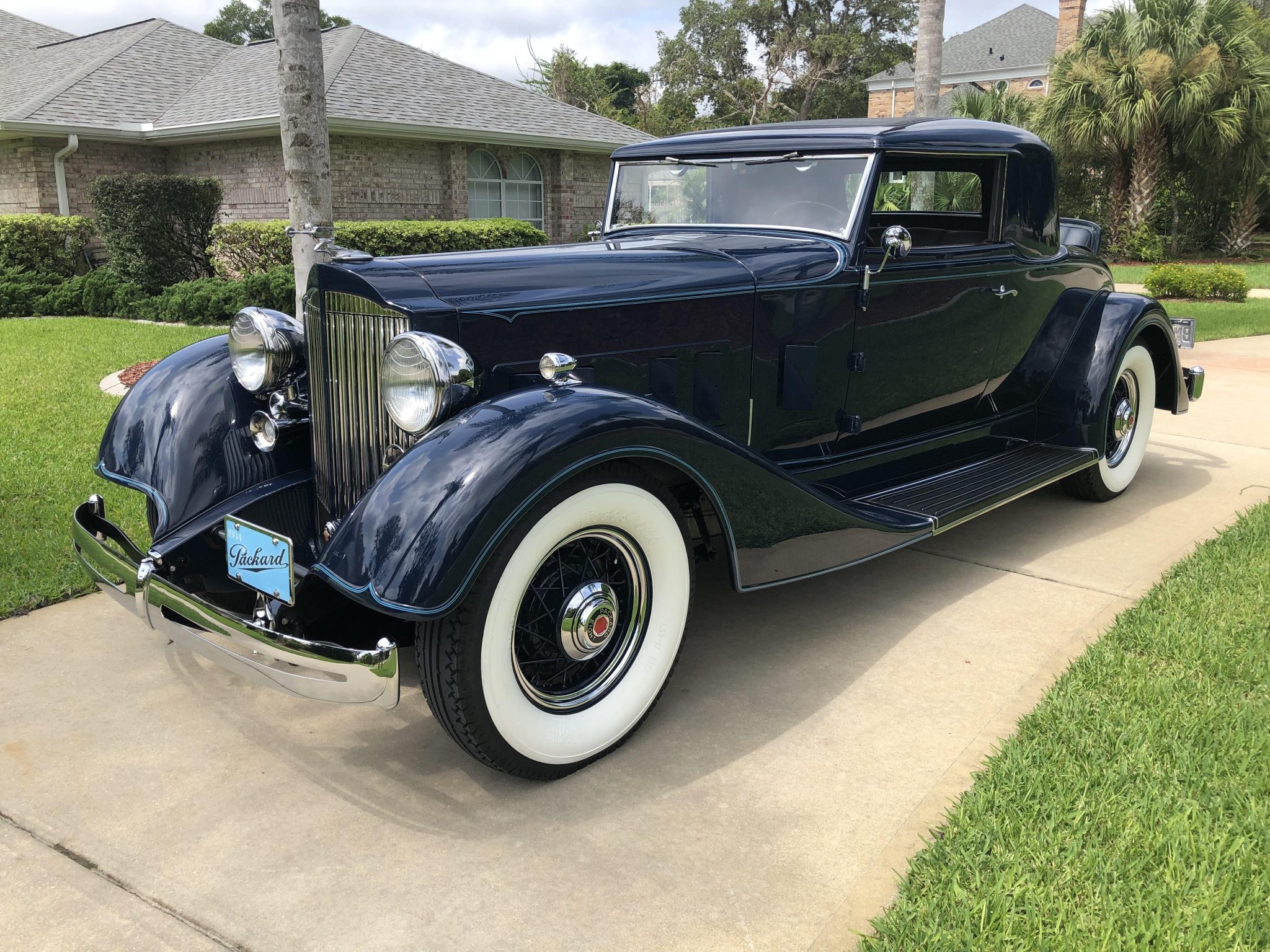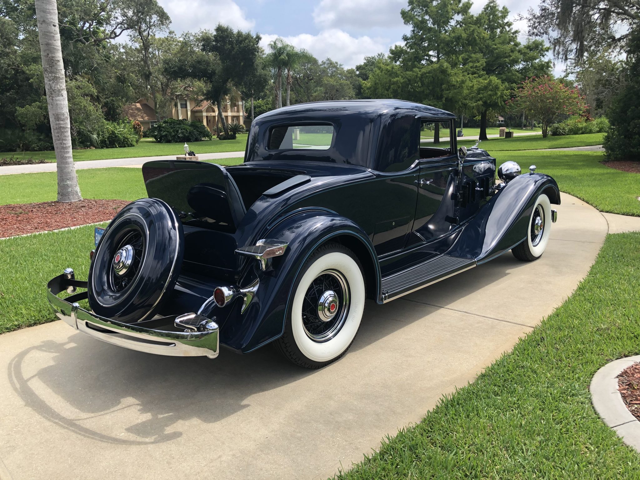 The body-color wire wheels wear Packard-branded chrome hubcaps and are mounted with Firestone bias-ply whitewall tires that were installed under the seller’s ownership. A matching spare wheel is fitted under a body-color cover out back. The model 1101 rode on a 136.25” wheelbase and featured semi-elliptical leaf springs at all four corners. Stopping power is provided by four-wheel drum brakes. New brake shoes are also said to have been installed under current ownership along with chrome trim rings on the wheels.