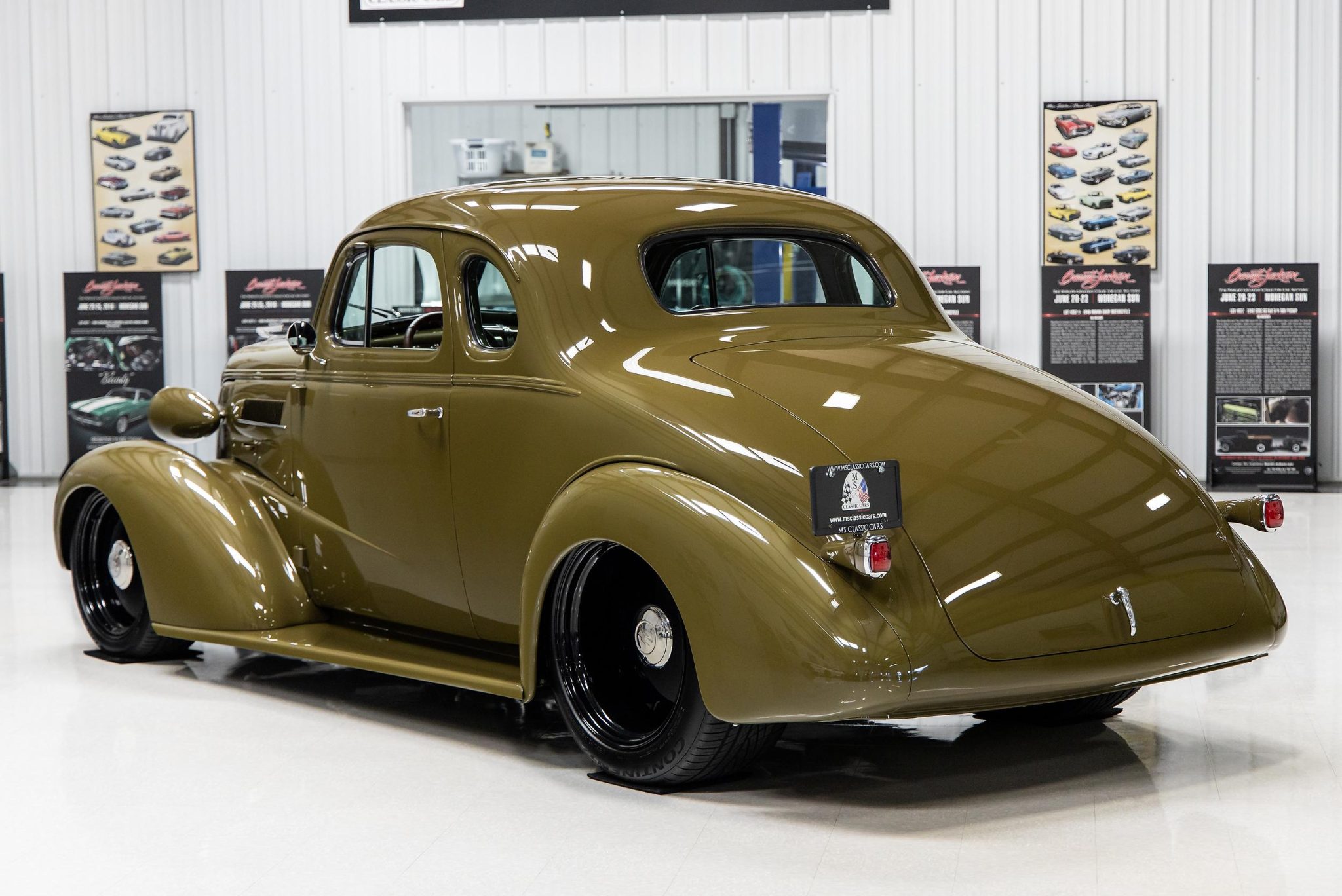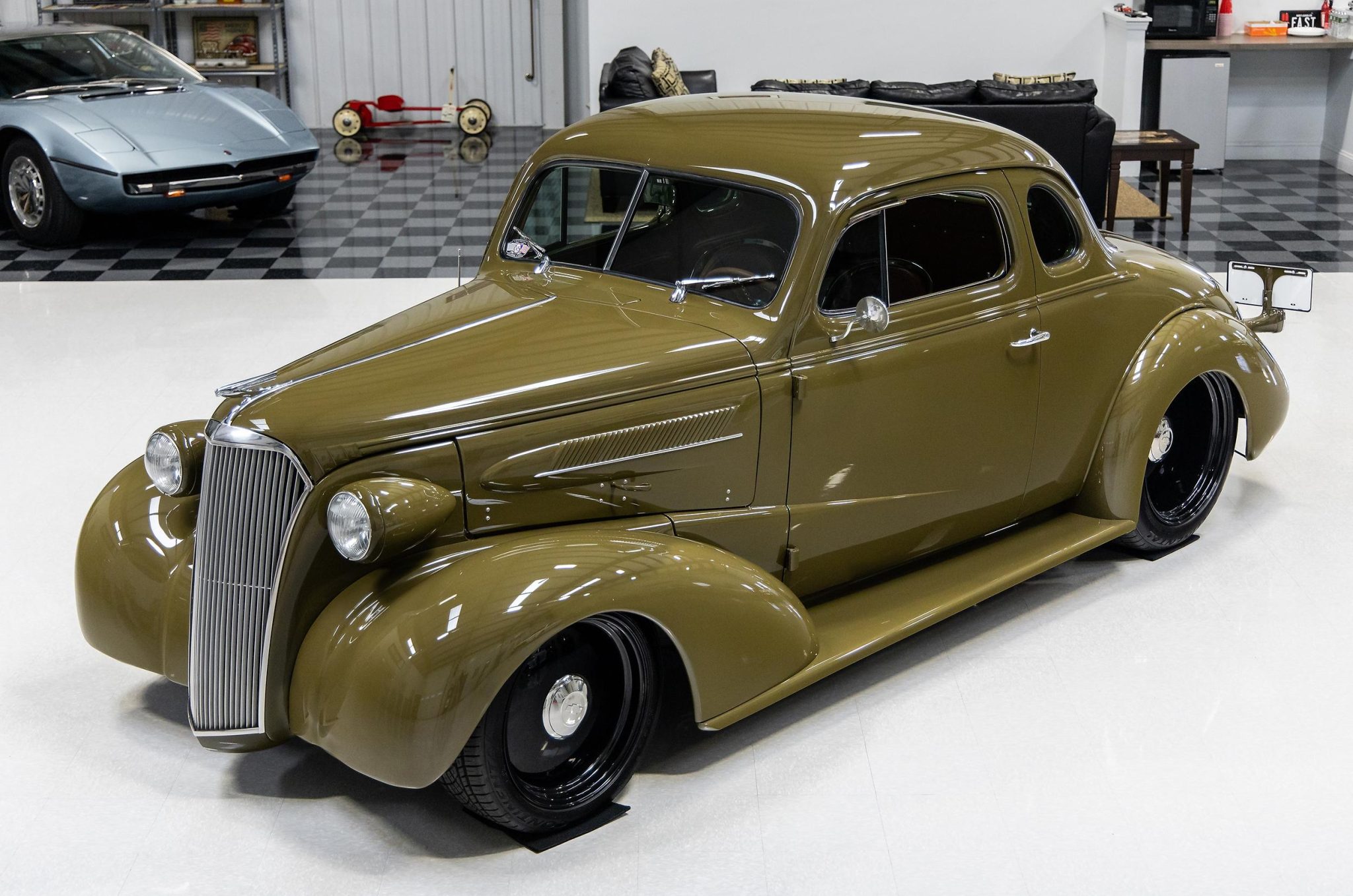 Black-finished Circle Racing alloy wheels are sized 18×8″ up front and 20×12″ in back and are wrapped in 225/45 and 295/45 Continental Extreme Contact tires. The Street Rod Garage chassis features independent front suspension, power rack and pinion steering, a four-link rear suspension, Strange Engineering coilover shocks, stainless steel brake lines, and Wilwood Dynalite four-wheel disc brakes with slotted and drilled rotors. Service in 2022 included adjusting the front ride height and replacing the front brake master cylinder and lug nuts.