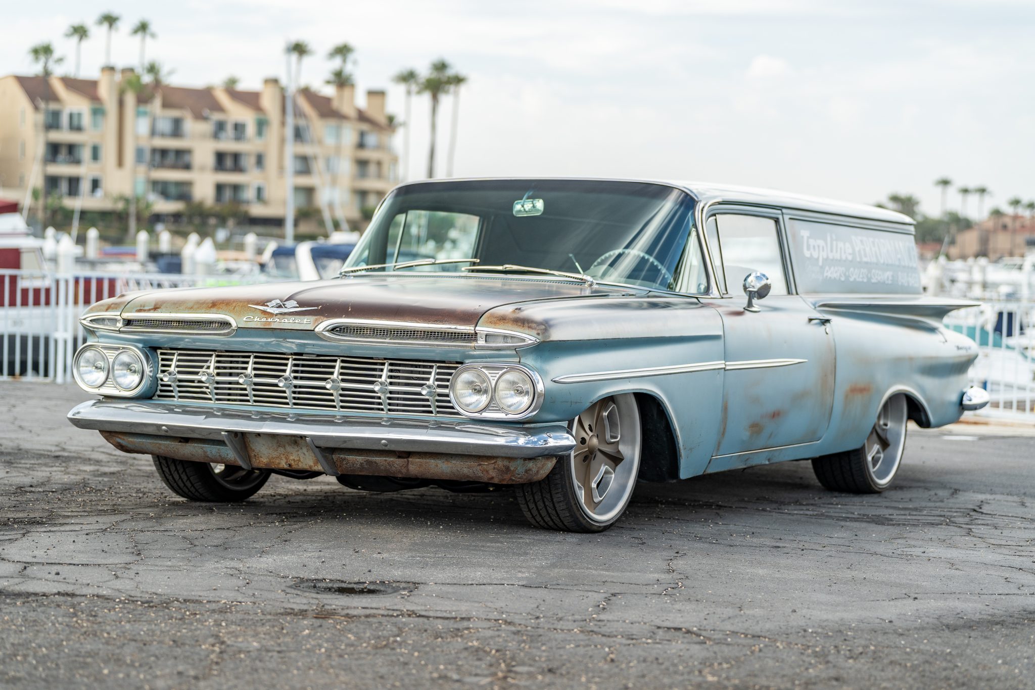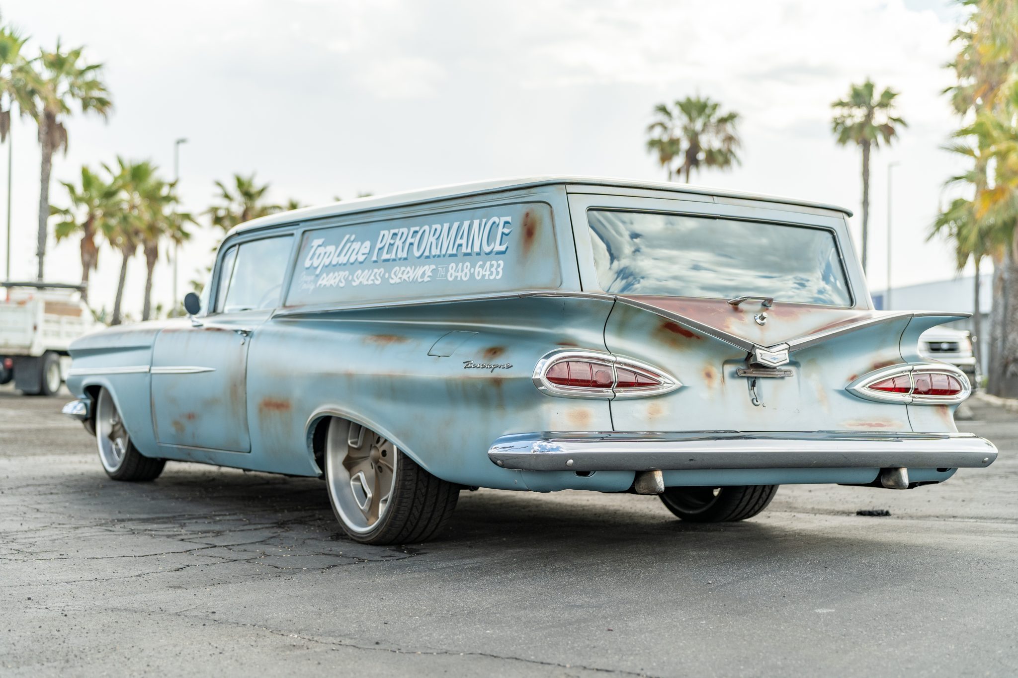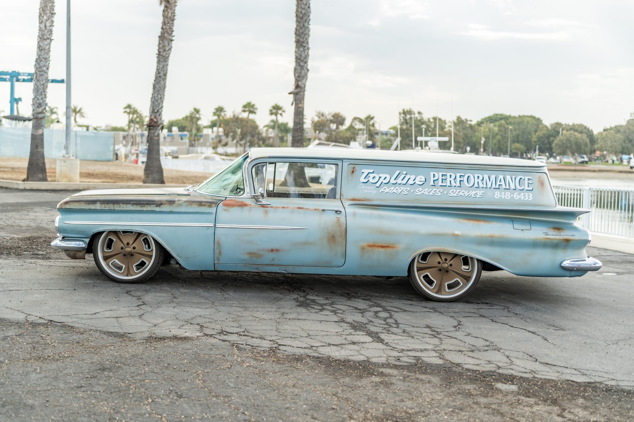 Gold-finished 20″ front and 22″ rear HRBB wheels are wrapped in Lexani tires. Suspension components include tubular front control arms and coil springs, and braking is provided by front and rear discs sourced from Classic Performance Products.