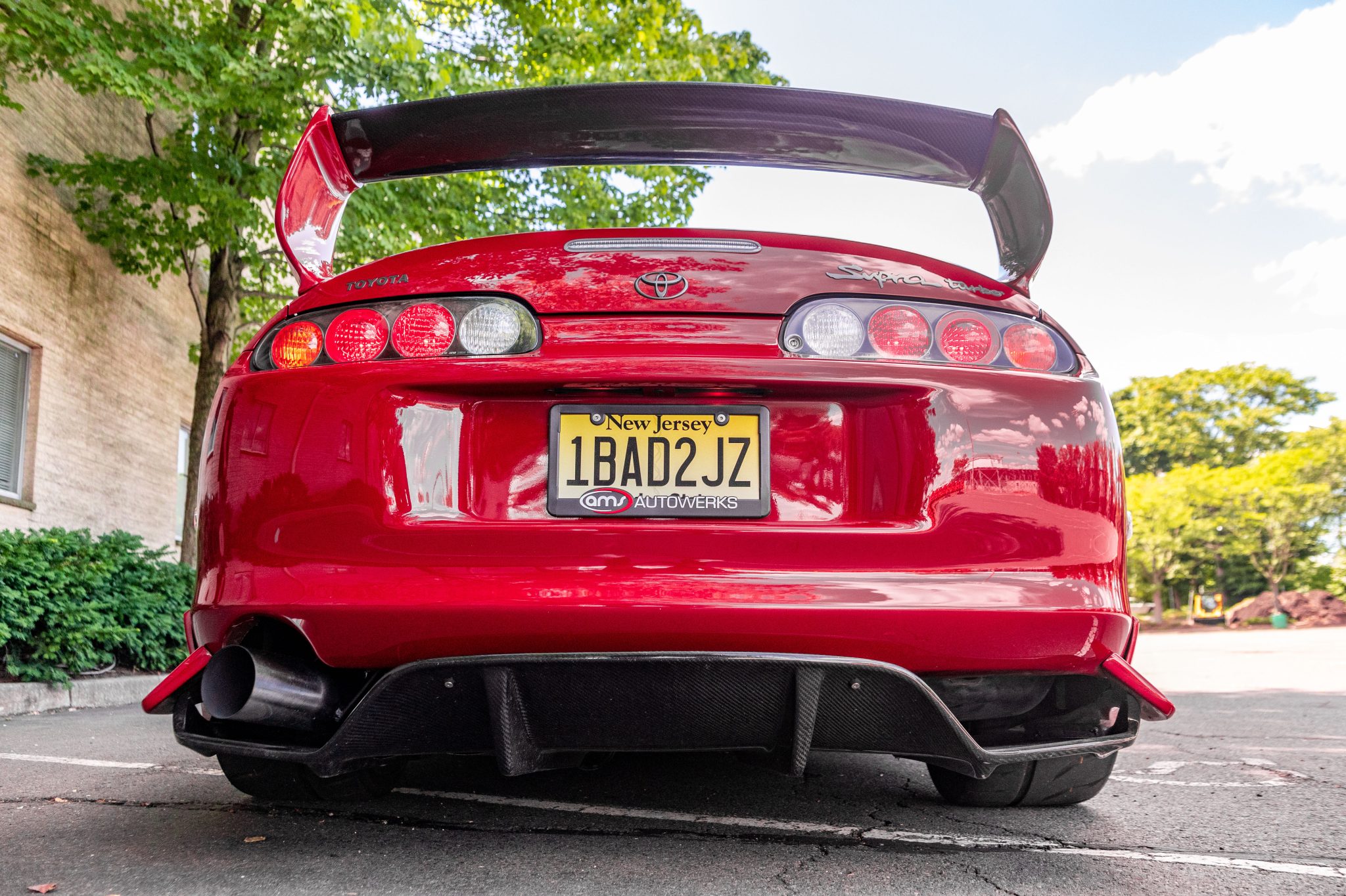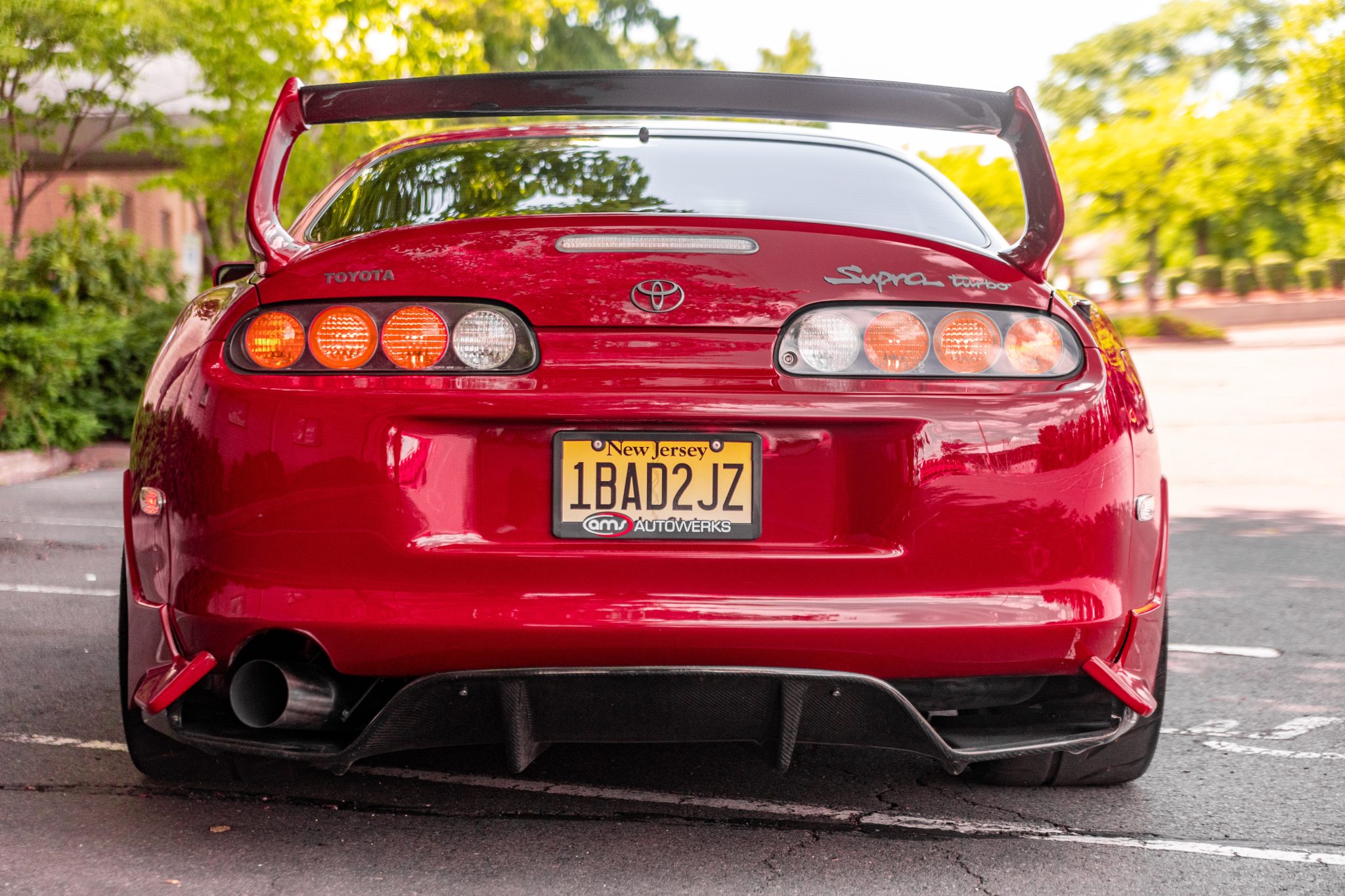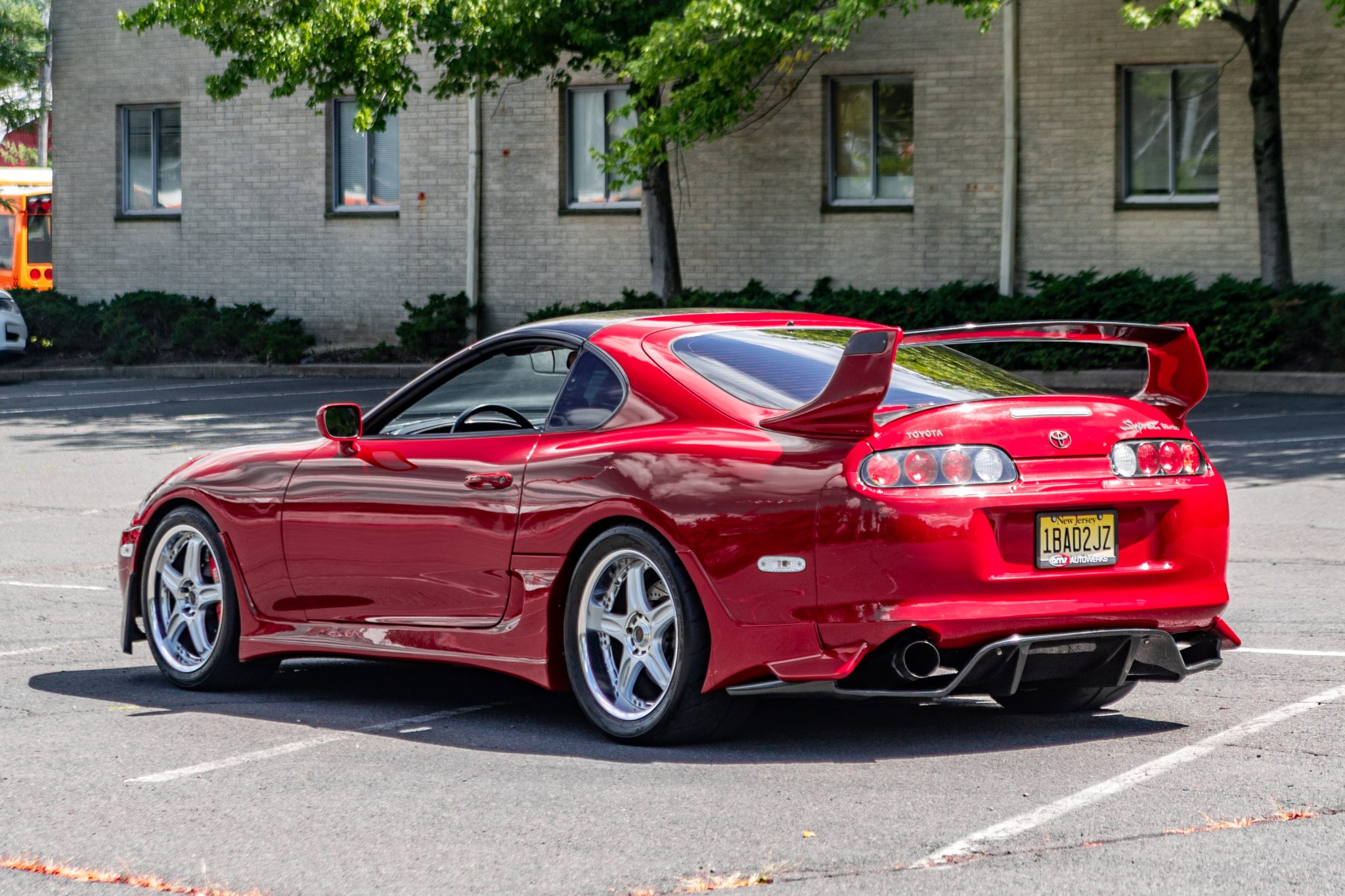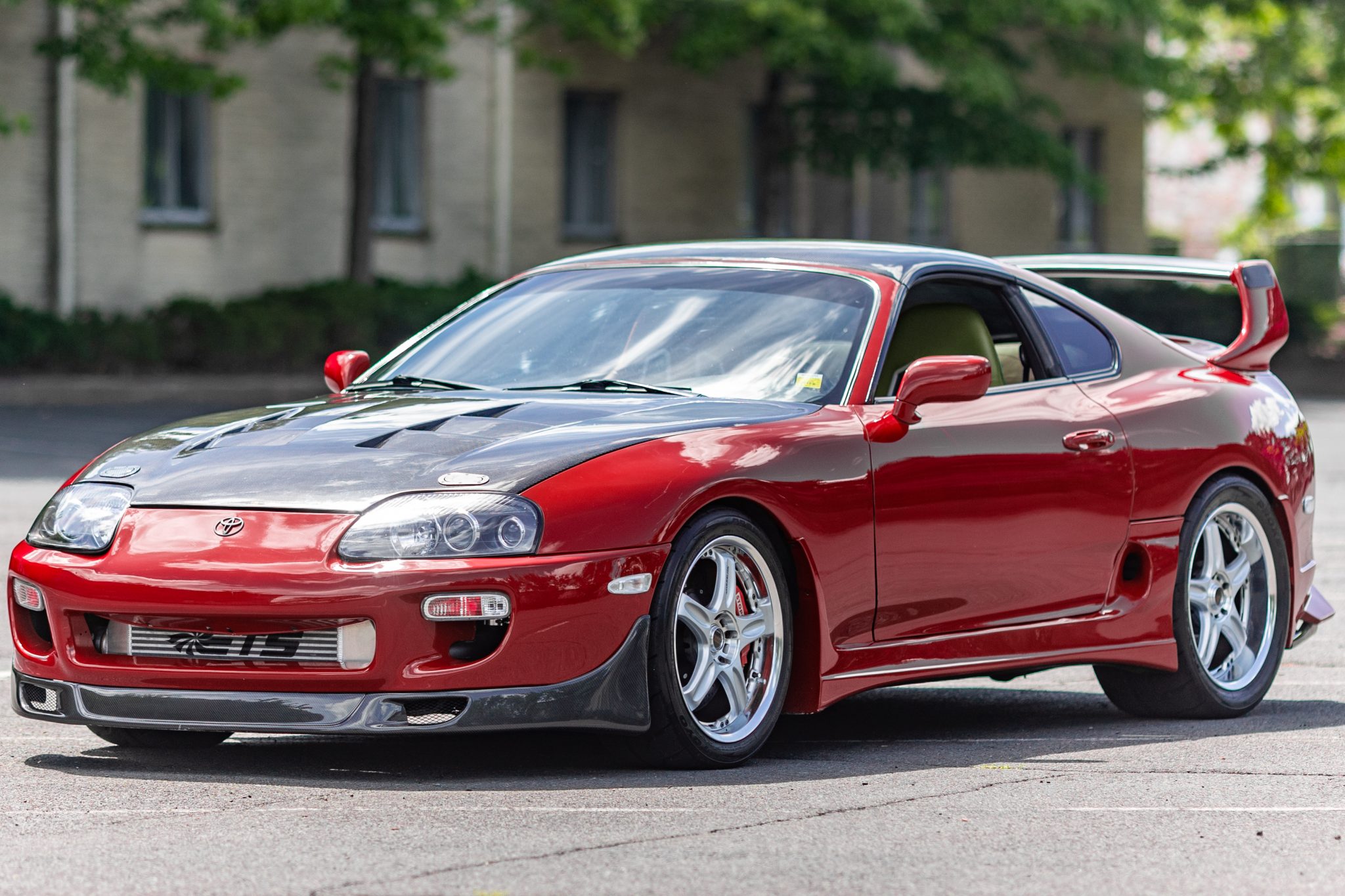 Volk Racing 18″ alloy wheels are wrapped in 245/40 front and 305/35 rear Toyo Proxes R888R tires. The suspension has been modified with HKS HIPERMAX S coilovers and adjustable shocks, and braking is provided by red StopTech brake calipers over cross-drilled rotors in the front and silver Supra-branded calipers over cross-drilled and slotted rotors in the rear.