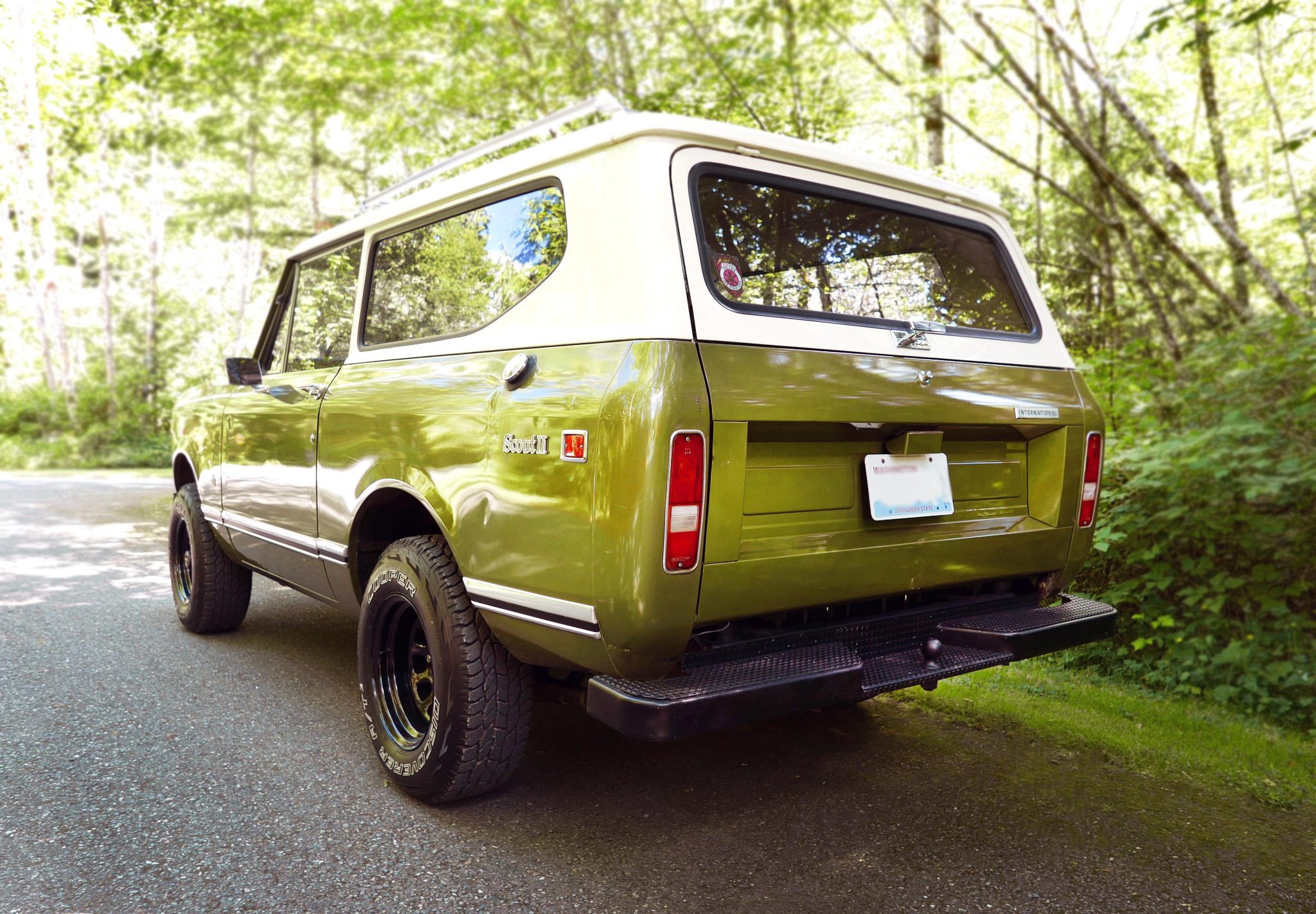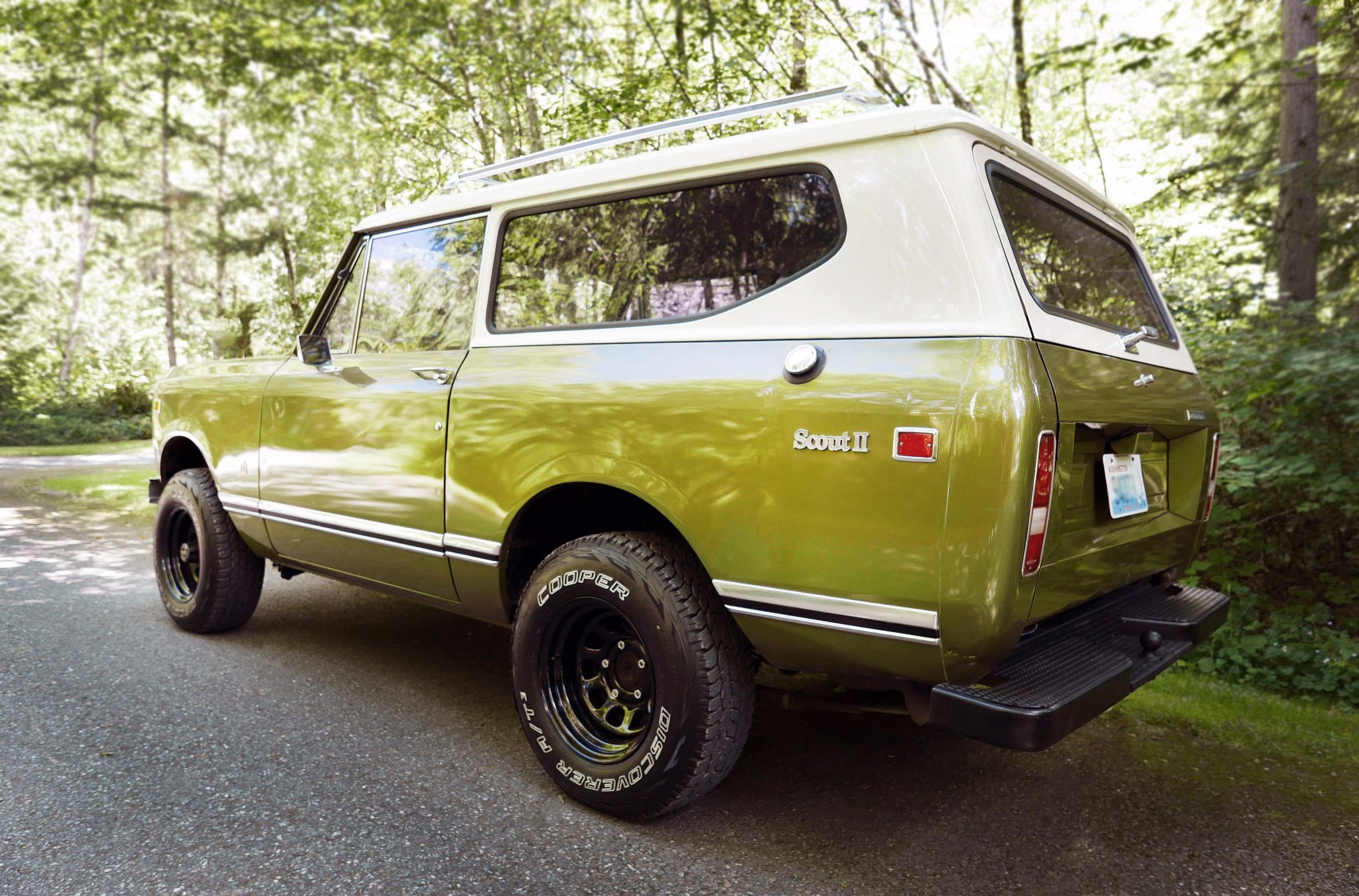 Black steel 15″ wheels are mounted with 235/75 Cooper Discoverer A/T tires that show 2014 date codes. The truck features locking front hubs, and a lift kit has been installed. The front brakes were converted to discs during the 2018 refurbishment and are joined by drums at the rear.