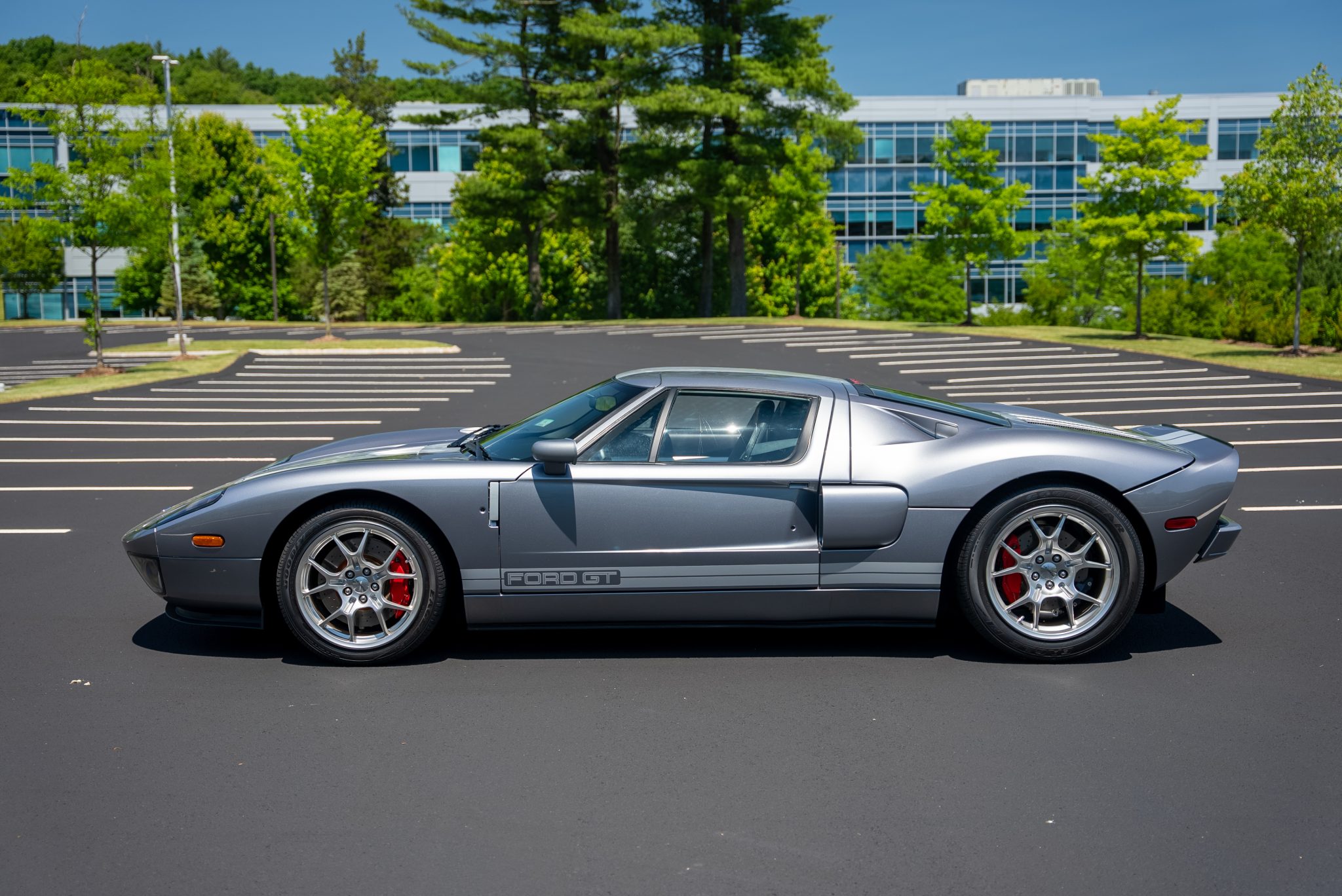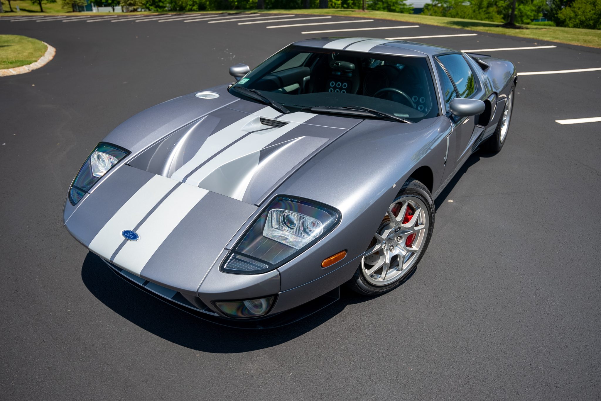 Factory-optional BBS forged alloy wheels measure 18” in diameter up front and 19” out back and are mounted with Goodyear Eagle F1 Supercar tires measuring 235/45 and 315/40, respectively. The Brembo braking system features optional red-painted four-piston monoblock calipers with cross-drilled and ventilated rotors that measure 14” up front and 13.2” out back.