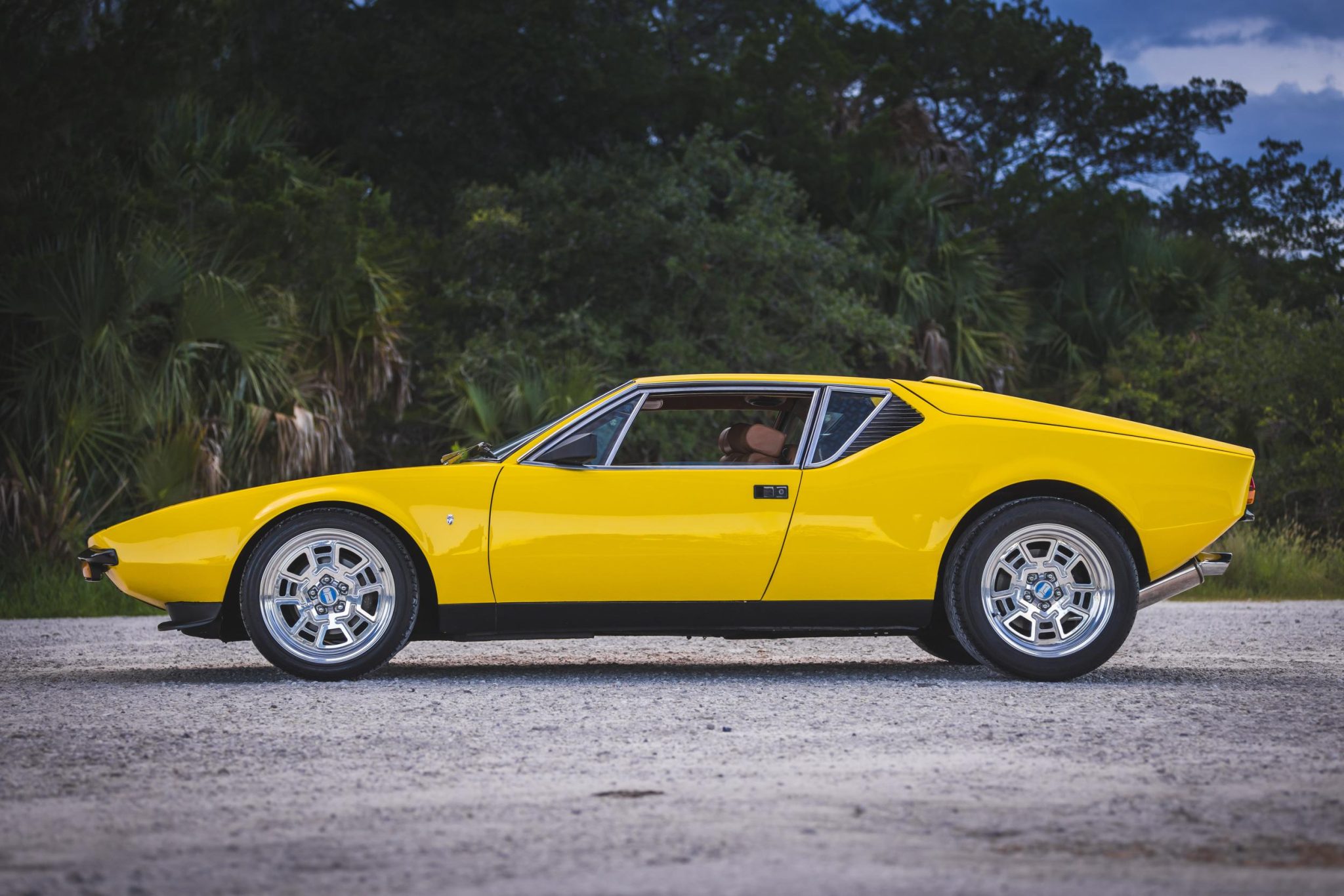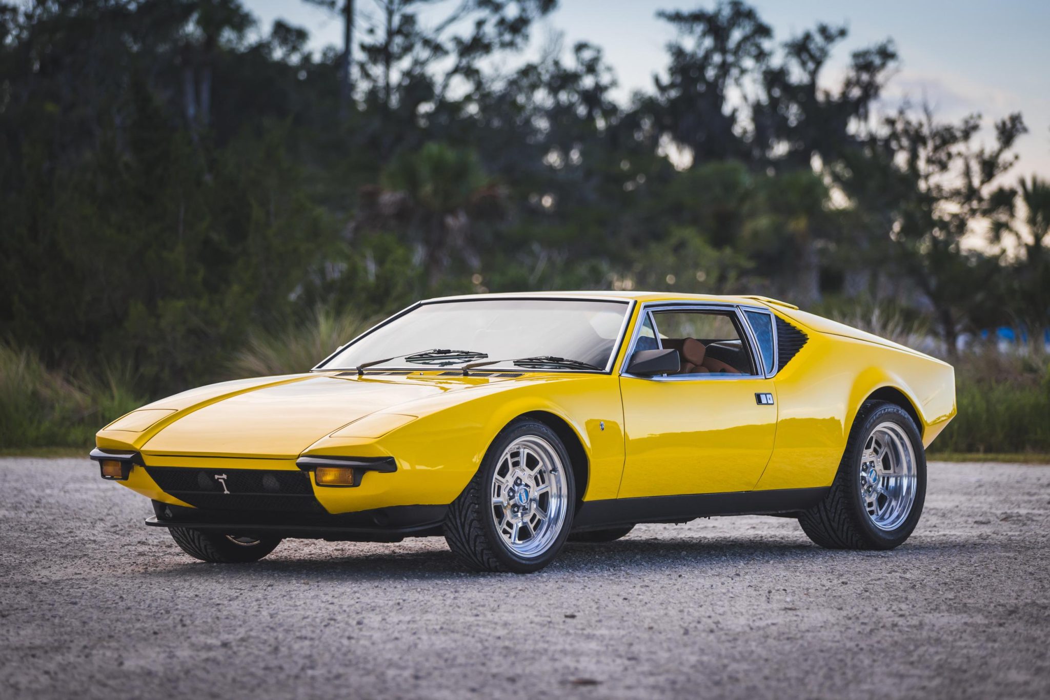 Staggered-width 17″ Campagnolo-style alloy wheels wear DeTomaso-logo center caps and are mounted with 235/40 front and 335/35 rear Michelin Pilot Sport tires. Stopping power is provided by power-assisted four-wheel disc brakes.