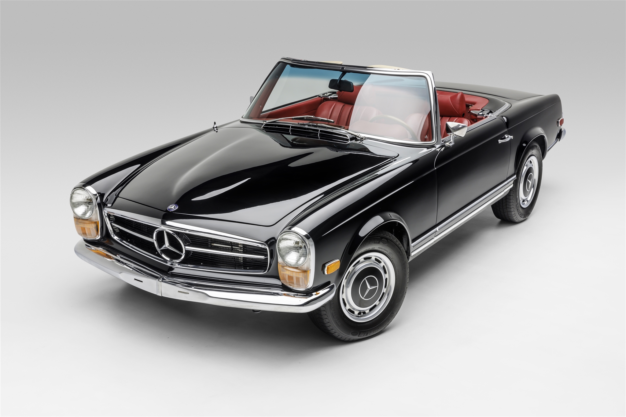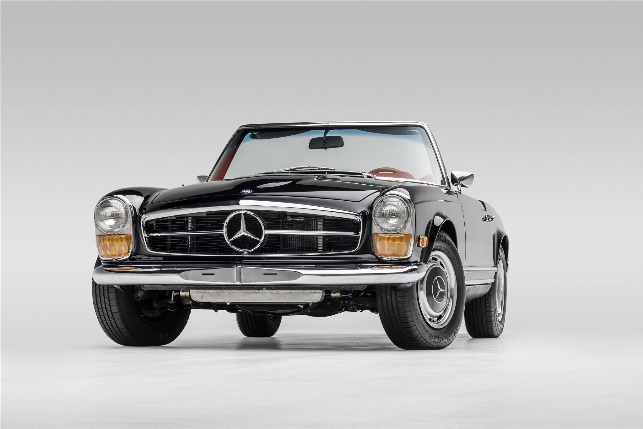 Steel 14″ wheels feature single-piece covers with chrome surrounds and body-color centers and wear 205/70 Michelin Defender tires. A revised front suspension setup has been installed to accommodate the custom subframe, and braking is provided by power-assisted four-wheel discs.
