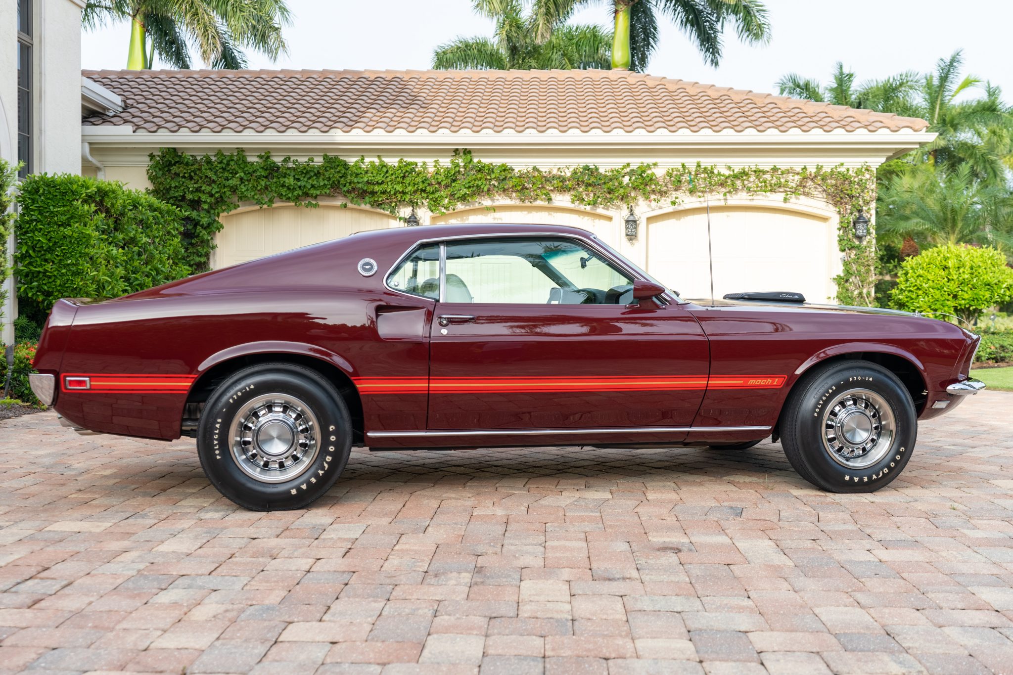 Styled 14″ steel wheels are mounted with F70-14 Goodyear Polyglas tires. Mach 1 models were equipped from the factory with Handling Suspension, and braking is managed by power-assisted front discs and rear drums.