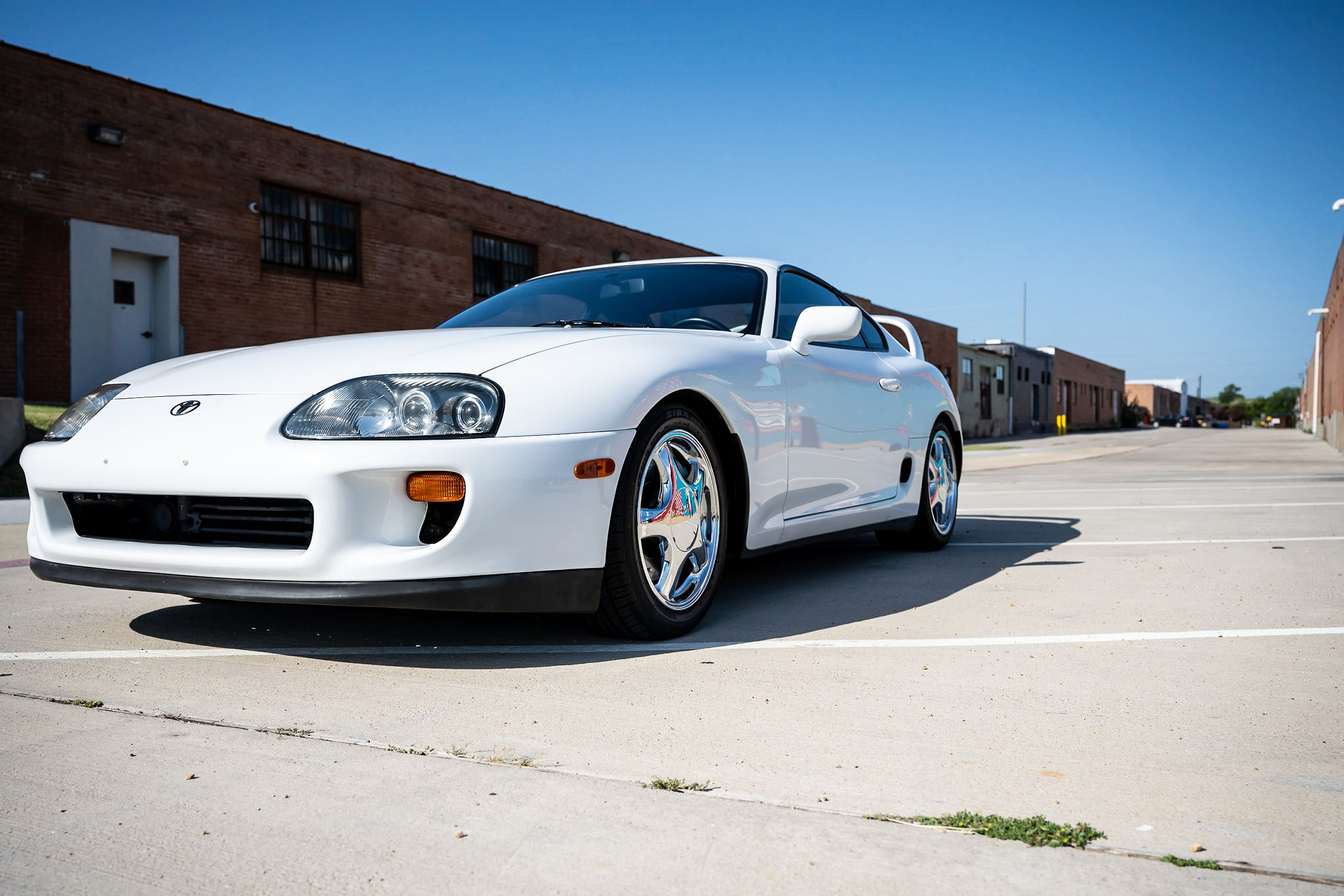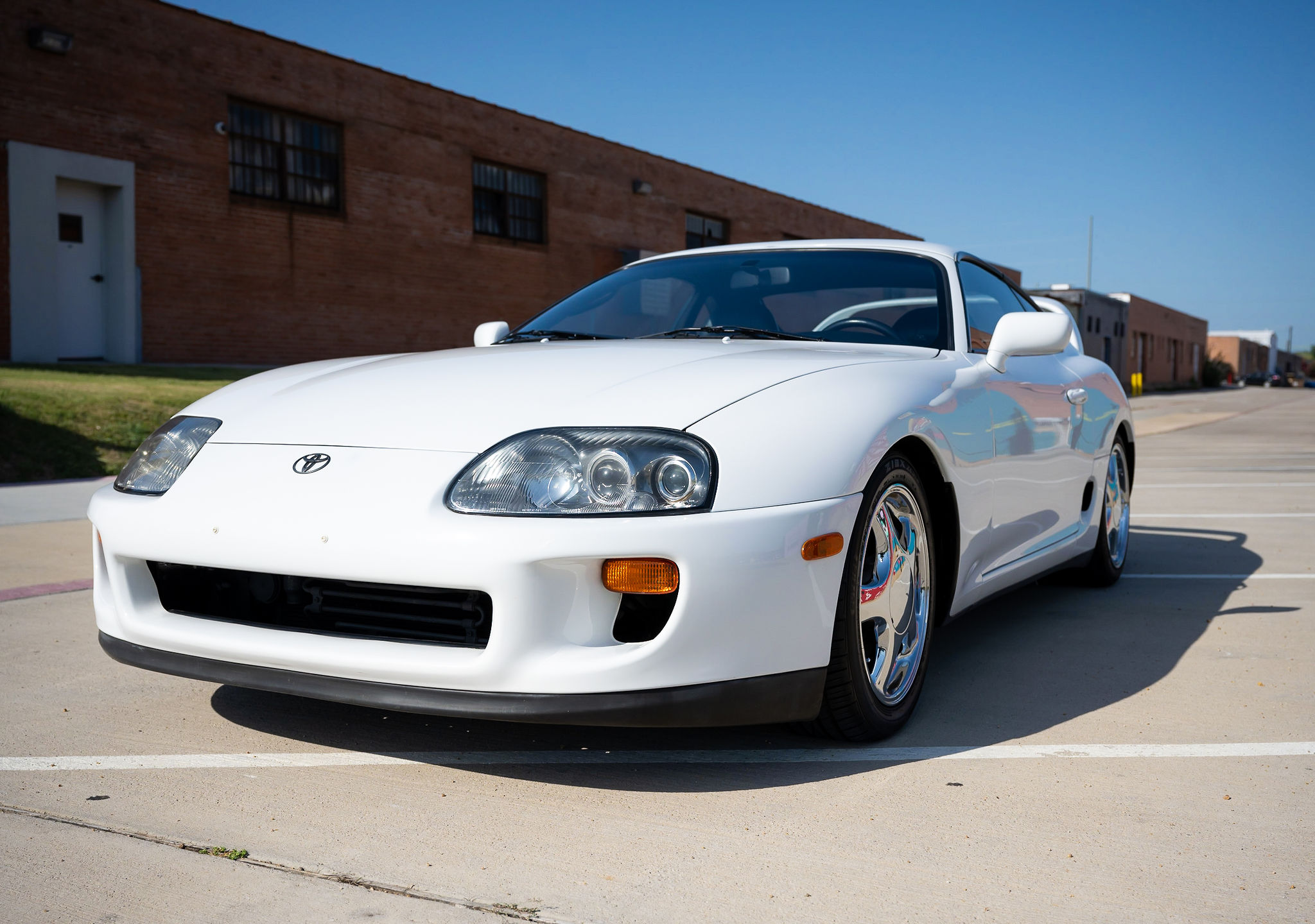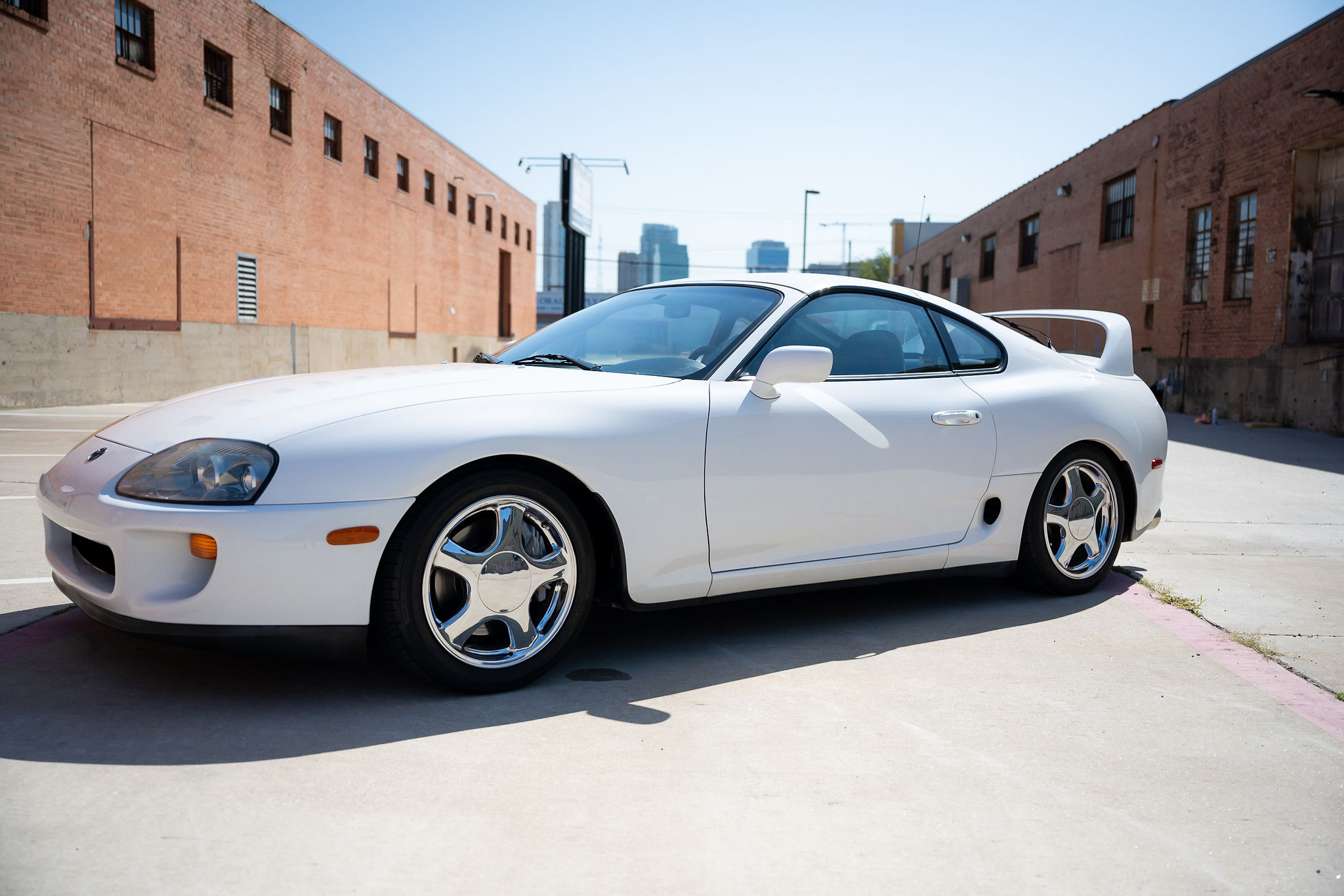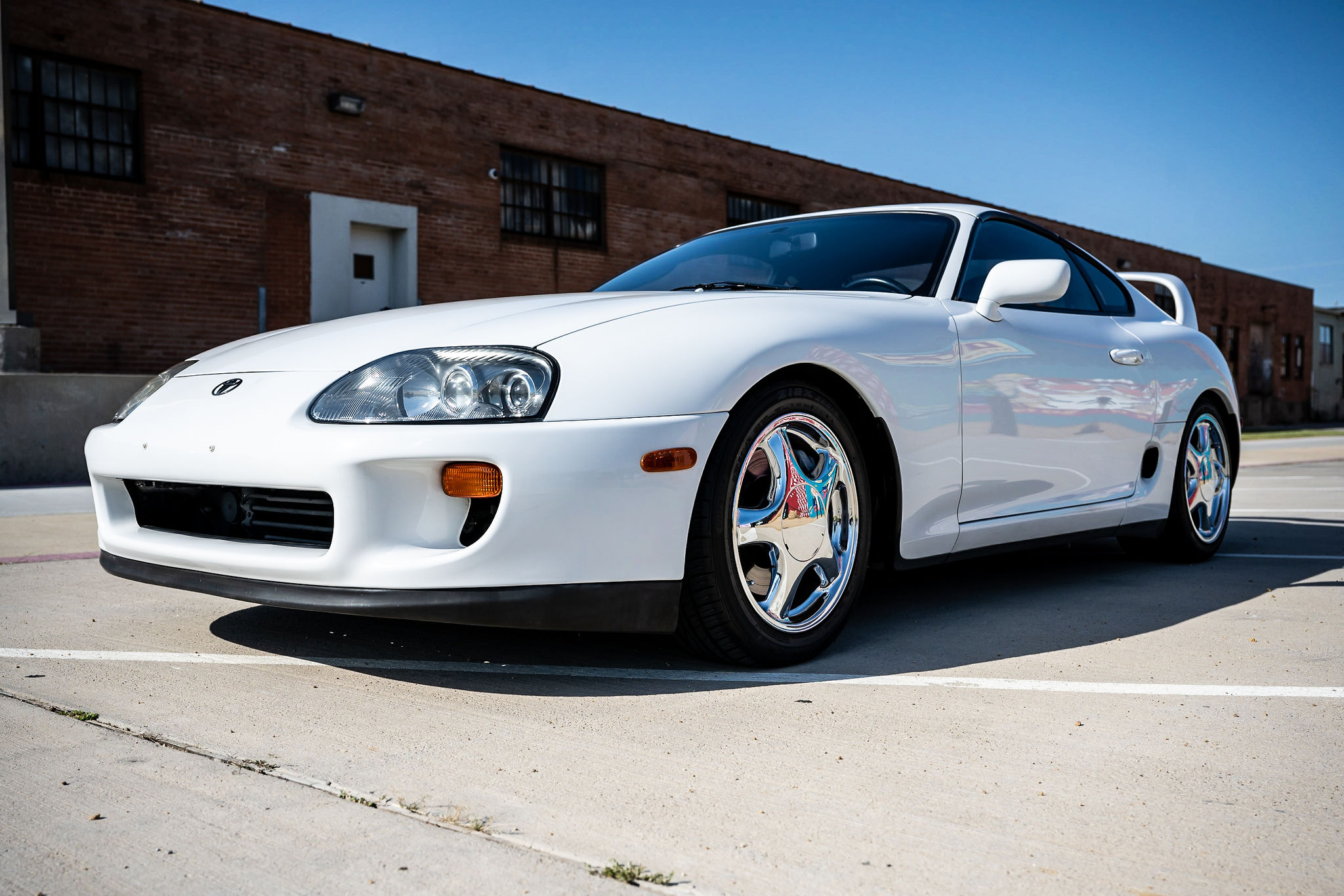 Chrome-finished 17″ alloy wheels are mounted with 235/45 front and 255/40 rear Falken Ziex ZE912 tires. The car is equipped with traction control, and HKS adjustable coilovers were installed during current ownership. Stopping power is provided by Supra-branded calipers over vented discs at all four corners.
