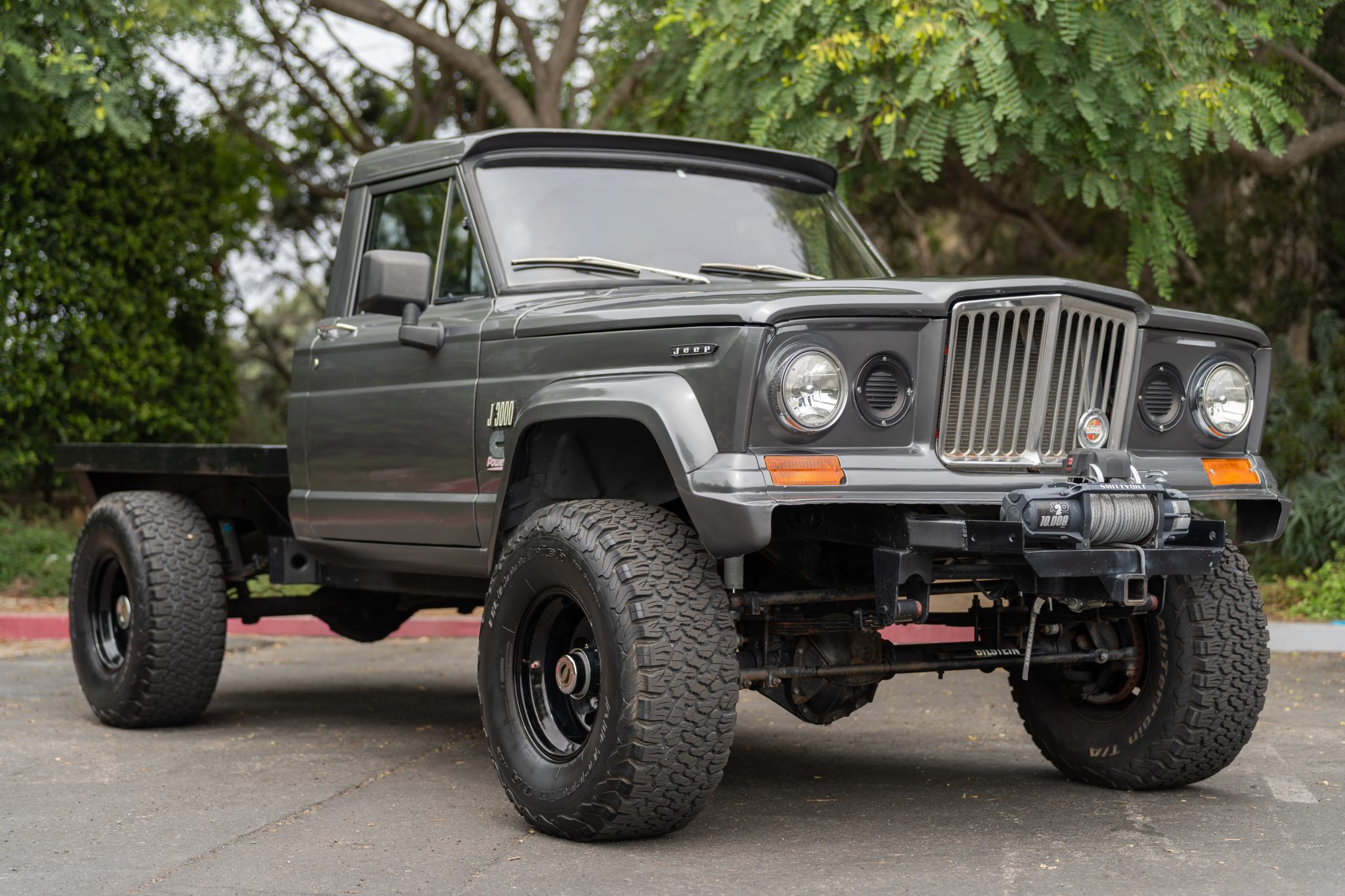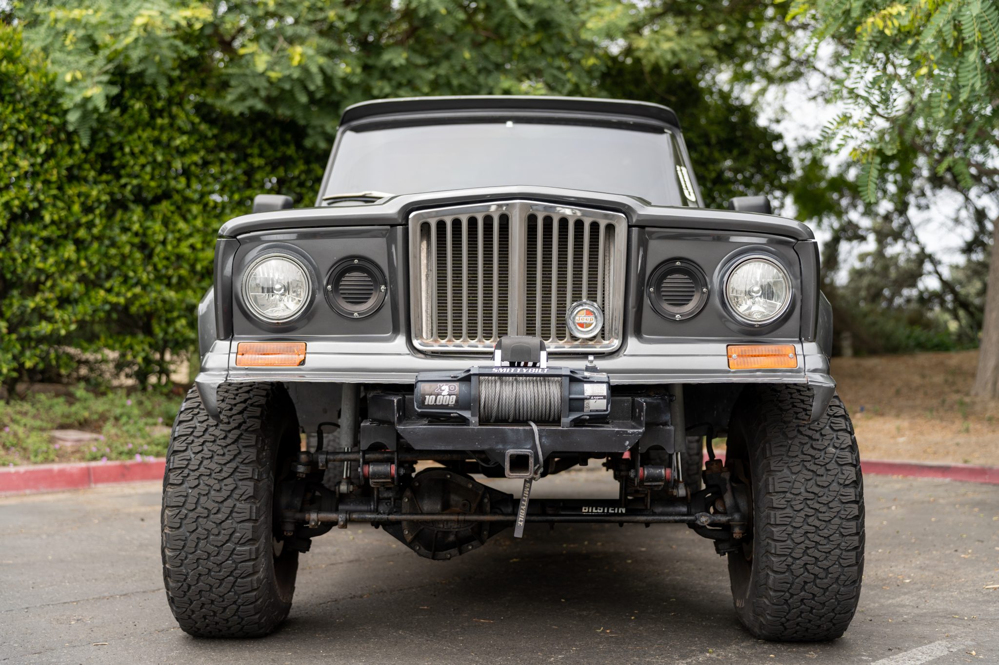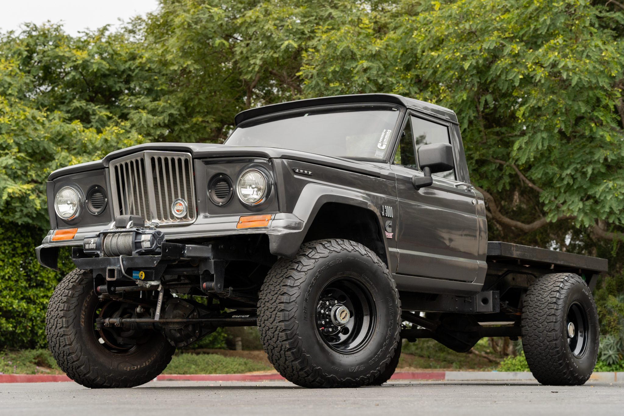 Black-finished Pro Comp 16″ eight-hole wheels are mounted with 315/75 BFGoodrich All-Terrain T/A KO2 tires. Equipment includes a hydroboost four-wheel disc-braking system, Bilstein shocks, and locking front hubs. The rear disc brakes were replaced in 2020.