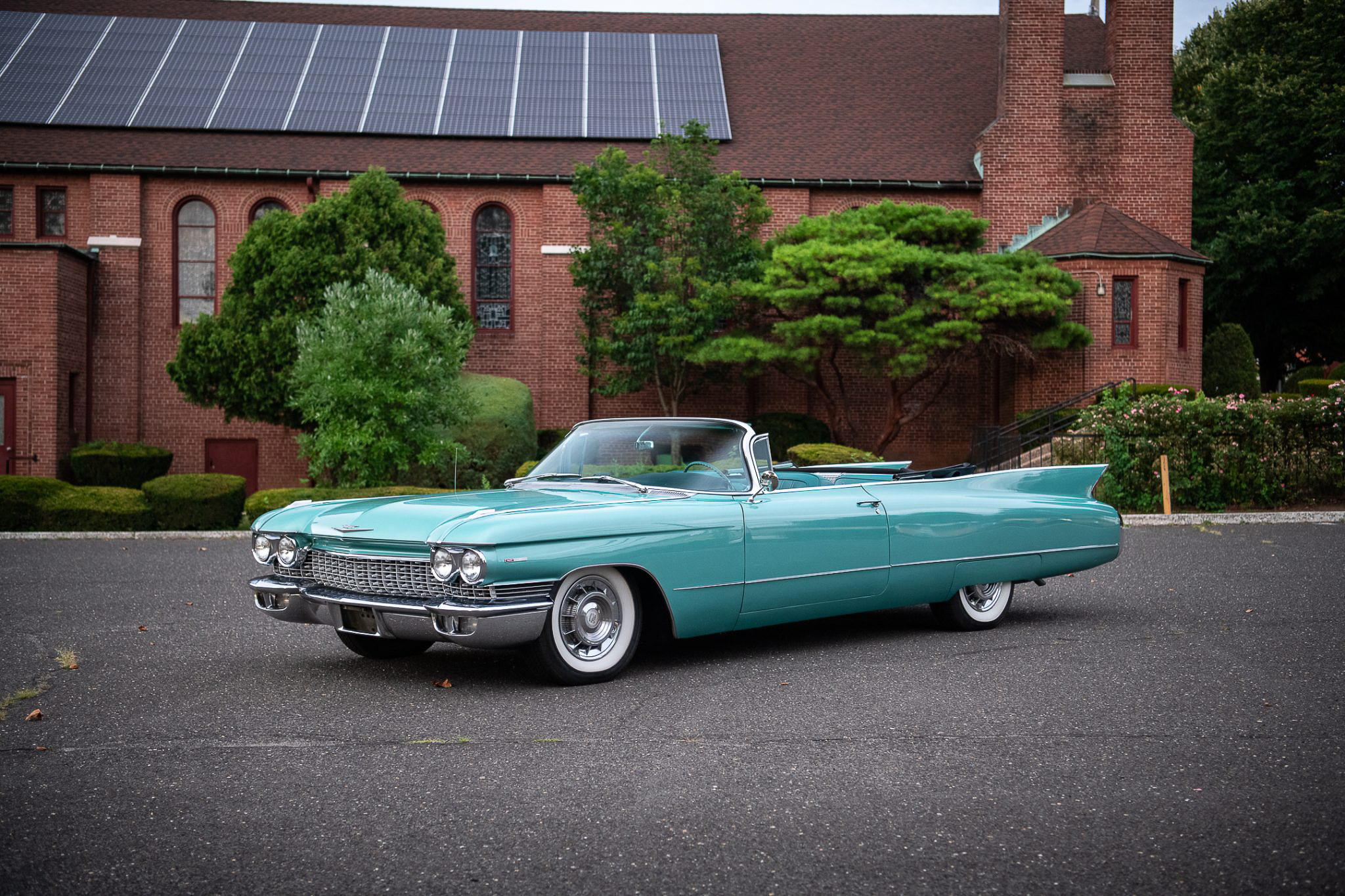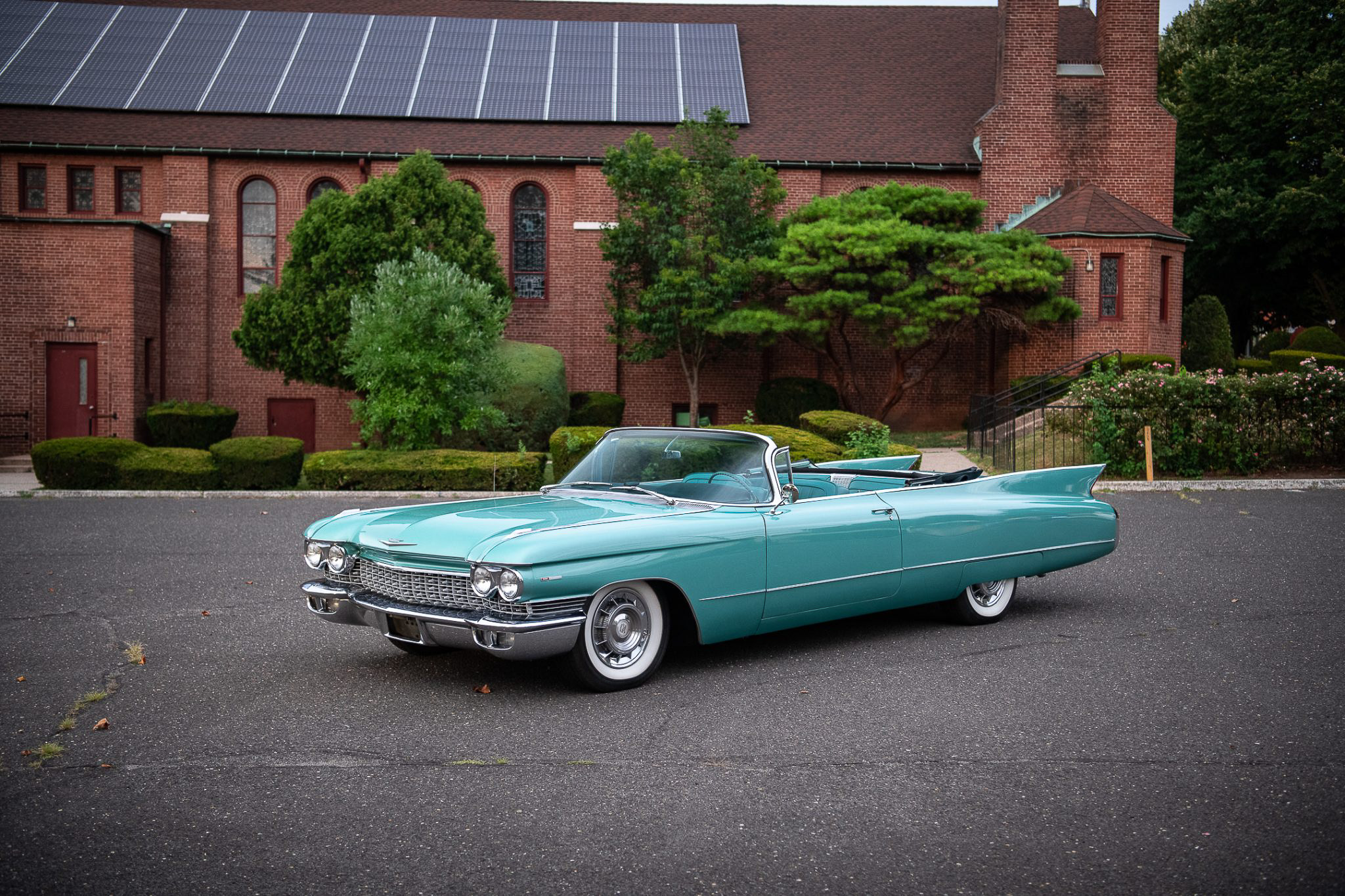 The steel wheels wear Cadillac-crest covers and wide-whitewall tires. The brake system is vacuum-assisted and makes use of a dual-reservoir master cylinder, and the car is also equipped with power-assisted steering.