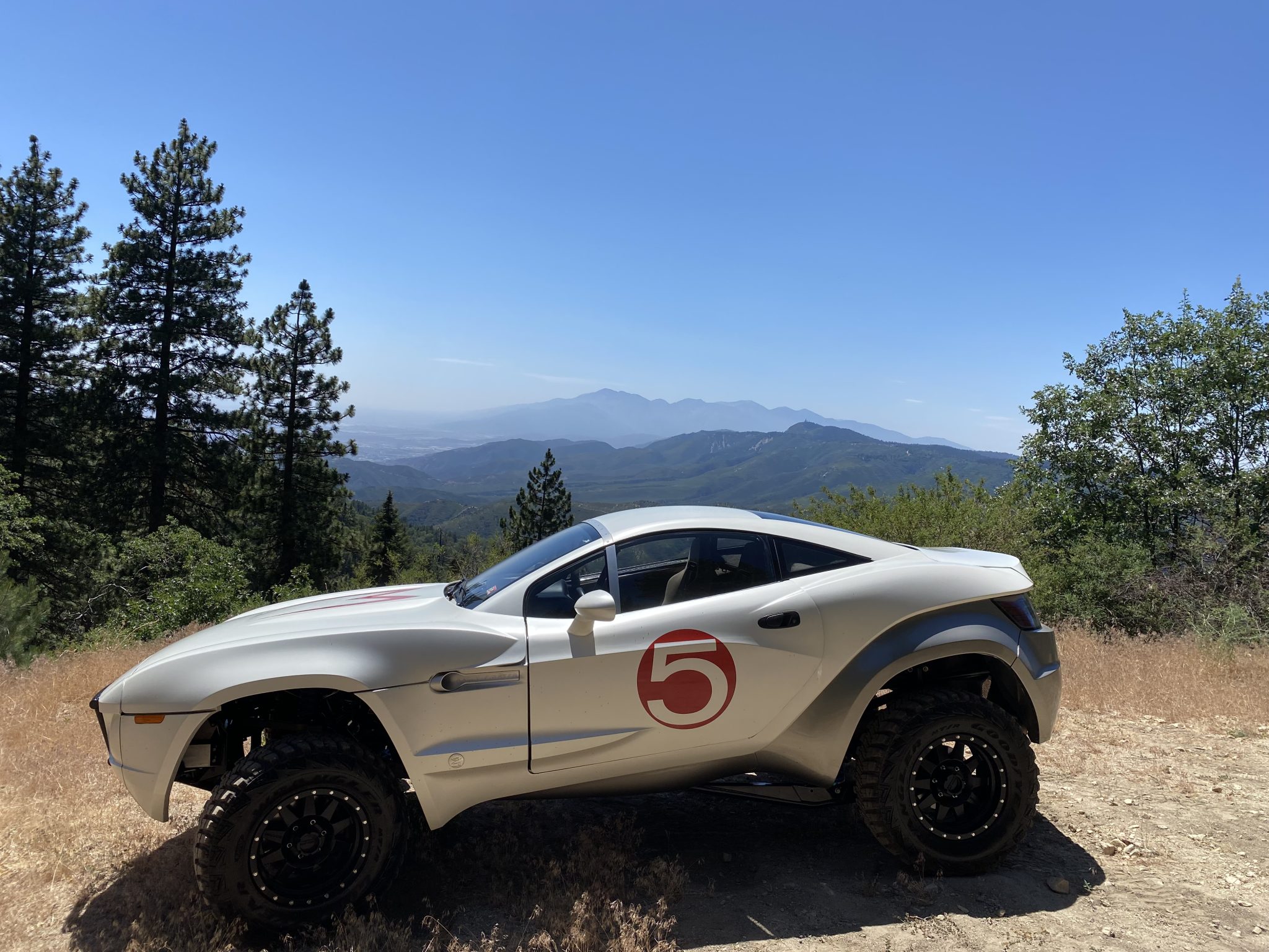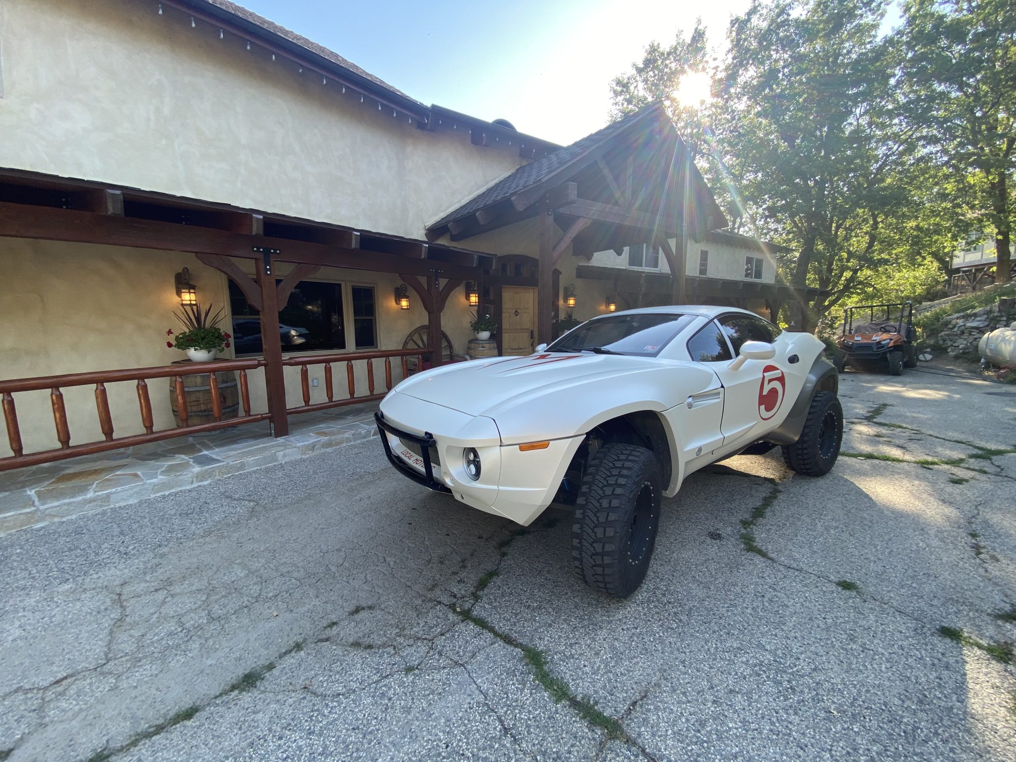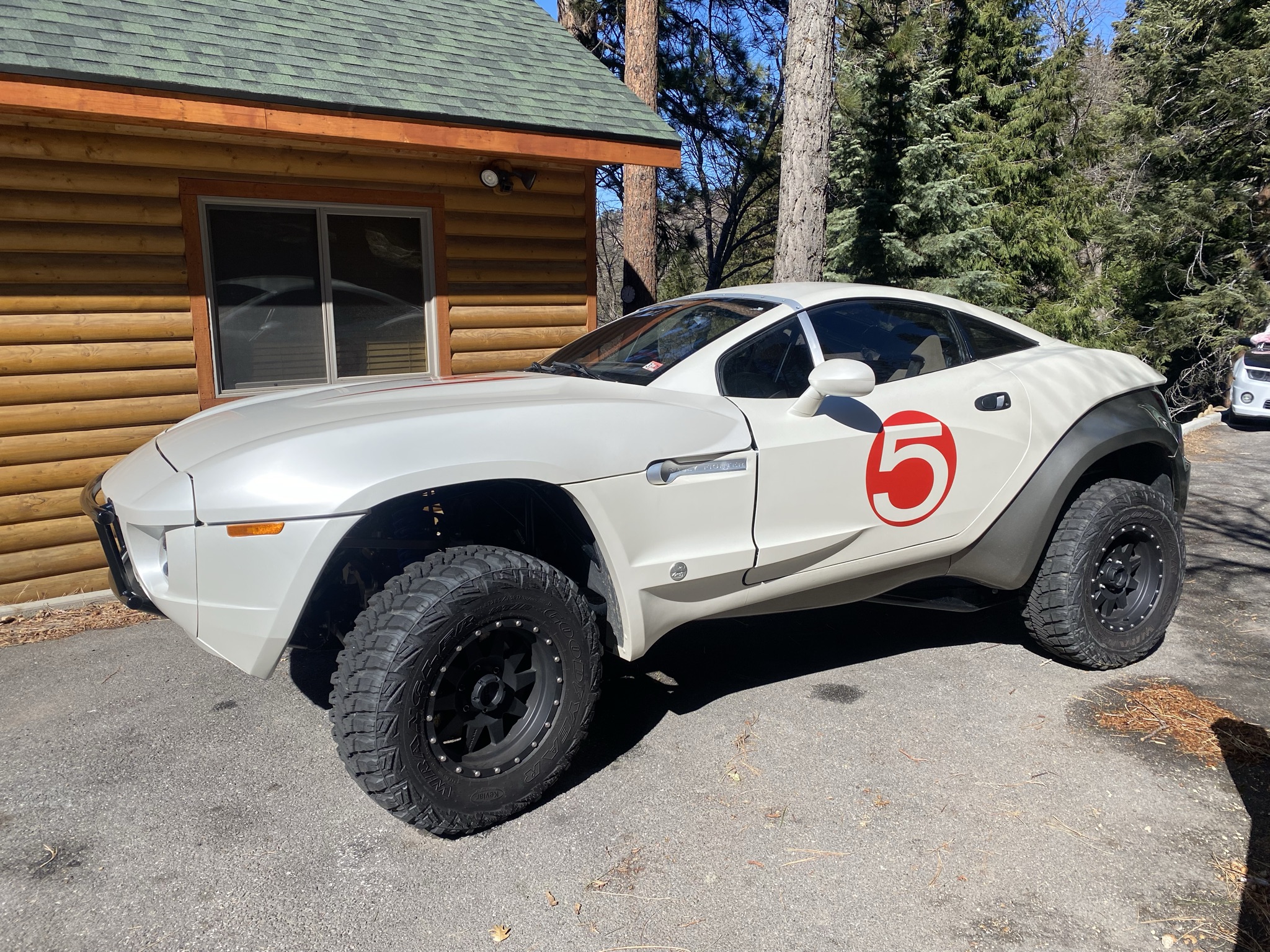 Black-finished 17” simulated beadlock wheels are mounted with 285/70 Goodyear Wrangler tires. A full-size spare is found in the trunk. Braking is through four-wheel discs. The truck rides on front and rear King coilovers with remote reservoirs.