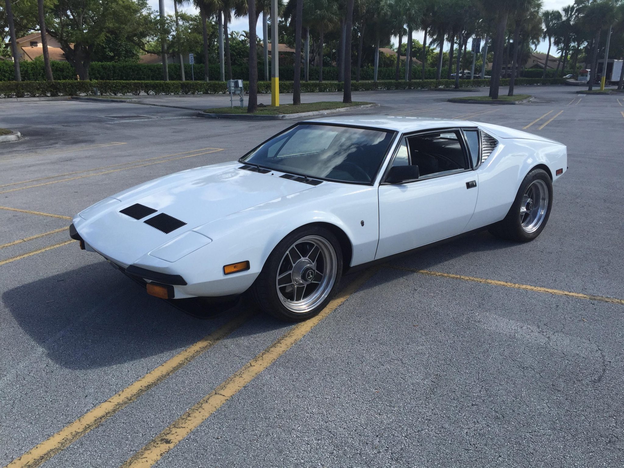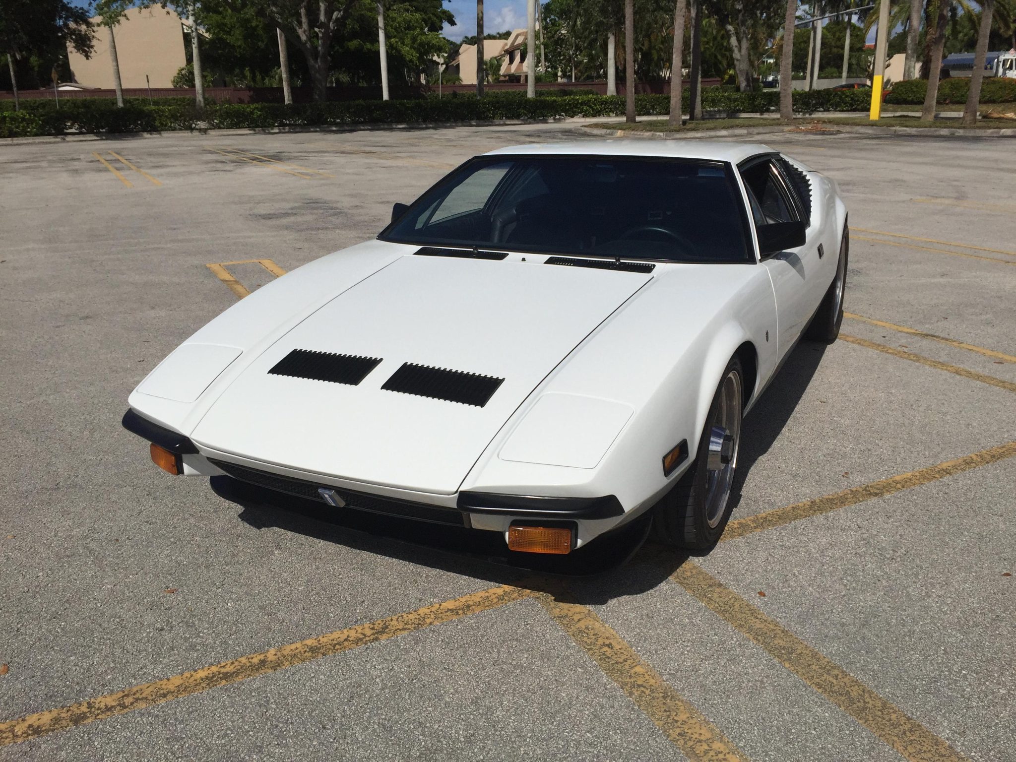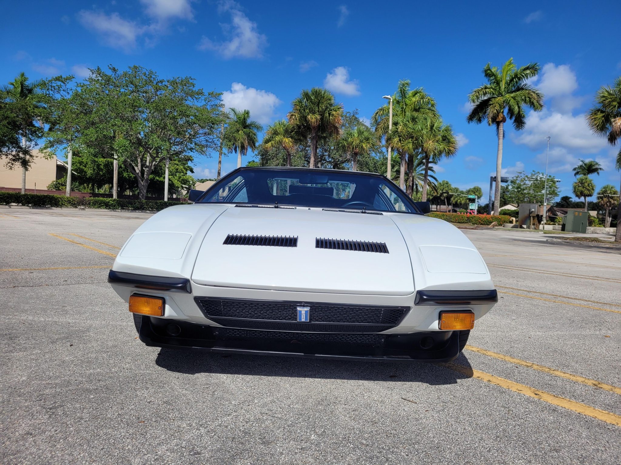 Staggered-width 17″ aluminum wheels wear DeTomaso-branded center caps and are mounted with 235/40 front and 335/35 rear Michelin Pilot Sport tires. Braking is handled by Wilwood calipers at all four corners. The selling dealer notes that revised front and rear sway bars and bushings are fitted.