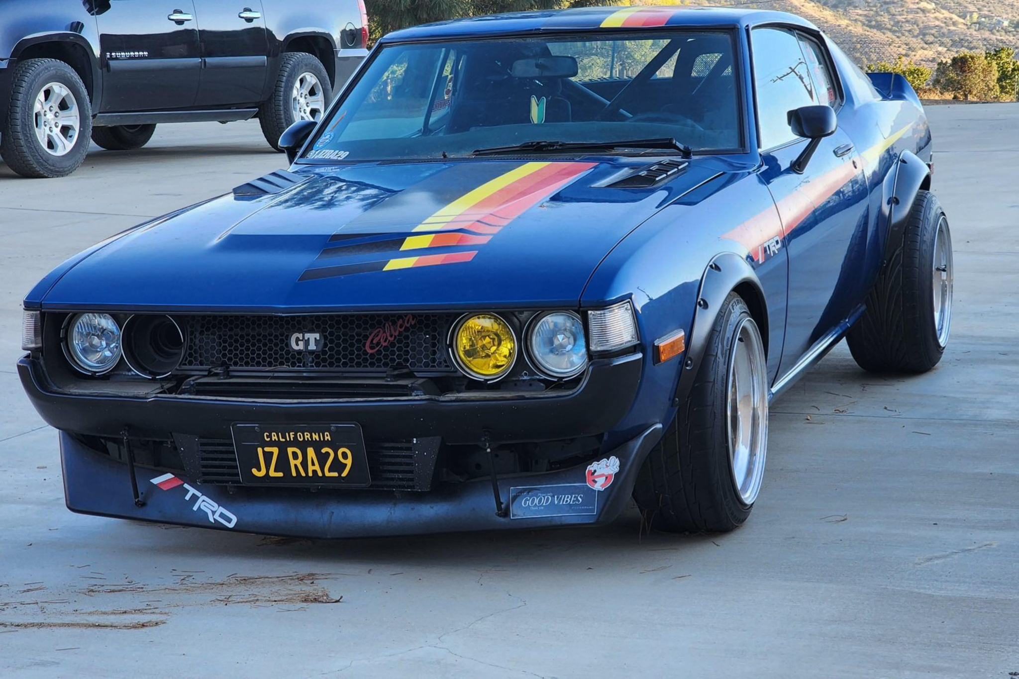 Multi-piece 16″ Epsilon wheels with gold mesh centers and polished outer barrels have been built to custom staggered widths of 9″ up front and 12″ out back. They are mounted with 205/45 Firestone Firehawk Indy 500 front tires and 245/45 Toyo Proxes rear tires. The chassis is said to have been modified with Techno Toy Tuning coilovers, tubular front control arms, an aftermarket steering linkage, a CUSCO front strut tower brace, and rear traction bars. The four-wheel disc brakes utilize Wilwood front calipers sourced from Techno Toy Tuning.