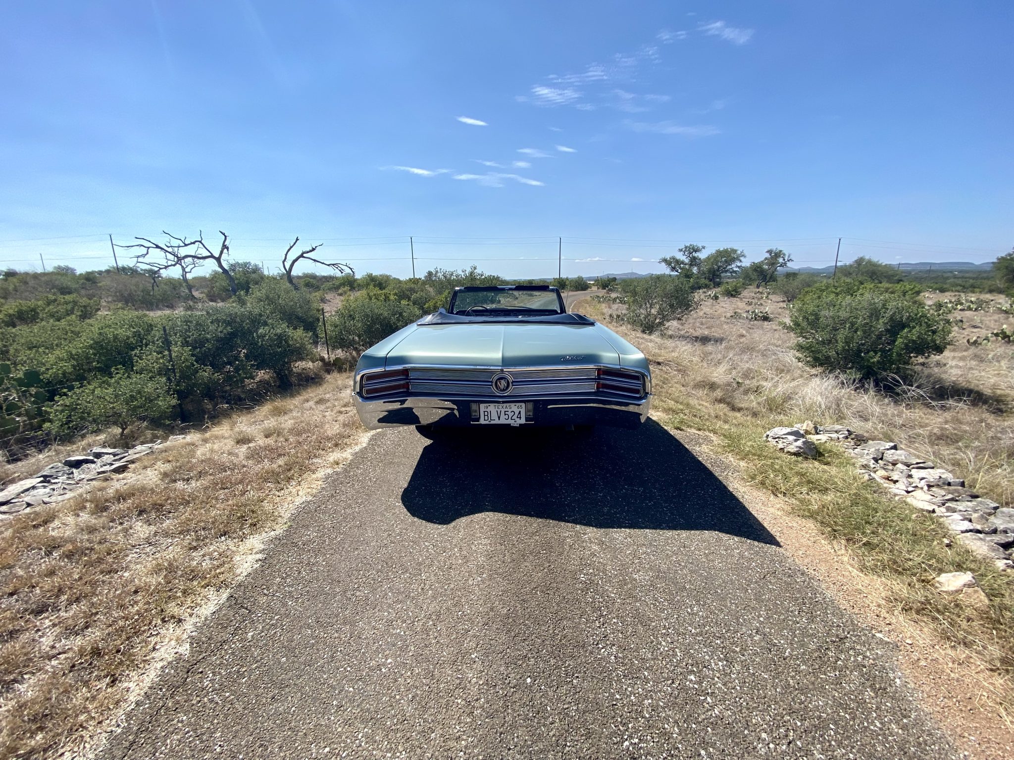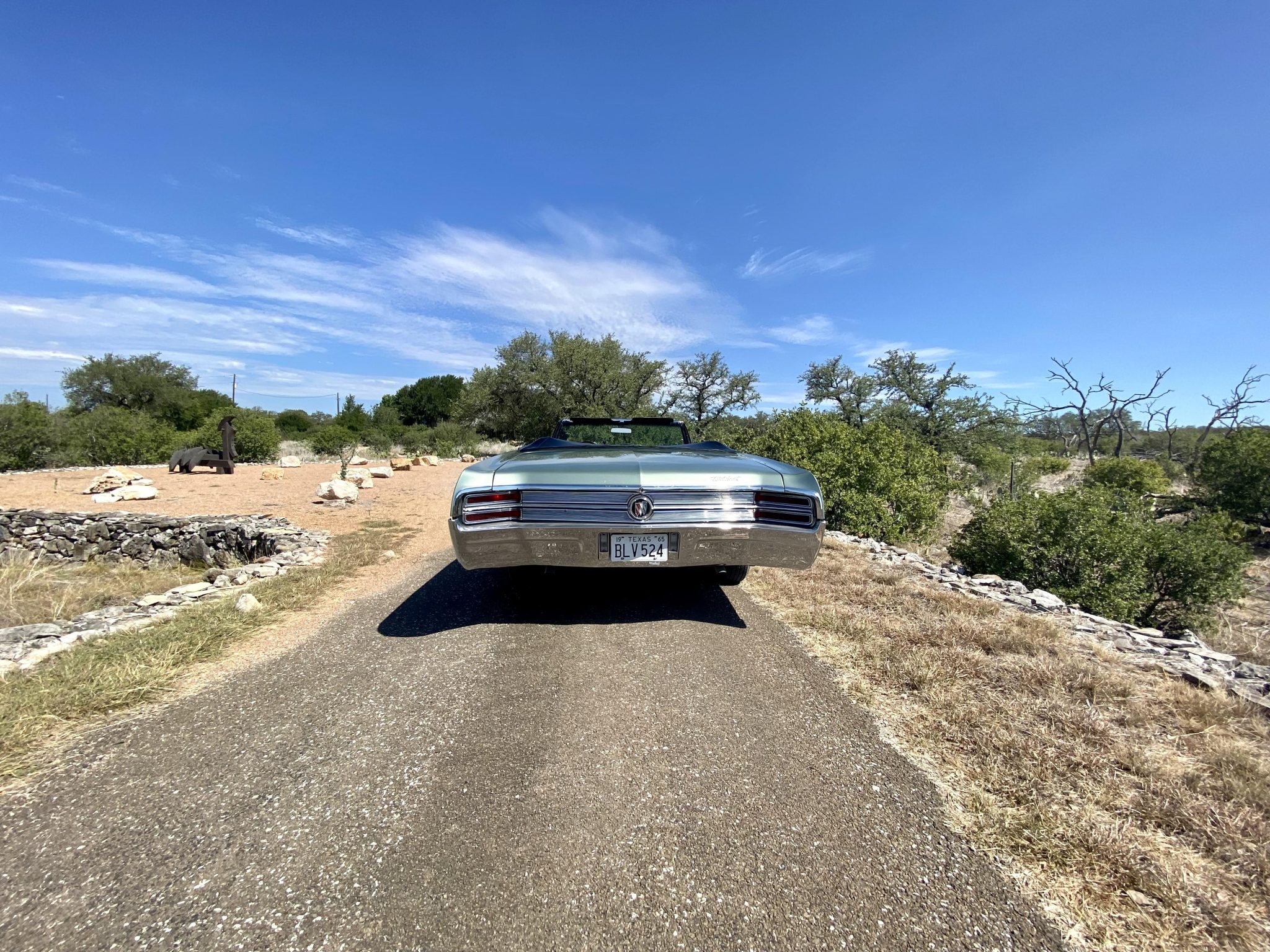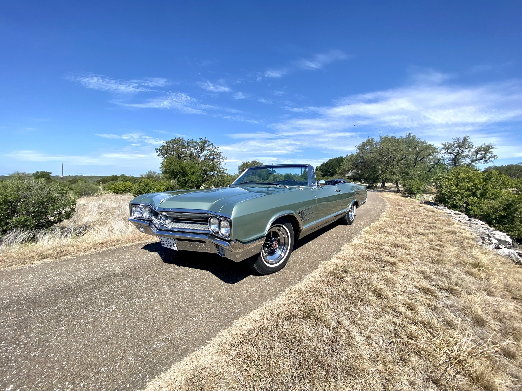 The replacement black convertible top is shown raised above. The 15″ Rally wheels wear Wildcat-logo center emblems and are mounted with 225/75 Cooper Trendsetter SE tires that were mounted in 2021 according to the seller. The car is equipped with power steering along with power-assisted drum brakes at all four corners.