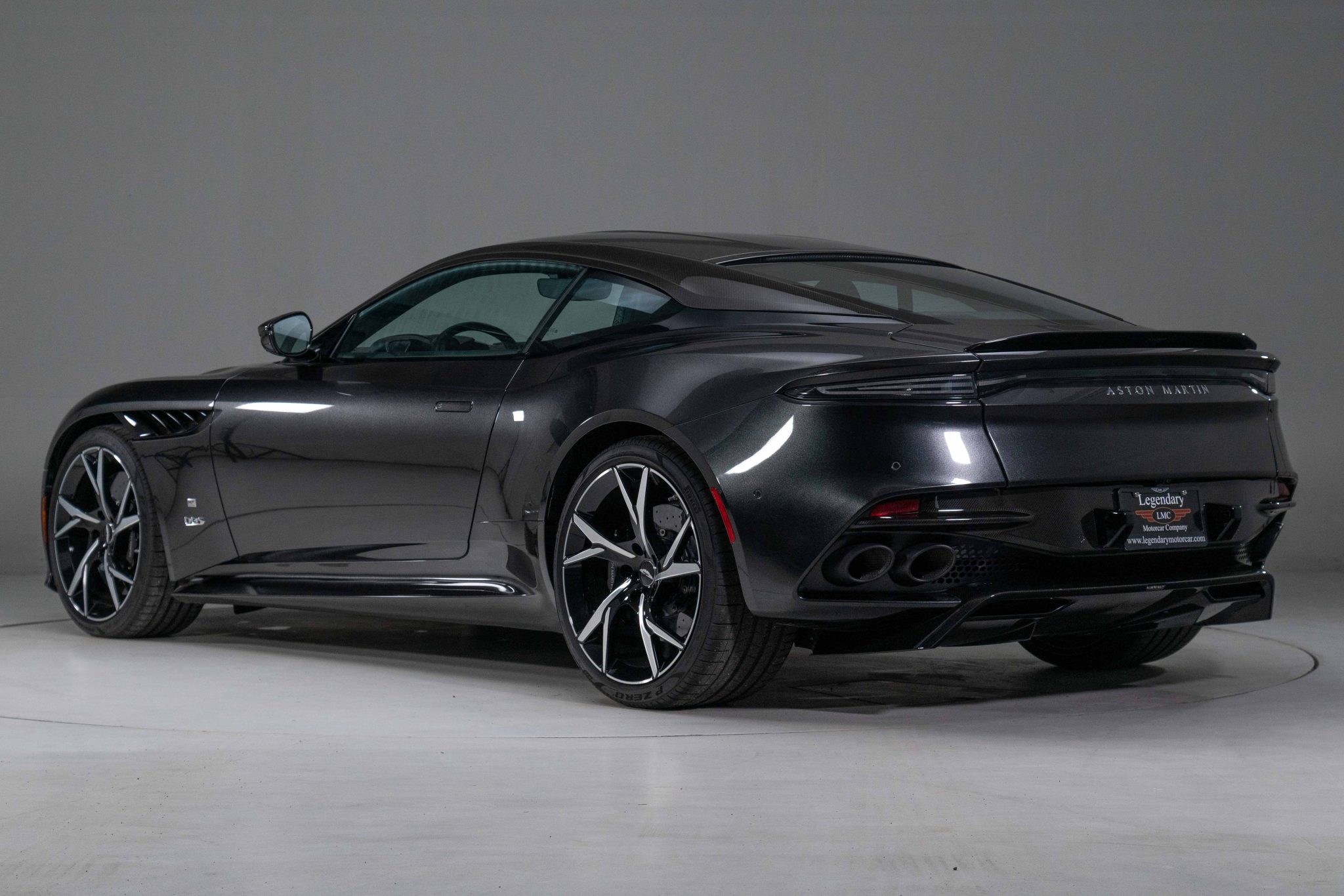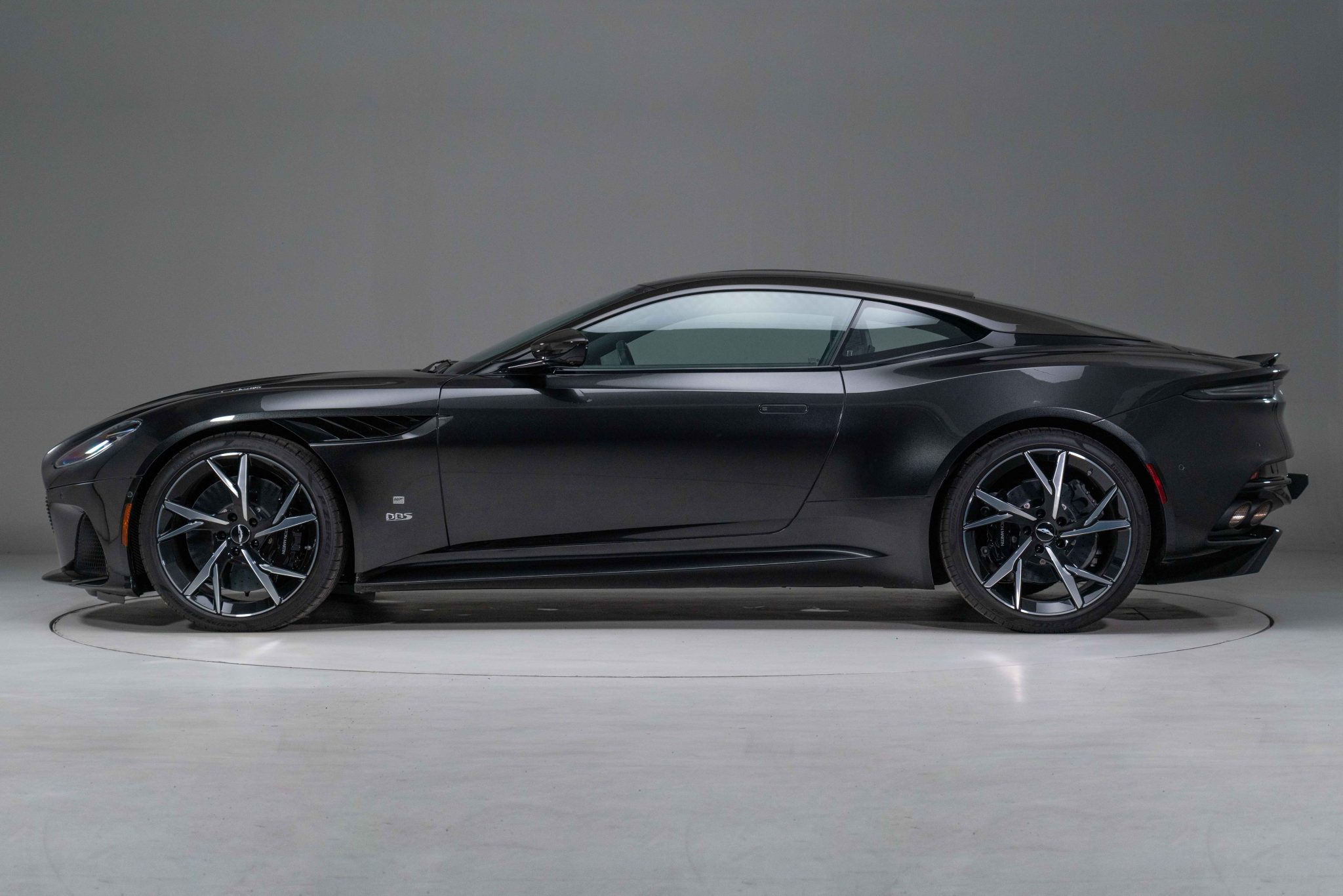 The 21″ forged Y-spoke wheels feature an exclusive gloss black finish with diamond-turned accents for 007 Edition models, and they are mounted with 265/35 front and 305/30 rear Pirelli P Zero tires. Stopping power is provided by black-finished calipers over carbon-ceramic discs at all four corners, and the car is equipped with Dynamic Stability Control, traction control, and Positive Torque Control as well as the Adaptive Damping System with three driving modes: GT, Sport, and Sport+.
