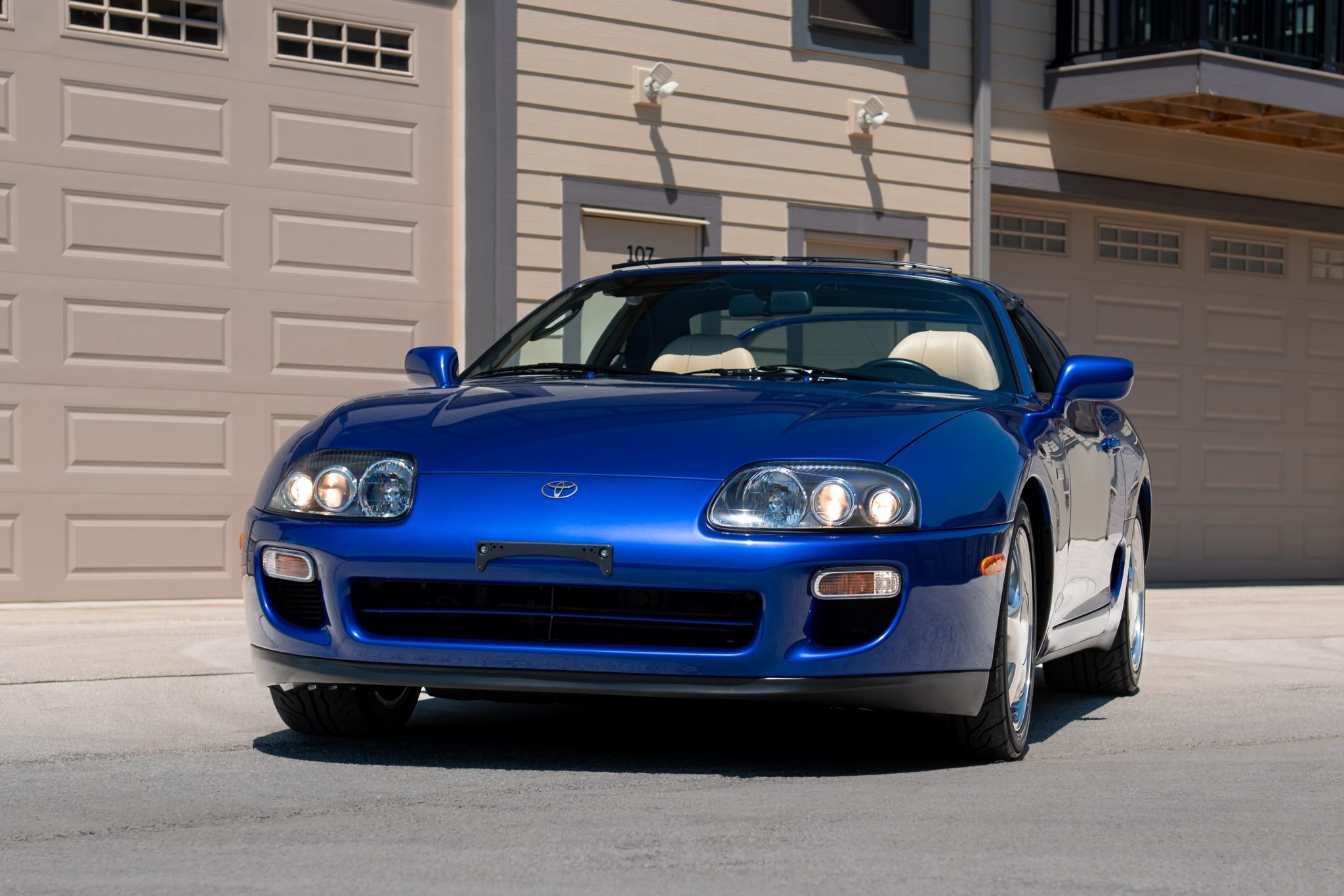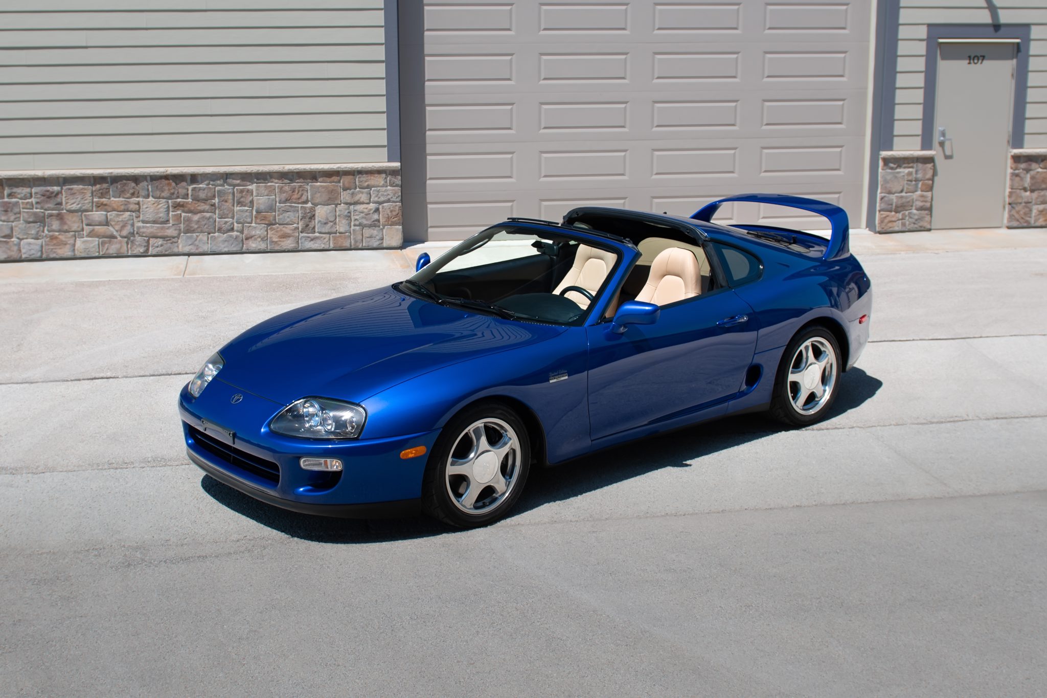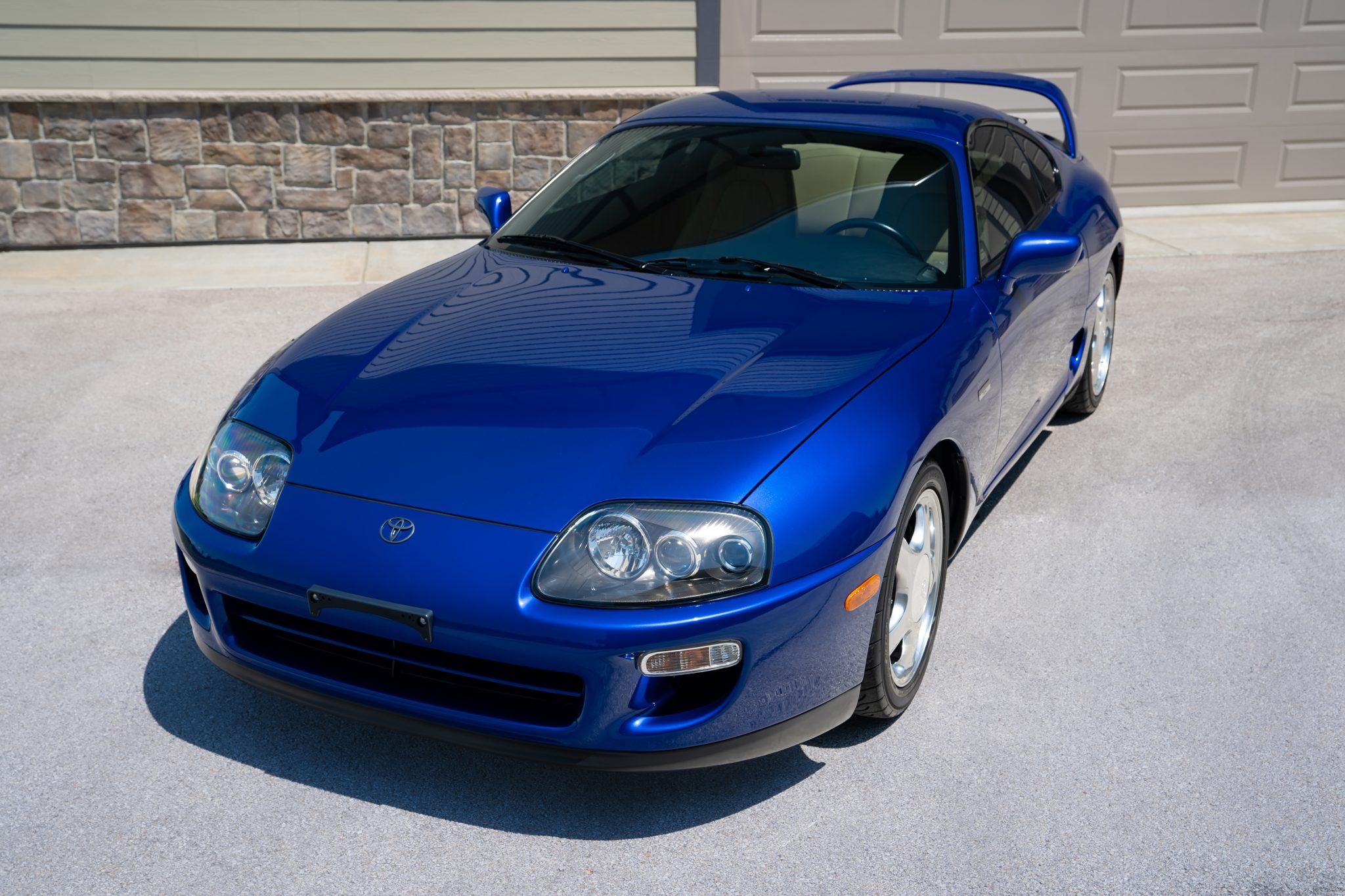 Polished 17″ alloy wheels are mounted with 235/45 front and 255/40 rear Yokohama Advan Neova tires. The car is equipped with traction control, and HKS adjustable coilovers were installed during previous ownership. Stopping power is provided by anti-lock disc brakes with Supra-branded calipers at all four corners.