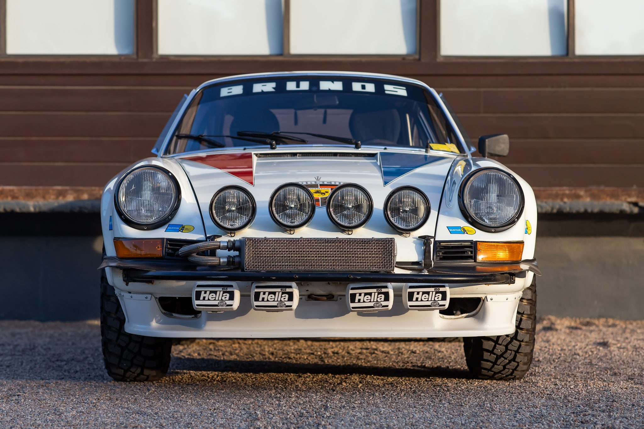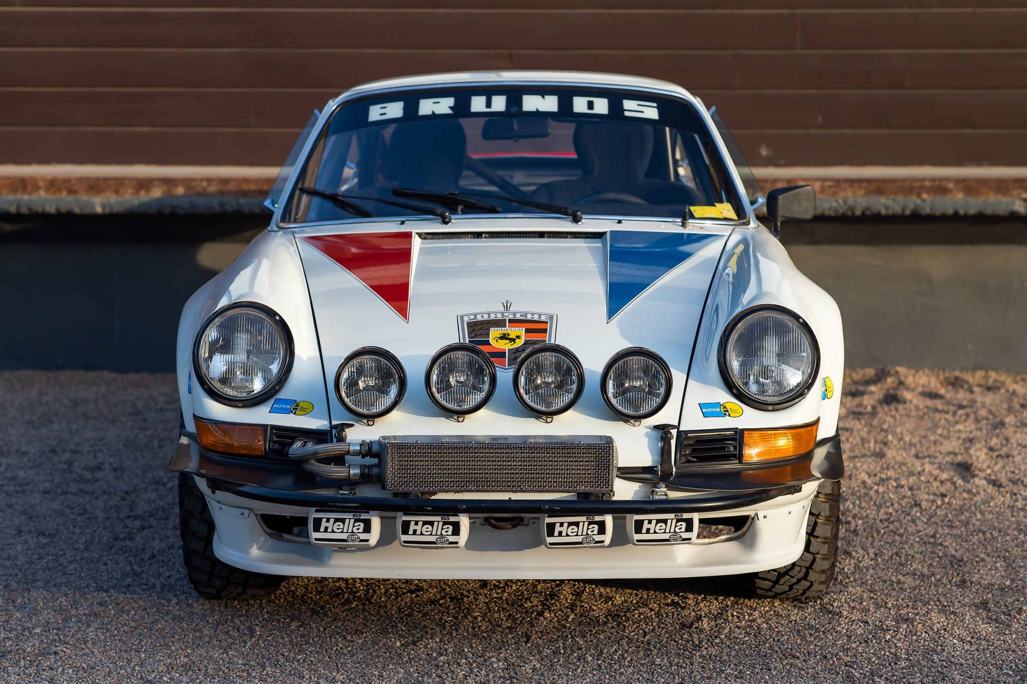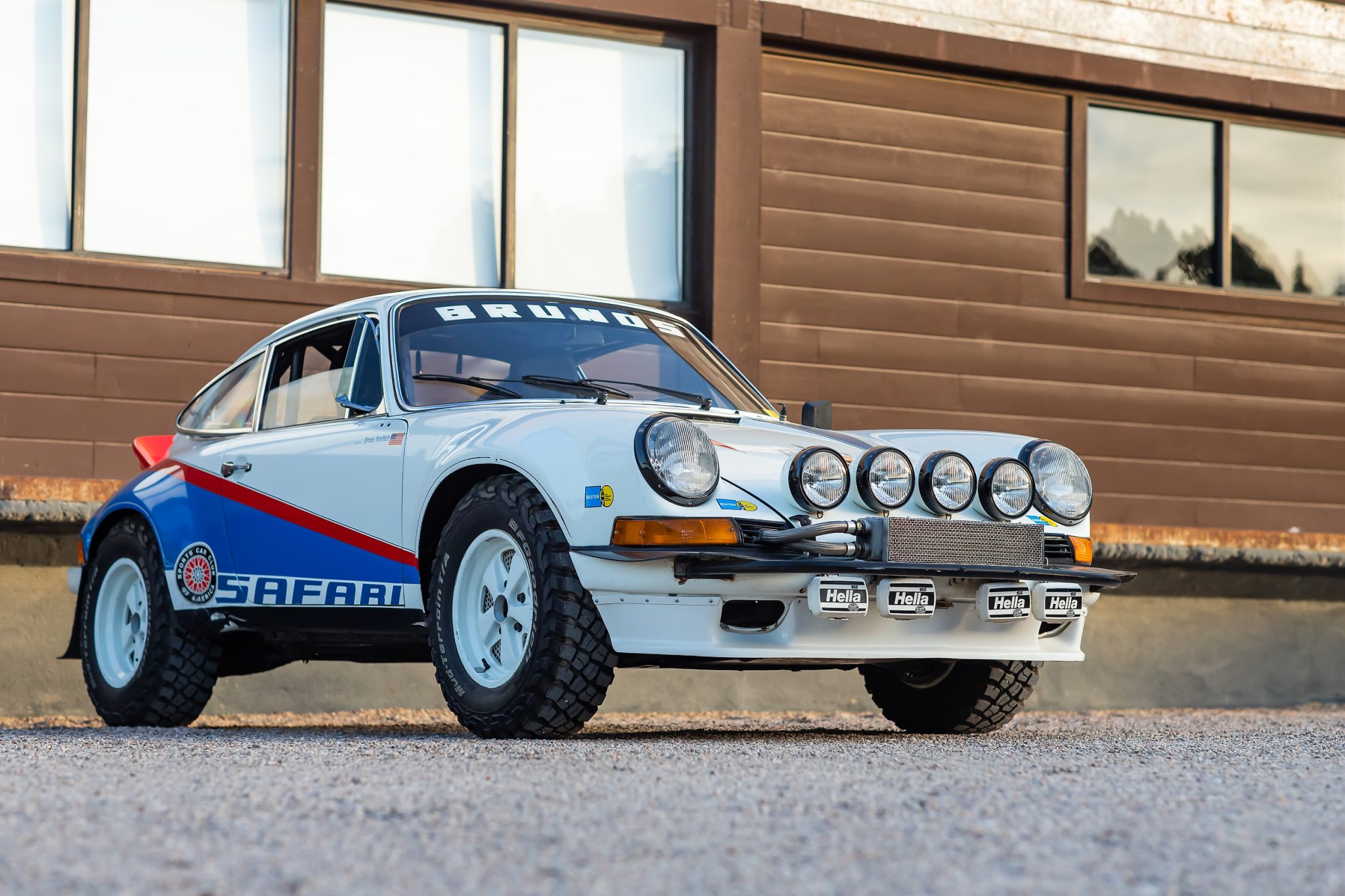 The 1978-1979 build included the disassembly and media-blasting of the body before reinforcement panels were welded to areas of the shell including suspension and roll-cage mounting points. The car was then finished in white with red and blue Safari graphics, and various areas of chipping and other imperfections are shown up close in the photo gallery below. Exterior features include fiberglass bumpers, RSR-style fender flares, a ducktail spoiler, plexiglass rear and side windows, quad hood-mounted driving lights, front and rear bumper-mounted fog lights, a front bull bar, mudguards, and an electrical cut-off switch.
