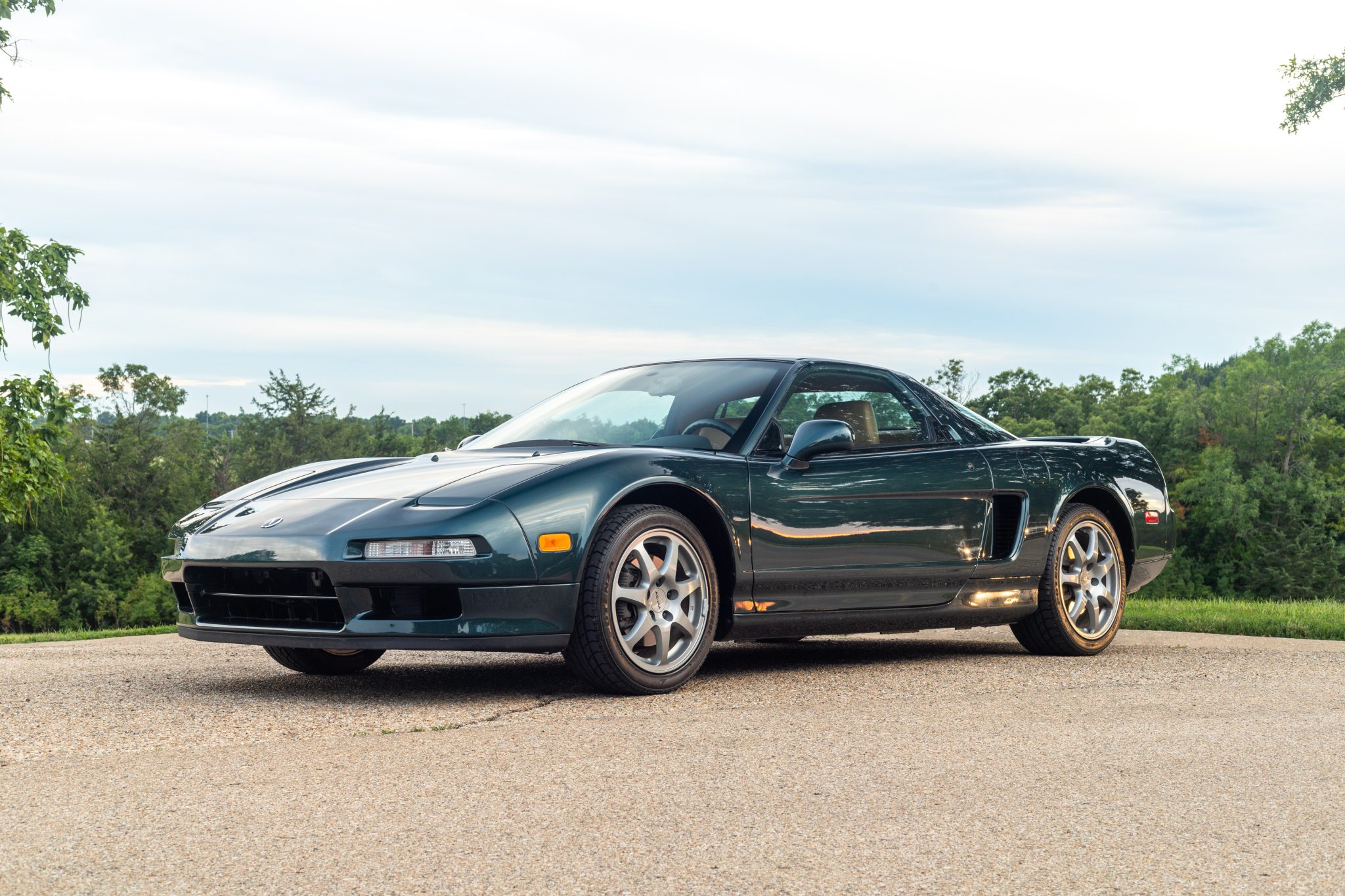 Staggered-diameter 16” and 17” seven-spoke aluminum wheels wear Bridgestone Potenza tires mounted in 2011 that measure 215/45 up front and 245/40 out back. The car features a four-wheel double-wishbone suspension with front and rear stabilizer bars, and braking is handled by NSX-branded calipers over vented rotors at each corner. Curb marks and scratches are visible in close-up photos of the wheels included in the gallery below.