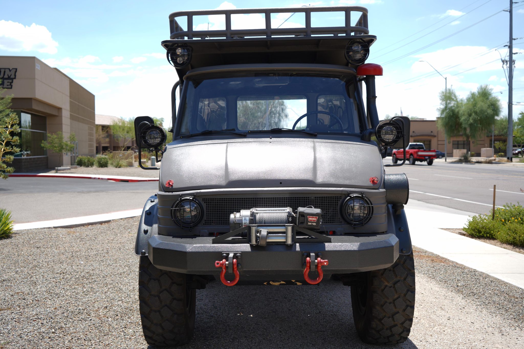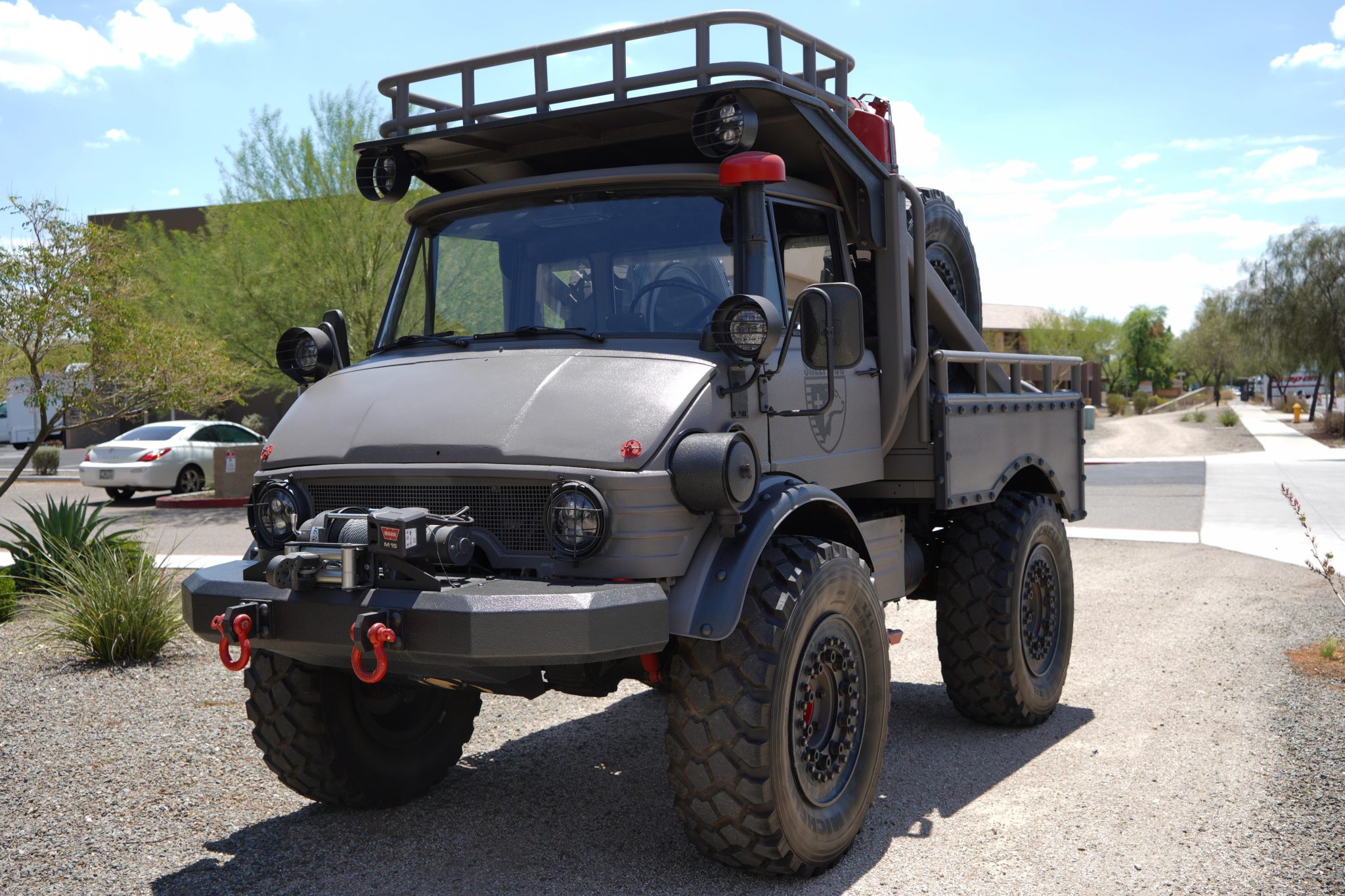 Beadlock 20″ wheels feature red-painted hubs and are mounted with 365/80 Michelin XZL tires, and two spares are mounted vertically in the bed. Stopping power is provided by disc brakes at all four corners. The truck is equipped with high-clearance portal axles.