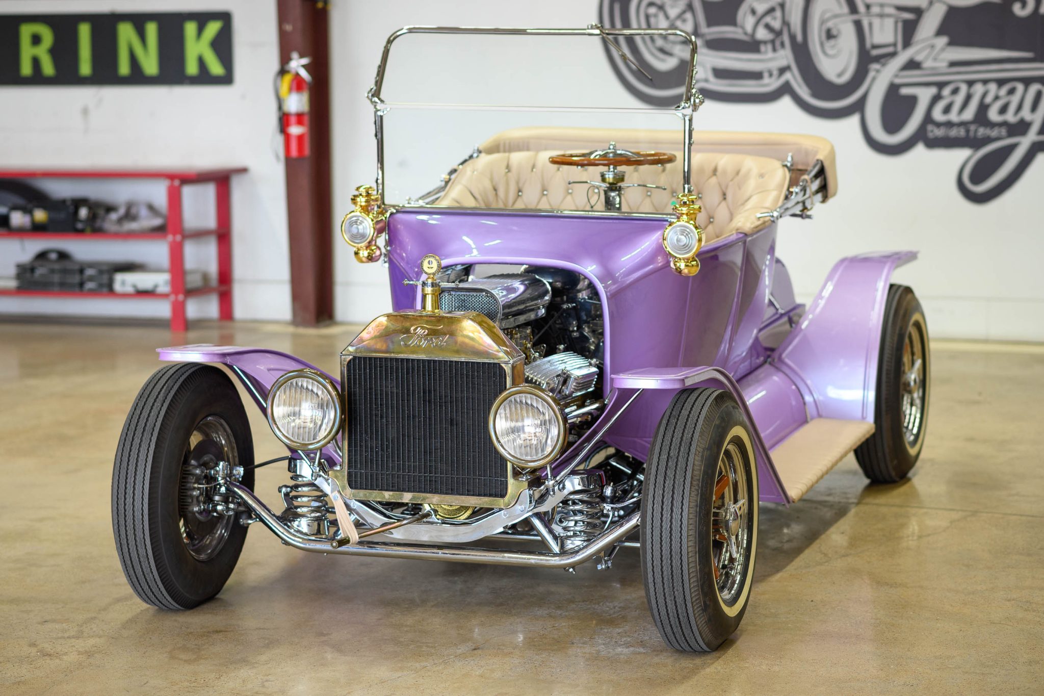 The 15″ chrome wheels feature faux knock-off hubs and wood inlays, and they are mounted with US Royal Safety 800 whitewall bias-ply tires. The car is built on a custom tubular steel frame and utilizes chromed Jaguar XKE-sourced independent rear suspension components, front radius rods, chrome front tube shocks, and front coil springs. Stopping power is provided by four-wheel disc brakes with inboard rear units.