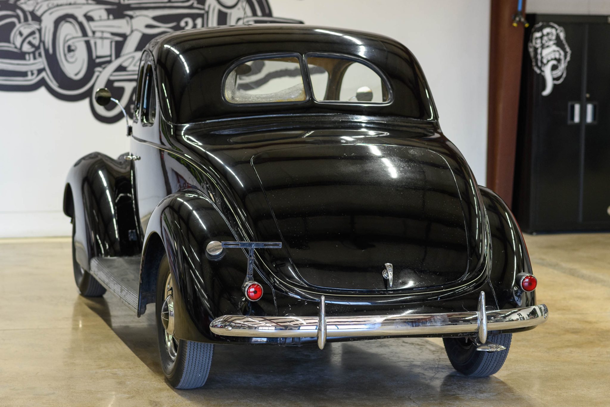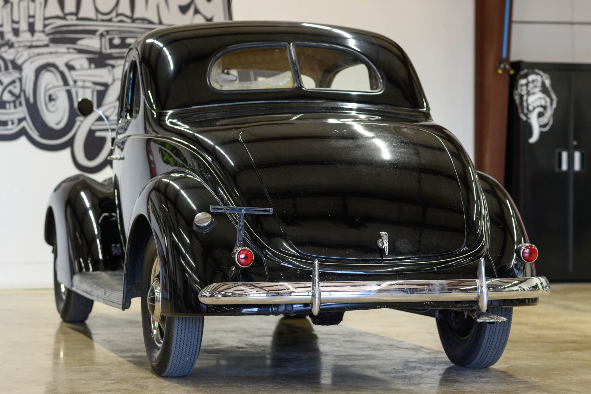 The body-color artillery-style wheels wear chrome trim rings and center caps and are mounted with 6.00–16 Firestone bias-ply tires. A matching spare wheel with an older bias-ply tire is mounted in the trunk. The Model 78 rode on a 112″ wheelbase and featured transverse front and rear leaf springs. Stopping power is provided by hydraulically-actuated drums at all four corners.