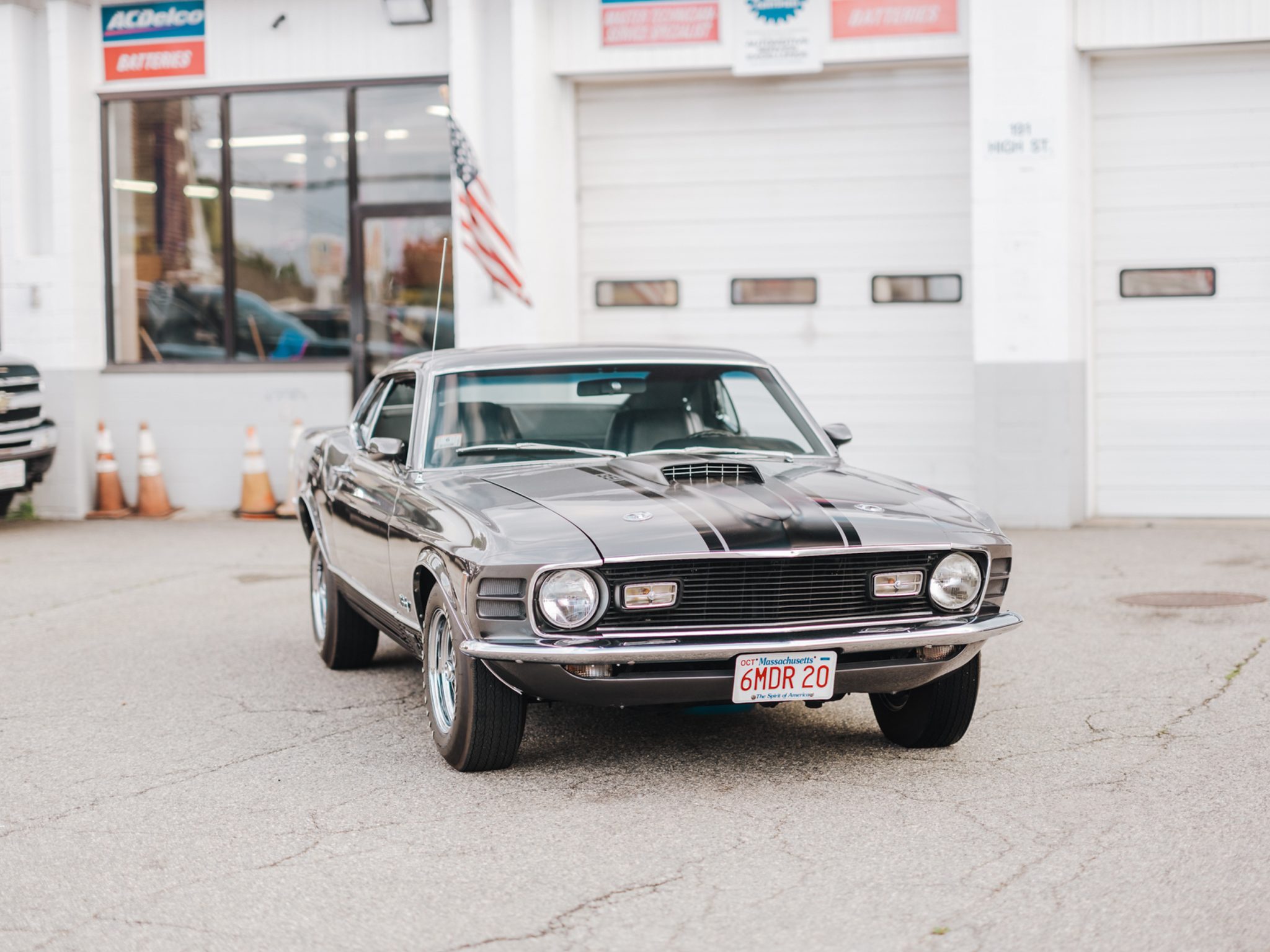 Chrome Magnum 500 wheels are mounted with E70-14 Firestone Wide Oval white-letter tires. The car is equipped with power steering, and braking is handled by power-assisted front discs and rear drums.