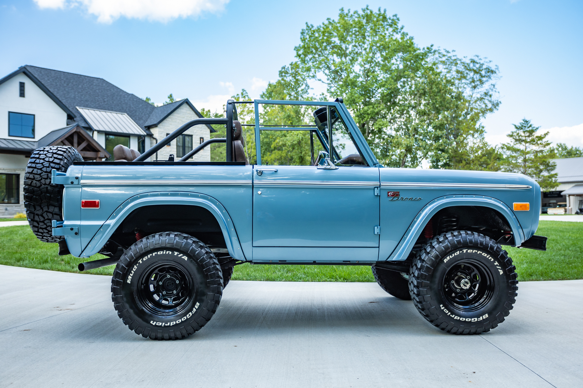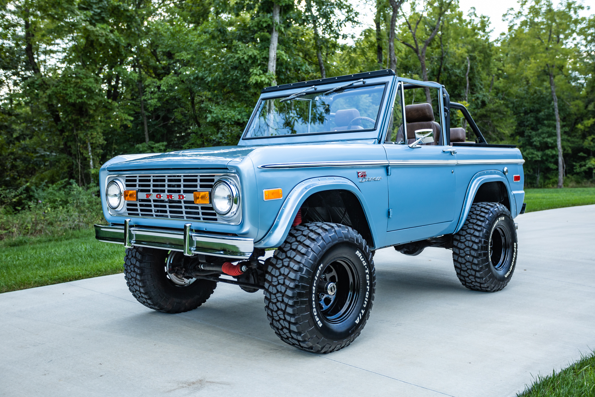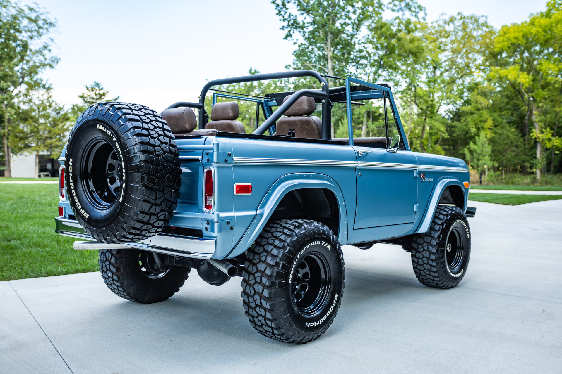 Black 15″ Ten-hole steel wheels are mounted with 33×12.5″ BFGoodrich Mud-Terrain T/A KM2 white-letter tires showing 2018 date codes, and a matching spare is mounted to a swing-away rear carrier. The truck is equipped with power steering, Mile Marker manually locking front hubs, and a 2.5″ suspension lift kit from Tom’s Offroad. Braking is handled by power-assisted front disc brakes and rear drums, and a Tom’s Offroad master cylinder is installed.