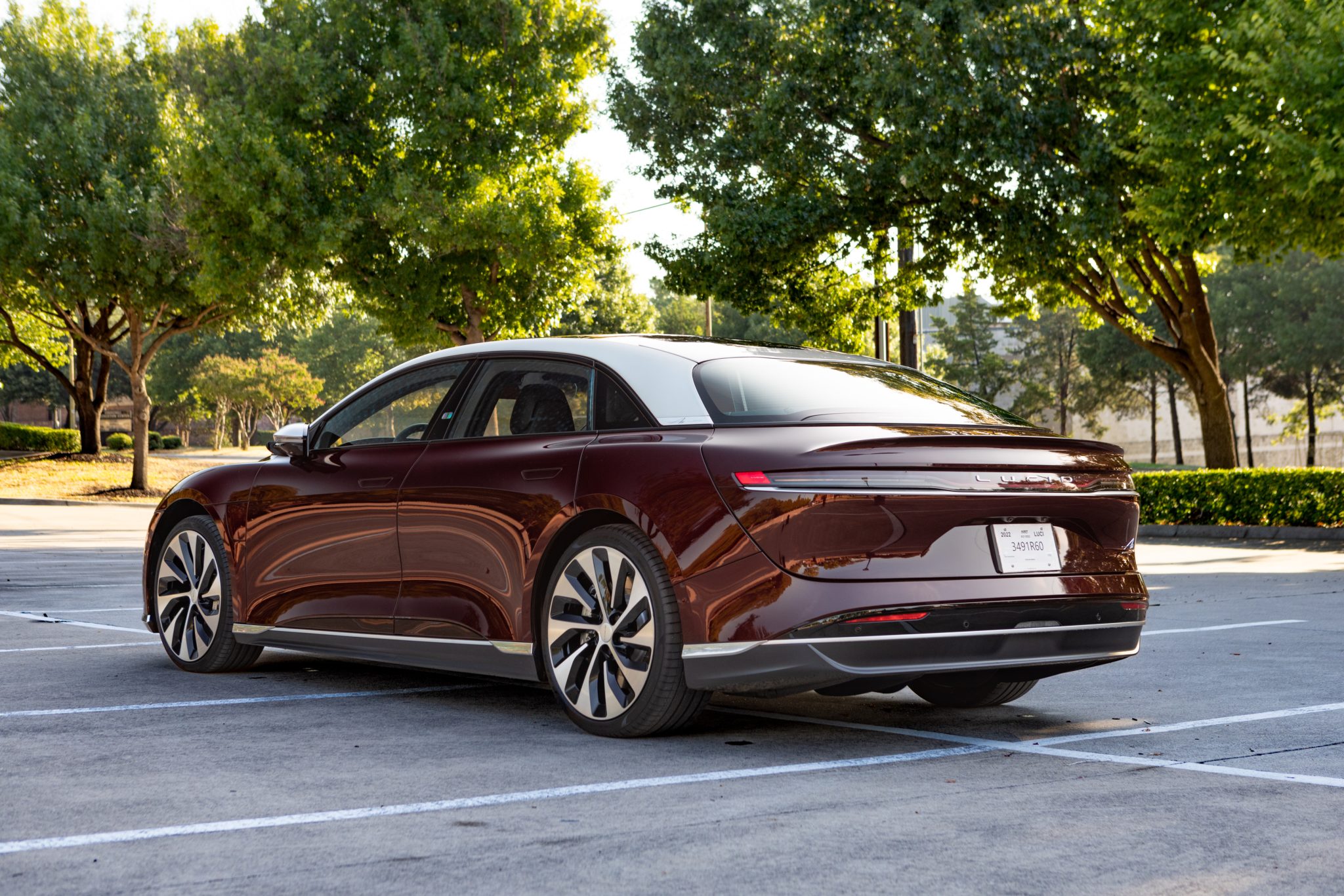 Factory 21″ Aero Blade wheels are finished in black with machined spokes, and they wear 245/35 front and 265/35 rear Pirelli P Zero Elect tires. The car is equipped with a regenerative braking system and adaptive suspension.