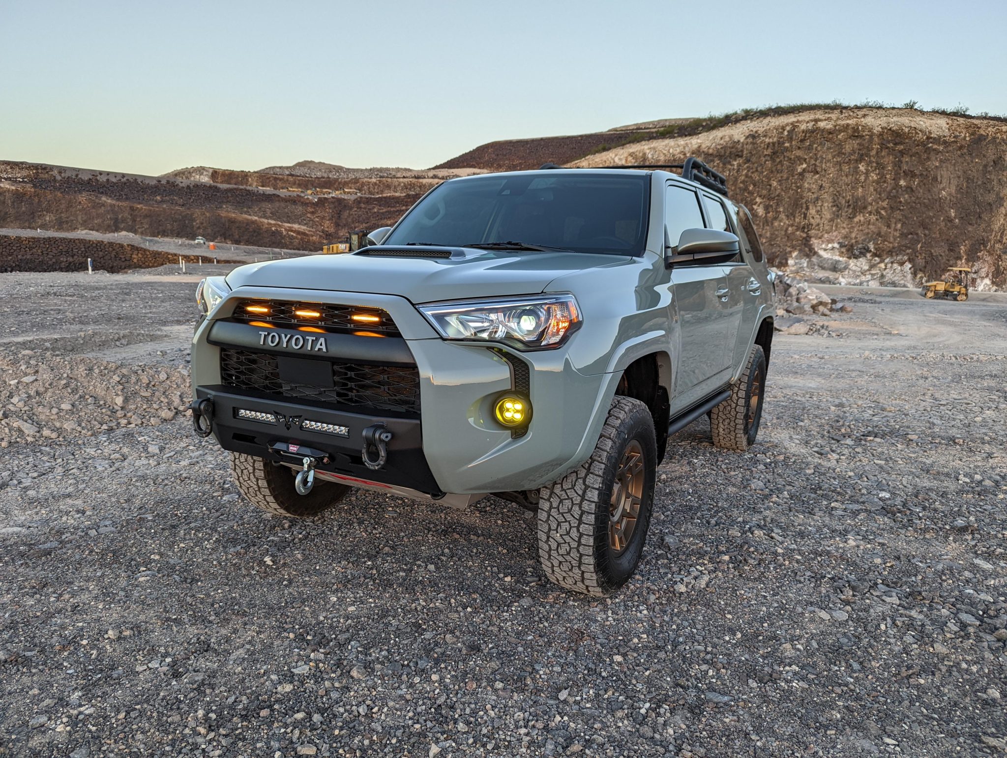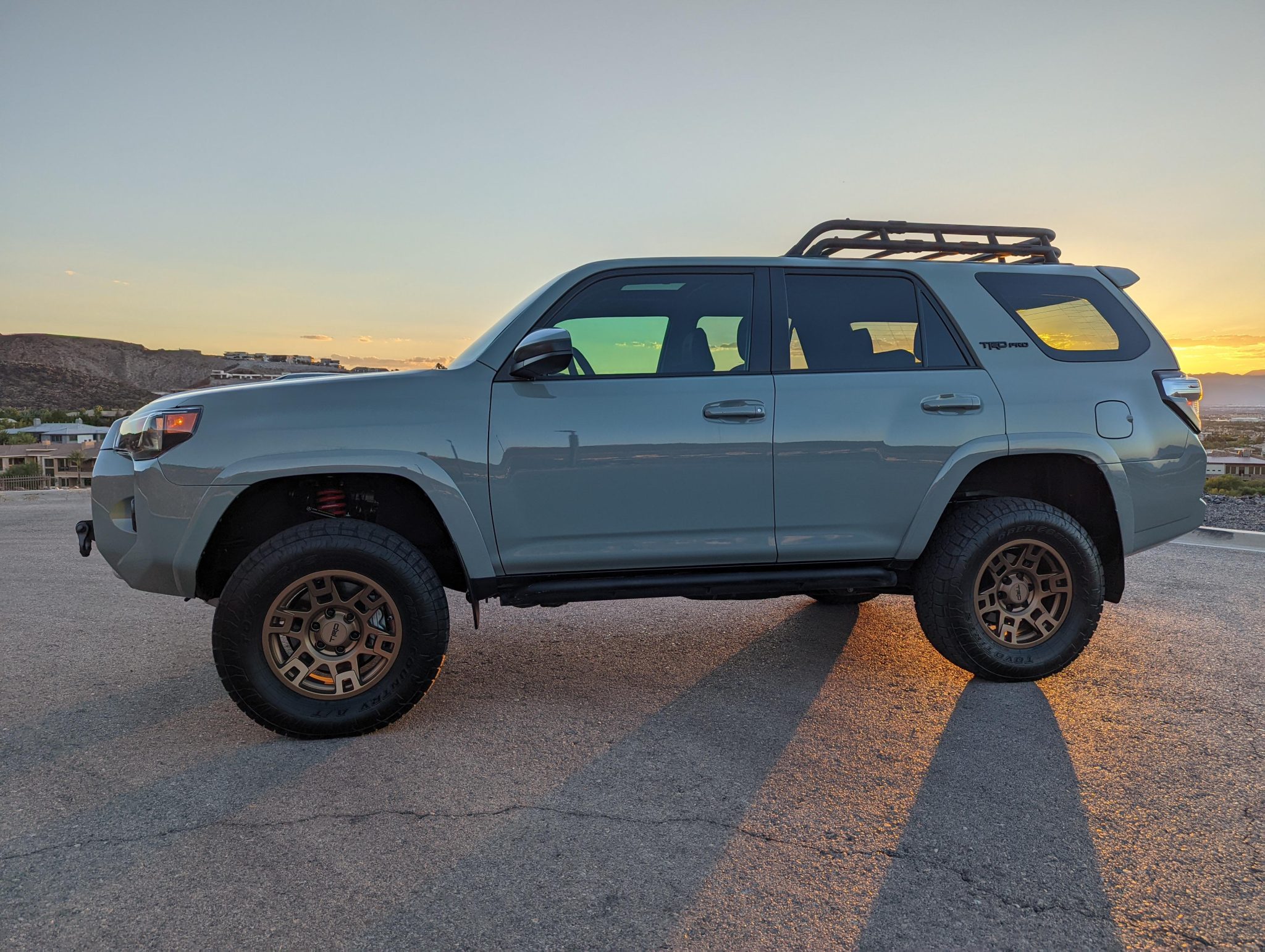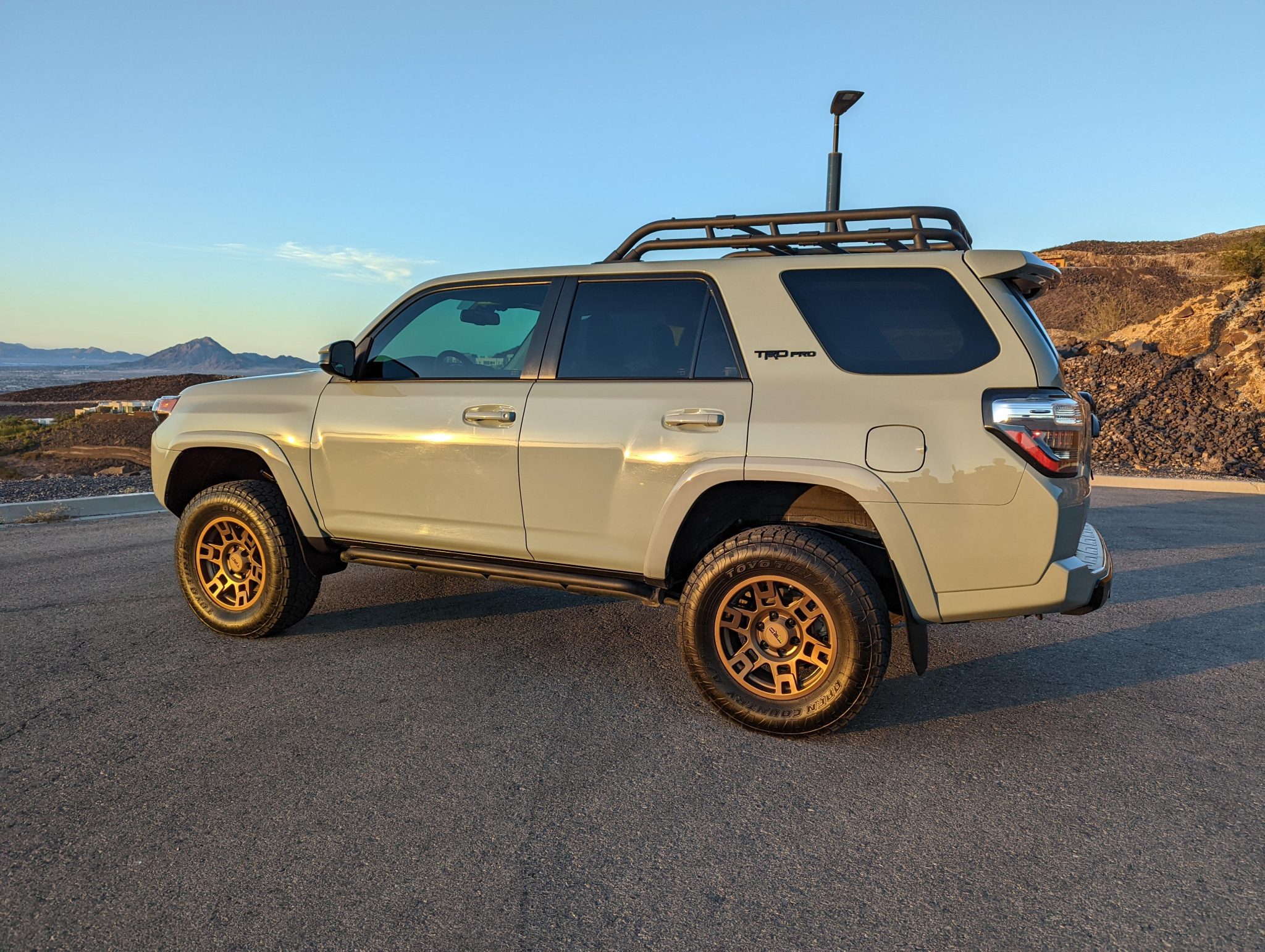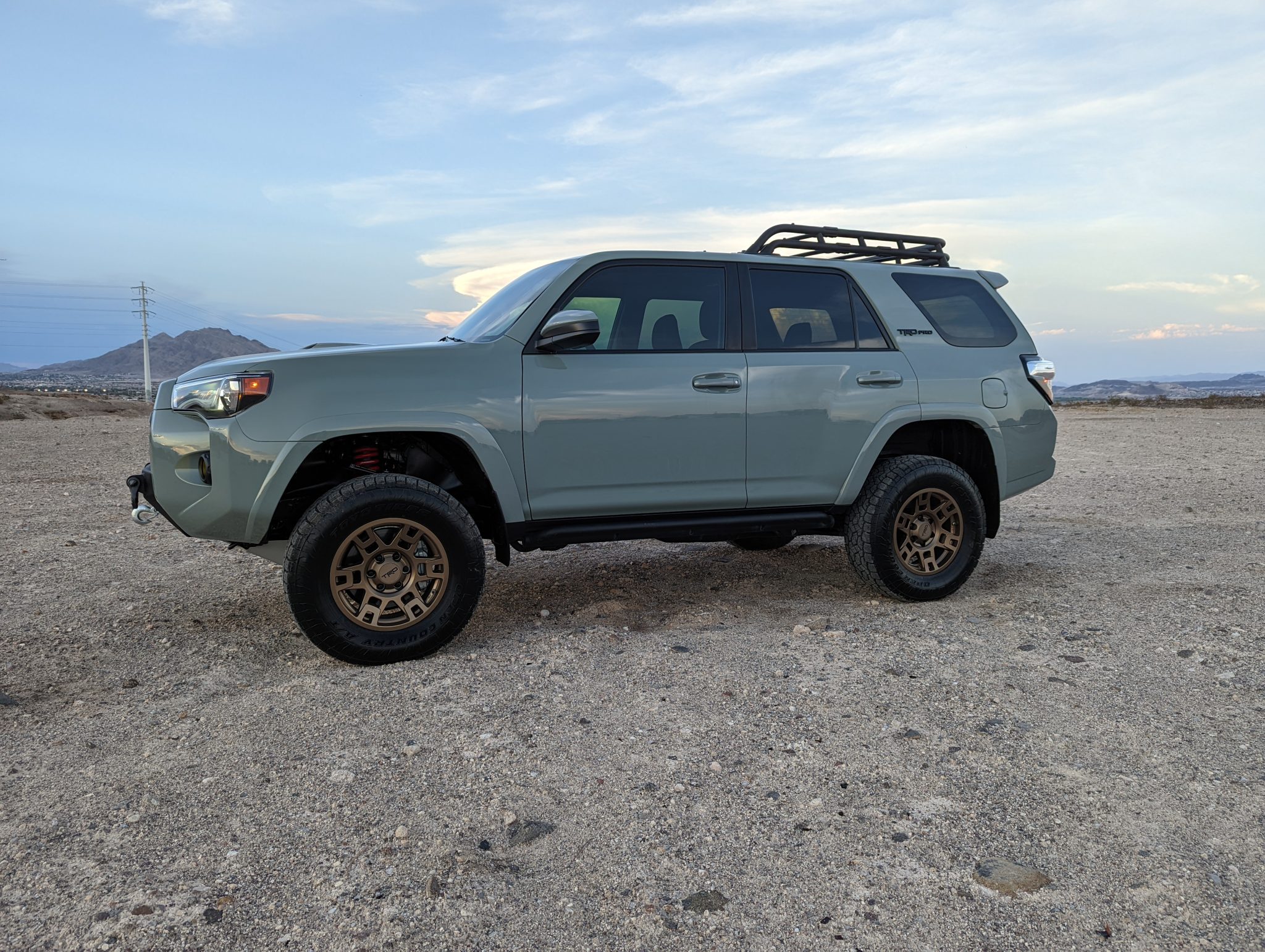 Replacement bronze-finished 17″ TRD wheels were installed under current ownership and wear 265/70 Toyo Open Country A/T III tires. The truck is equipped with Crawl Control, Multi-Terrain Select, and traction control. The seller states that the truck has been lifted approximately 2.5″ with a Toytec TRD Pro Coil Kit and Icon upper control arms with delta joints.