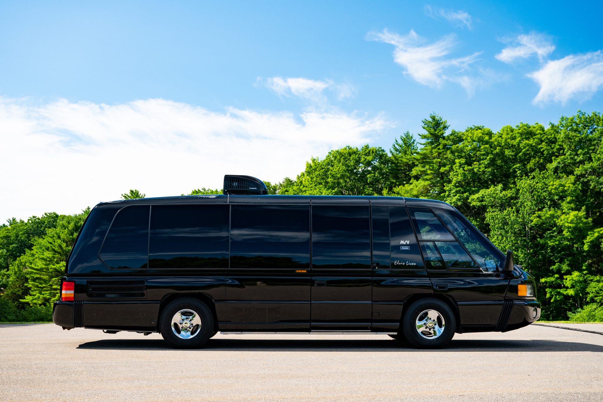 Chrome 16″ MHT wheels are wrapped in Firestone Transforce HT2 tires, and stopping power is provided by four-wheel disc brakes. The coach is equipped with an air suspension system, and the seller notes that the original-equipment tag axle has been removed. The chrome is peeling on one of the wheels.