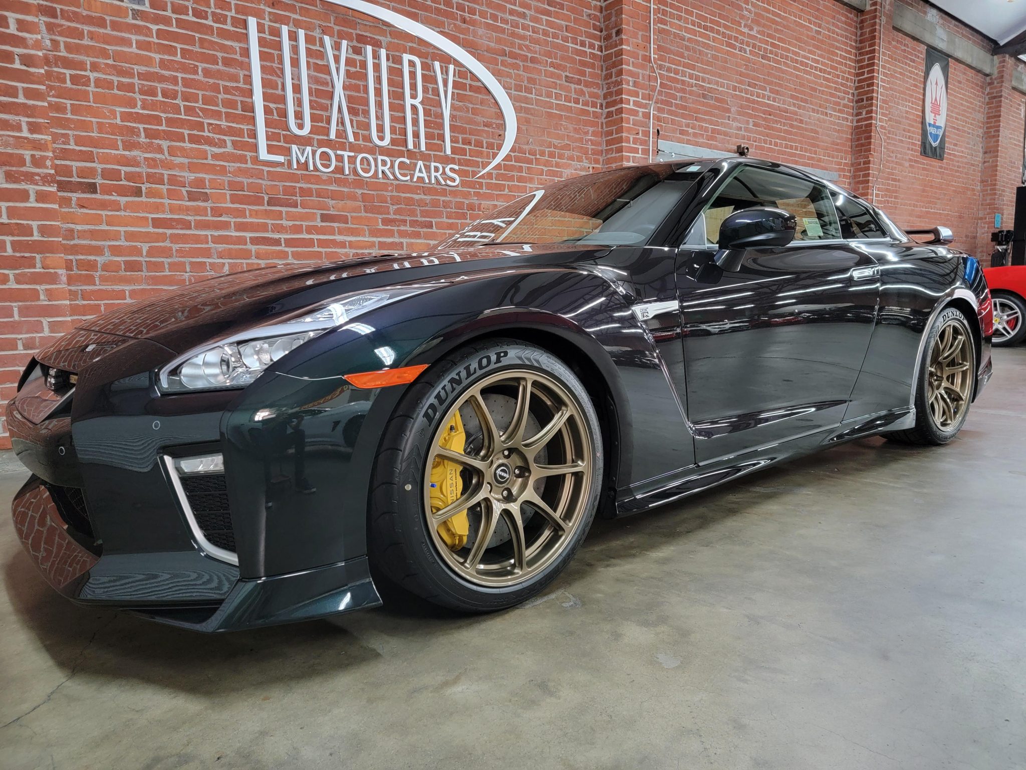 Gold-finished 20″ RAYS forged alloy wheels wear 255/40 front and 285/35 rear Dunlop SP Sportmaxx tires. The GT-R T-Spec utilizes Bilstein Damptronic electronically-controlled shock absorbers in addition to a double-wishbone front and independent multi-link rear suspension. Stopping power is borrowed from the NISMO model and consists of yellow Brembo calipers over cross-drilled carbon-ceramic rotors at all four corners.