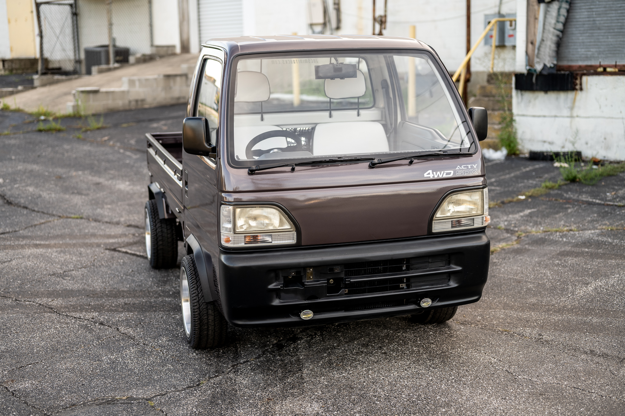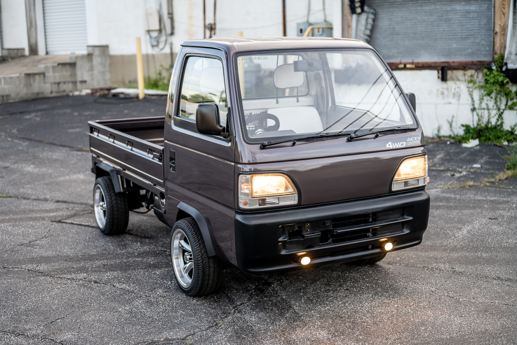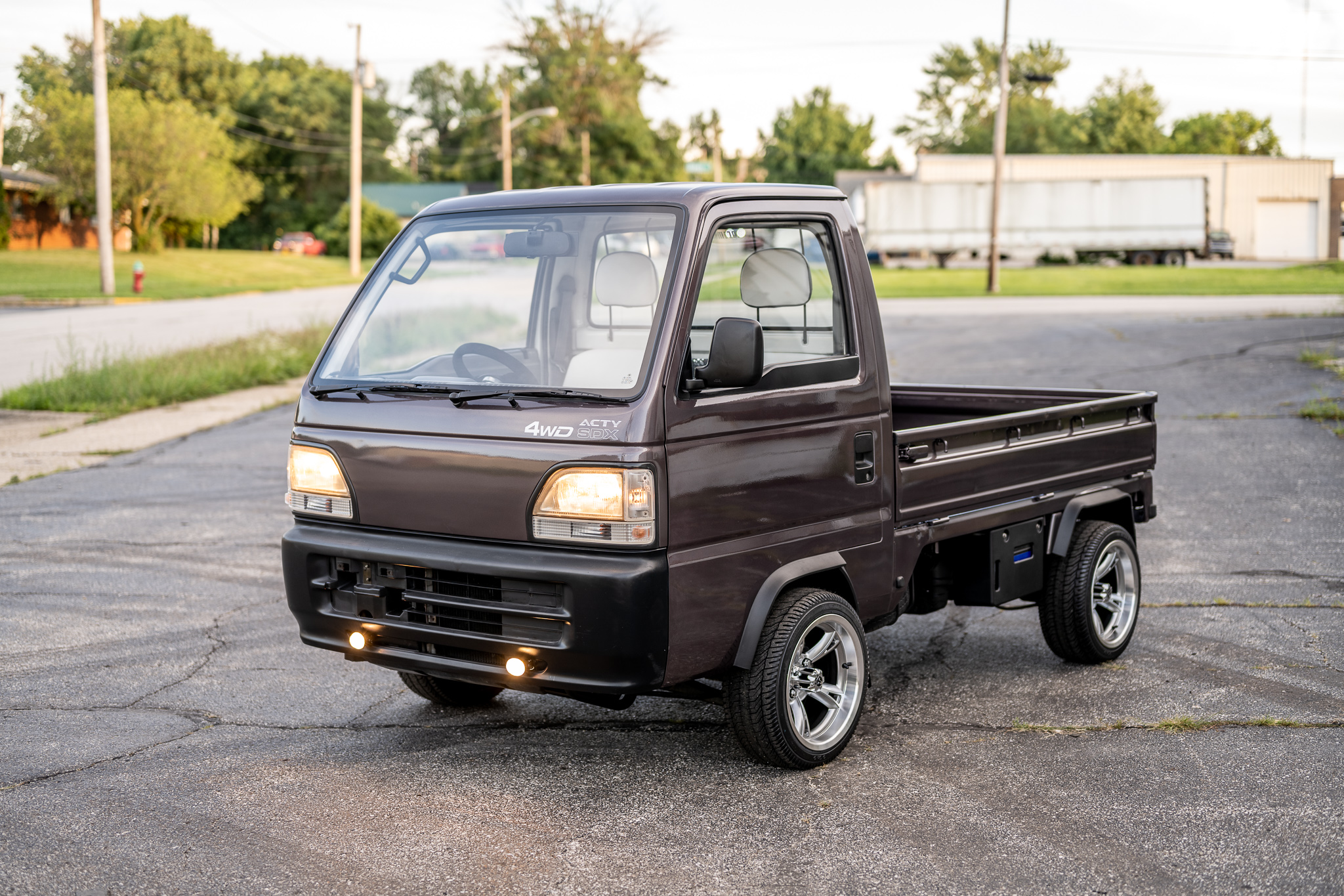Machined 14″ Empire wheels are wrapped in 205/40 Tee Master tires. Braking is handled by front discs and rear drums. The battery box and a full-size spare tire can be seen mounted under the bed. A set of four steel wheels will accompany the truck.
