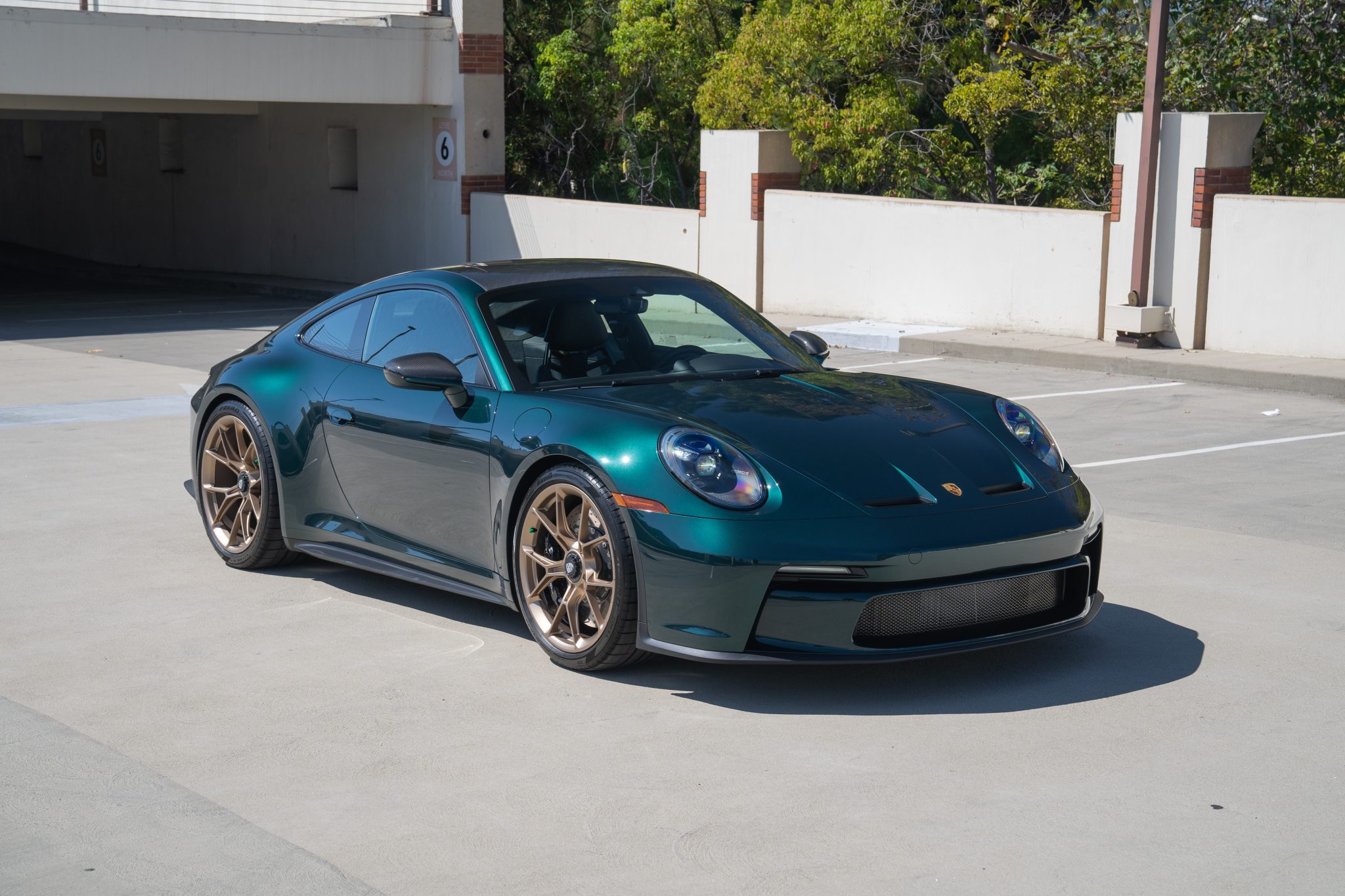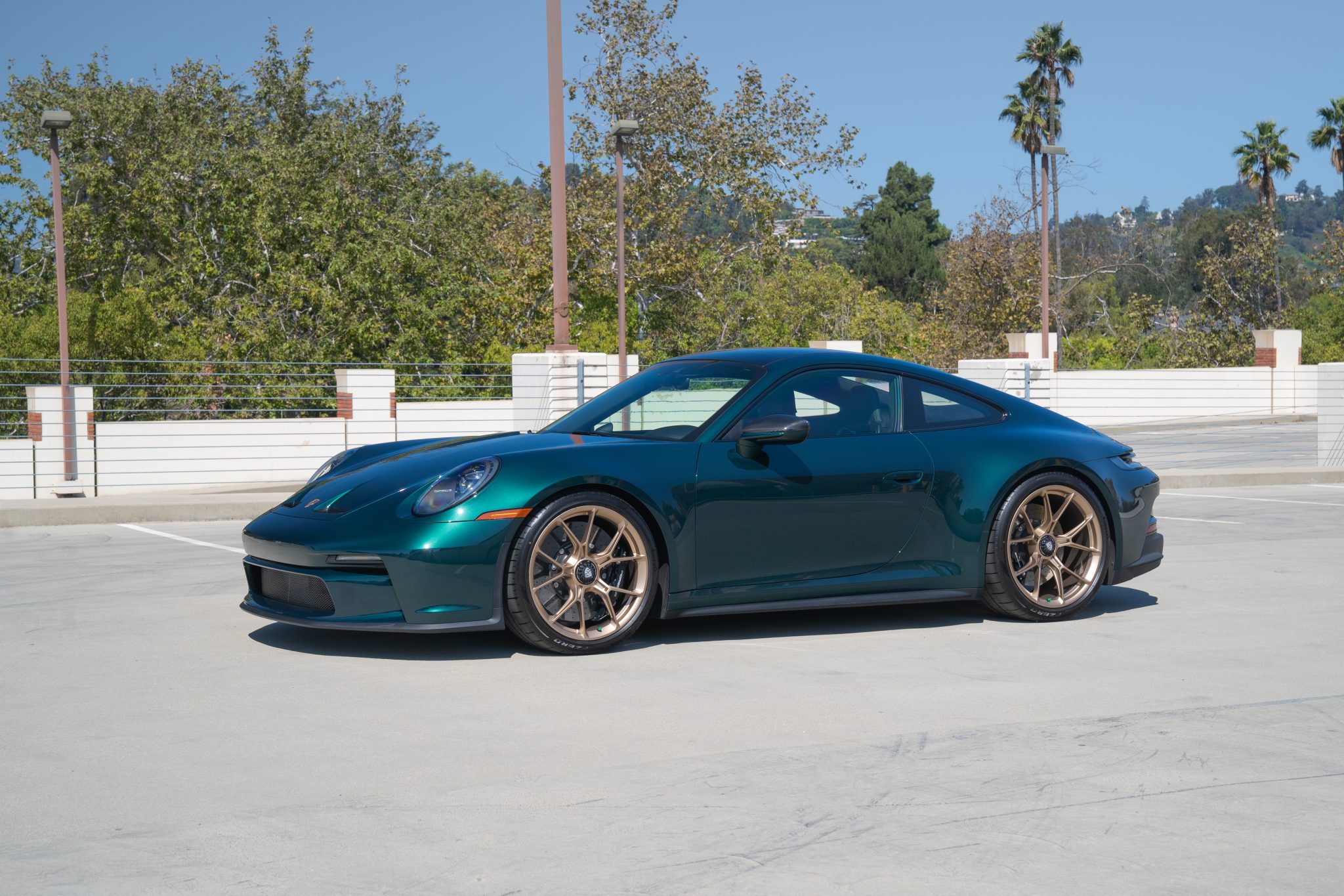 Forged 20″ and 21″ center-lock wheels wear a Satin Neodyme finish and are mounted with 255/35 front and 315/30 rear Pirelli P Zero Corsa tires. The car features a double-wishbone front suspension setup with Porsche Active Suspension Management as well as a front-axle lift system and rear-axle steering. Braking is provided by black Porsche-branded six-piston front and four-piston rear aluminum monoblock calipers fitted over carbon-ceramic rotors.