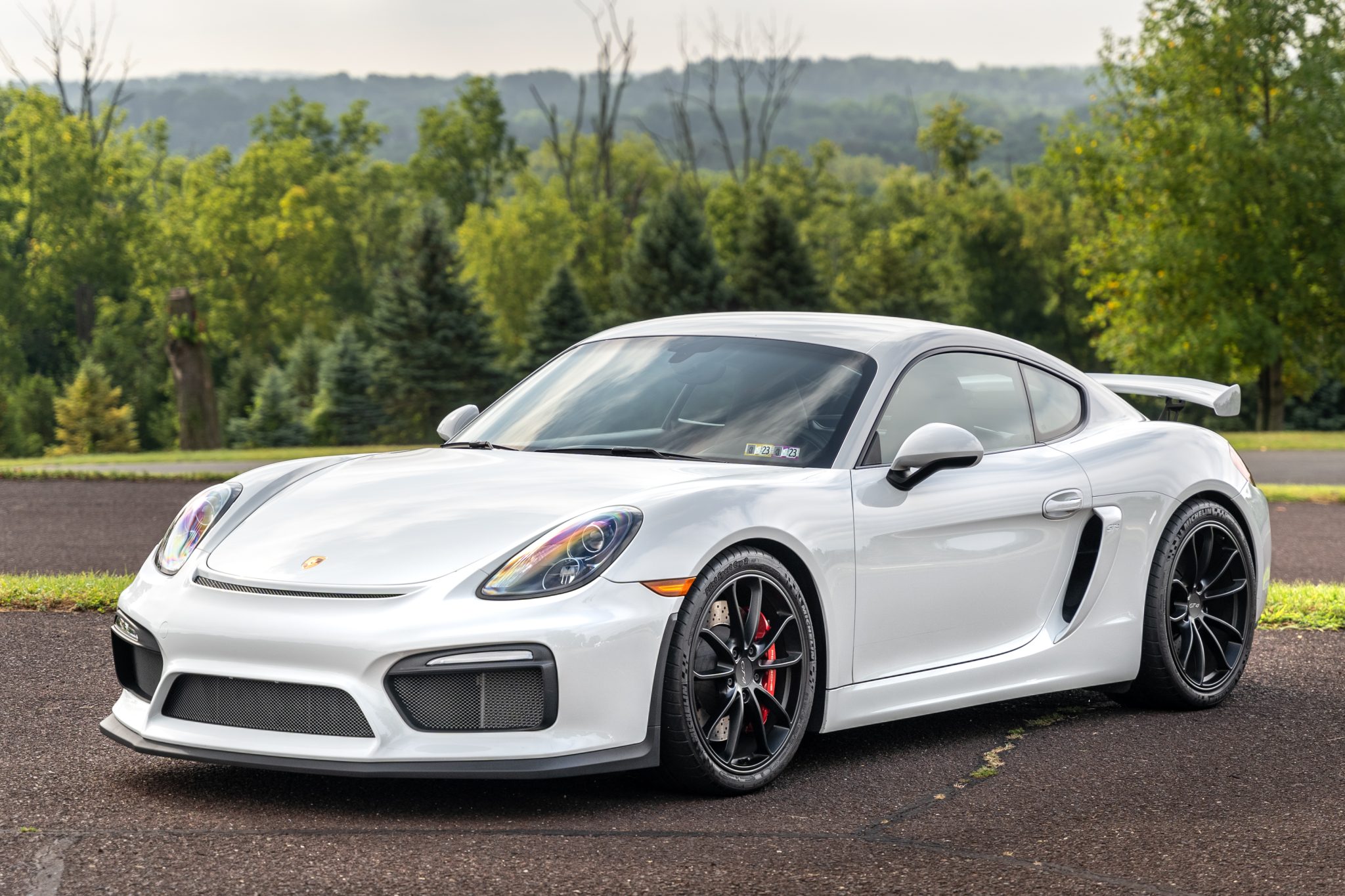 Black 20″ GT4 alloy wheels are mounted with Michelin Pilot Sport Cup 2 tires measuring 245/35 up front and 295/30 out back. Braking is handled by four-wheel cross-drilled and ventilated discs with red-painted Porsche-branded calipers. The GT4 utilized front suspension components from the 991.1 GT3 as well as a specially tuned multi-link rear setup, Porsche Stability Management, Porsche Torque Vectoring, and PASM adaptive dampers.