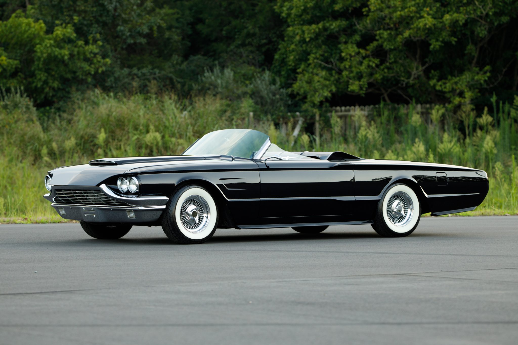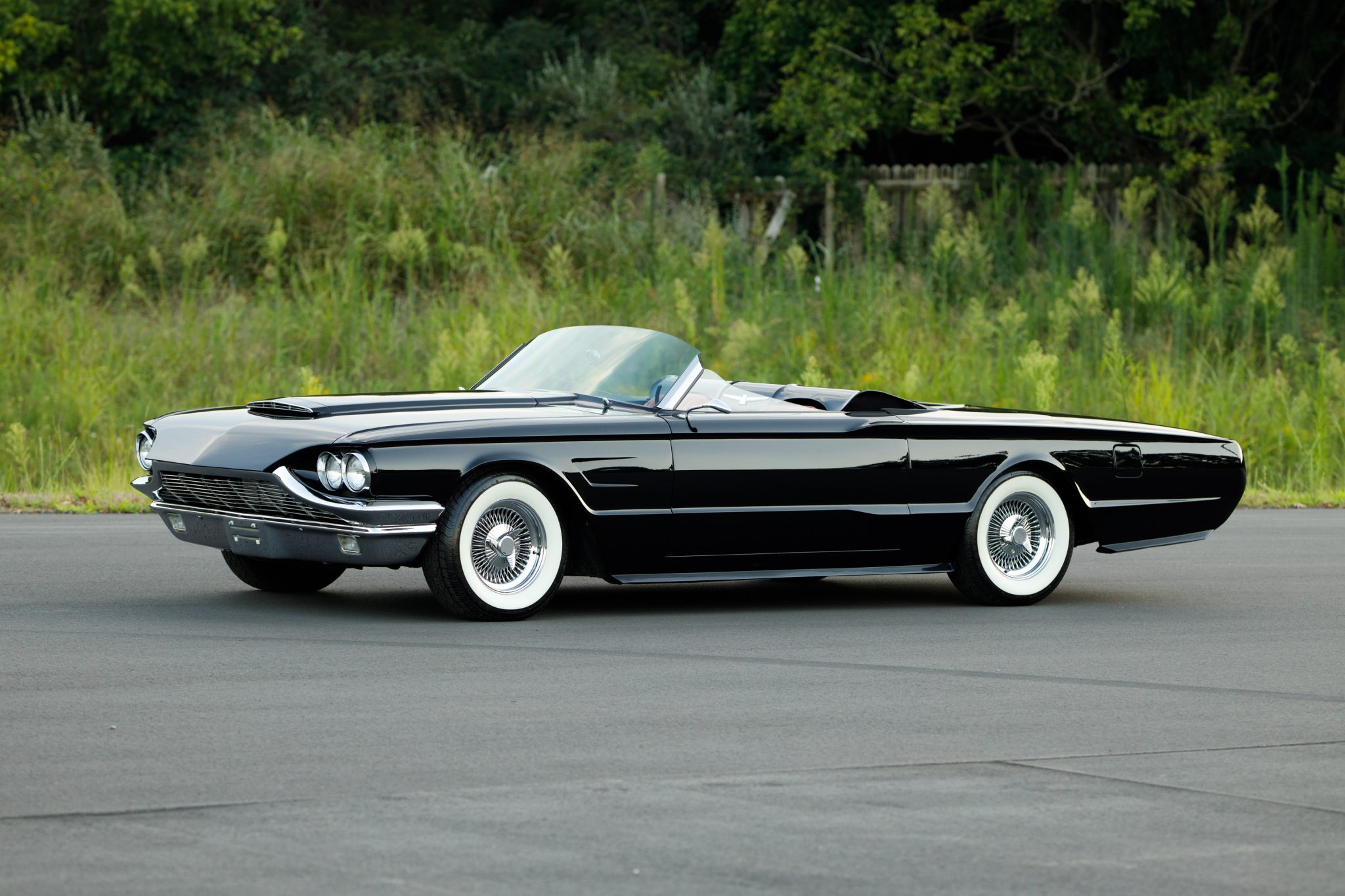 Chrome-finished 15″ wire wheels are equipped with simulated knockoffs and wear 225/70 BFGoodrich Silvertown wide-whitewall tires. The car is equipped with power-assisted steering and brakes, and service performed in February 2022 included replacing the brake booster and strut rod bushings.