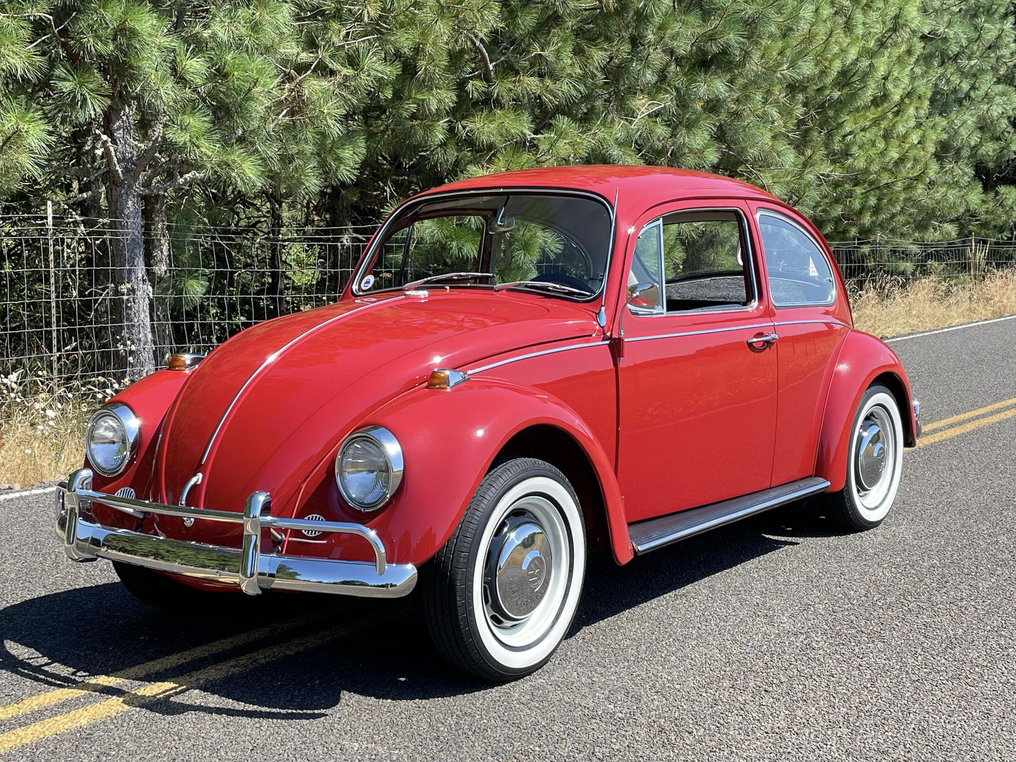 Black- and white-painted steel 15″ wheels wear VW-logo hubcaps and are mounted with 155-series Radar Dimax Classic whitewall tires that show 2019 date codes. The shocks were replaced under previous ownership according to the selling dealer.