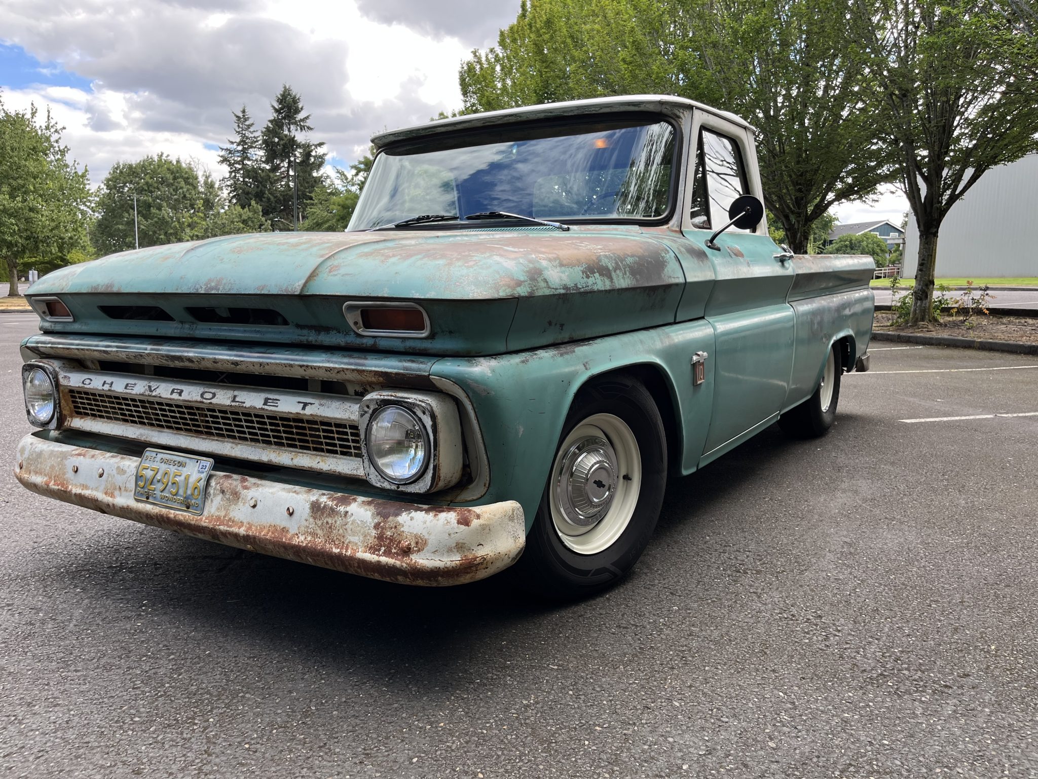 Painted 15×6″ and 15×8″ six-lug steel wheels wear bowtie hubcaps and are mounted with a mixed set of Hankook Kinergy ST and Milestar Streetsteel tires. The seller notes that Classic Performance Products 2″ drop disc front spindles are fitted along with six-lug front rotors and a dual-circuit master cylinder. Suspension modifications include 4″ rear lowering springs, 2″ front lowering springs, a C20 front sway bar, and Monroe Magnum shocks on relocated mounts. The idler arm, ball joints, control arm bushings, tie rod ends, and sway bar bushings were reportedly replaced as well.