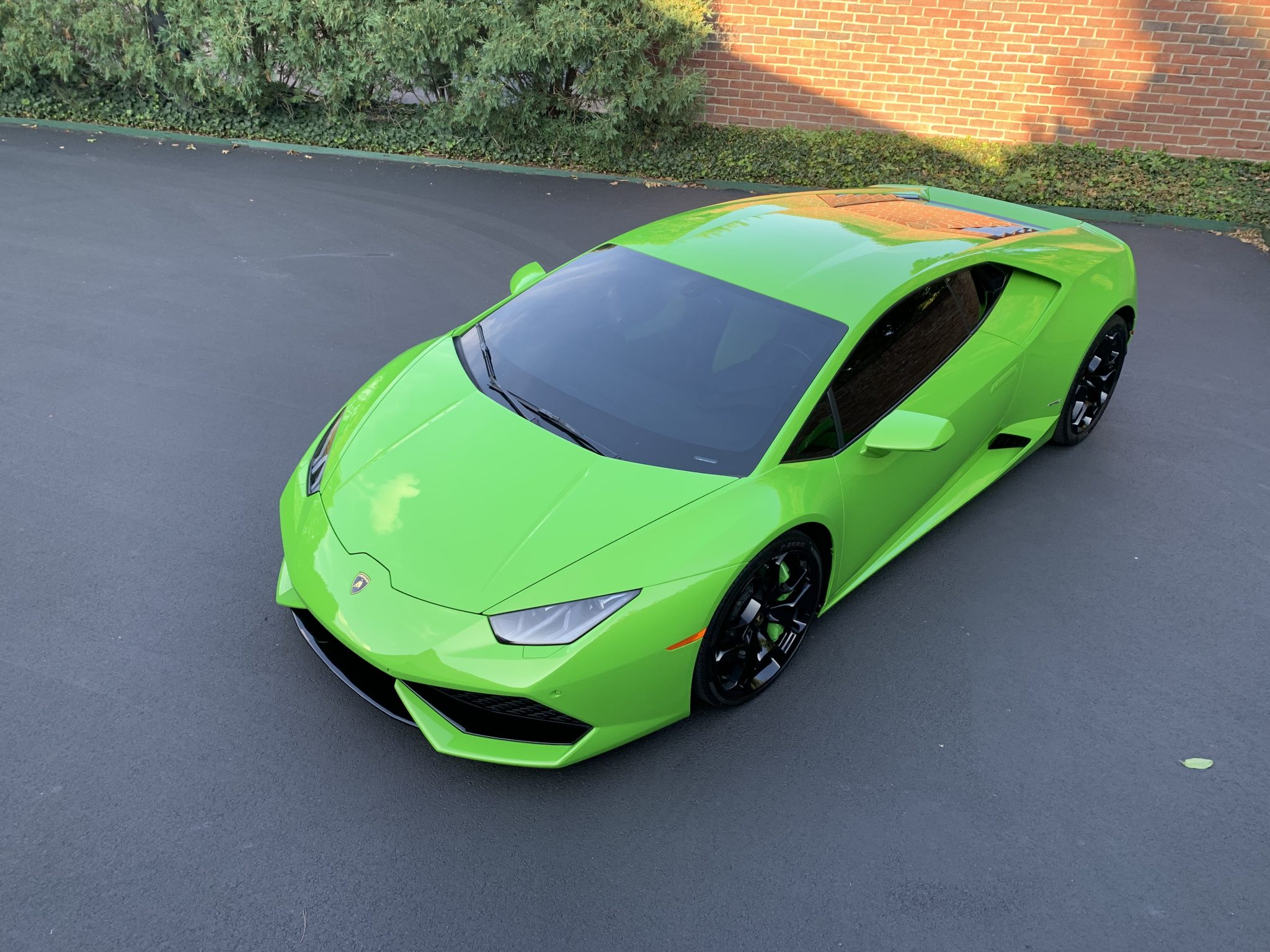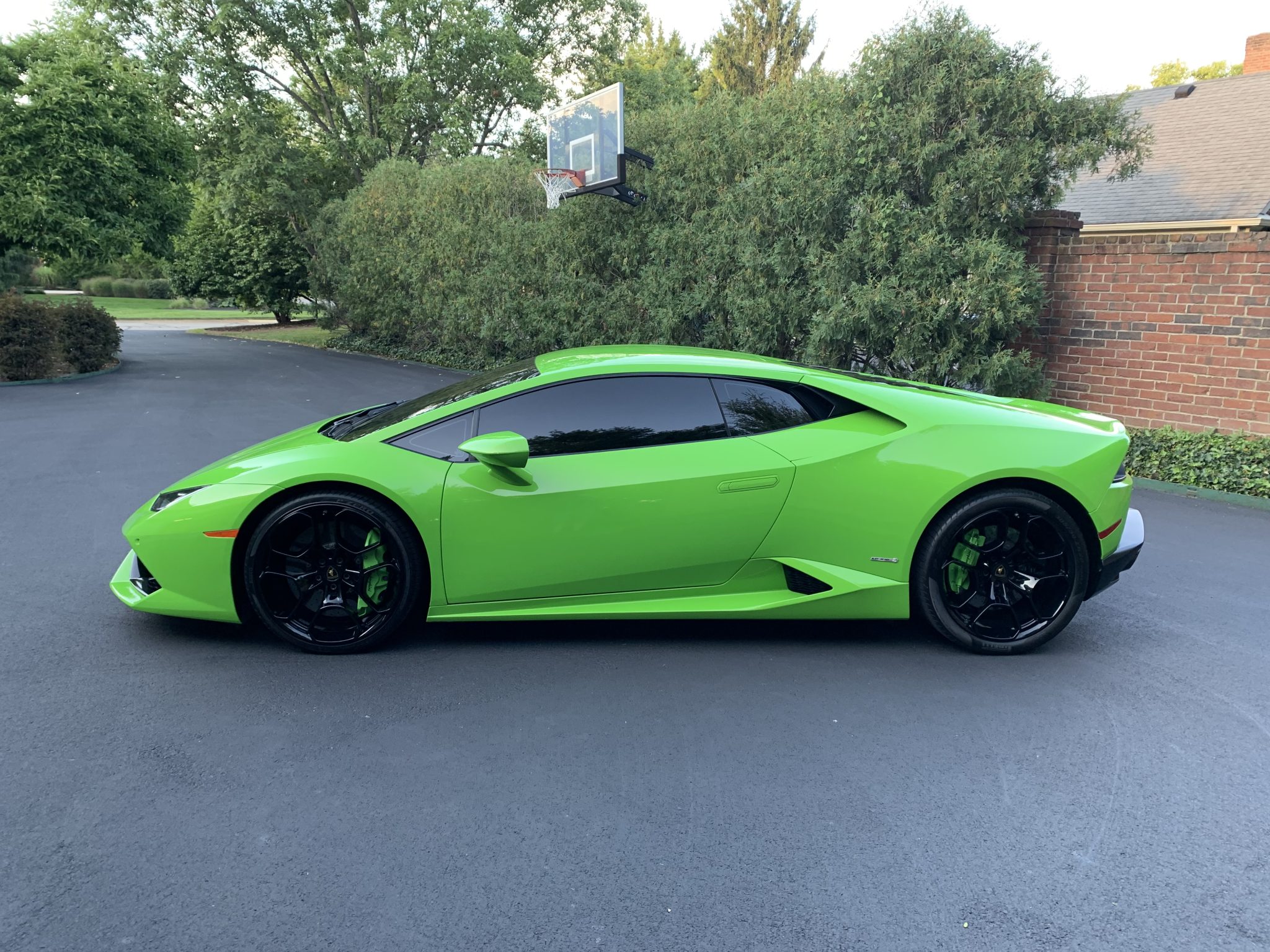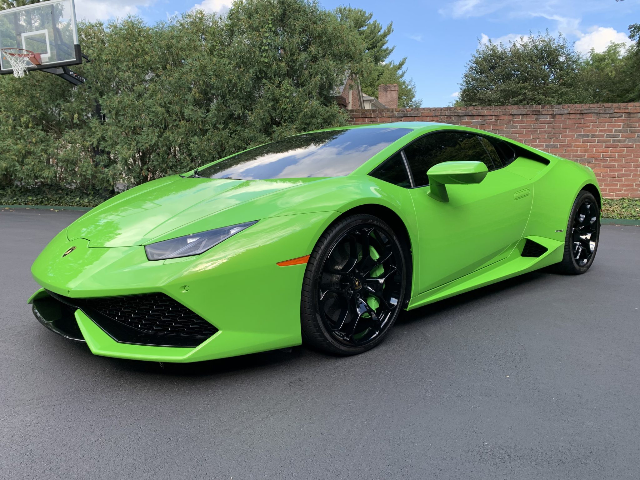 Black-finished 20″ alloy wheels are mounted with 245/30 front and 305/30 rear Pirelli P Zero tires that show 2014 date codes. Braking is handled by green Lamborghini-branded calipers over cross-drilled carbon-ceramic rotors at all four corners, and the car is equipped with three ANIMA dynamic driving modes and a front axle-lift system. According to the seller, the tires require replacement due to age. A brake fluid flush was carried out in August 2021.