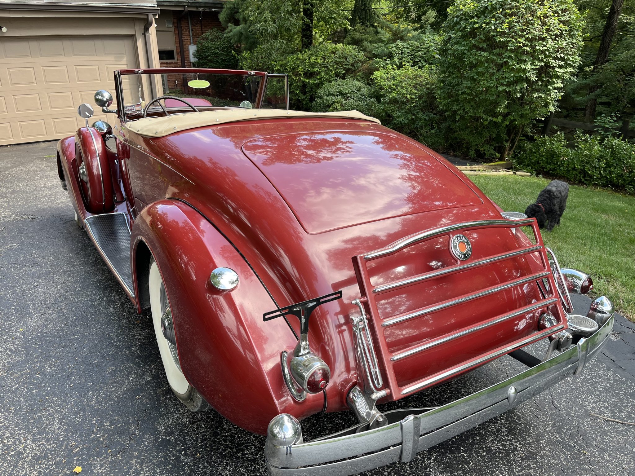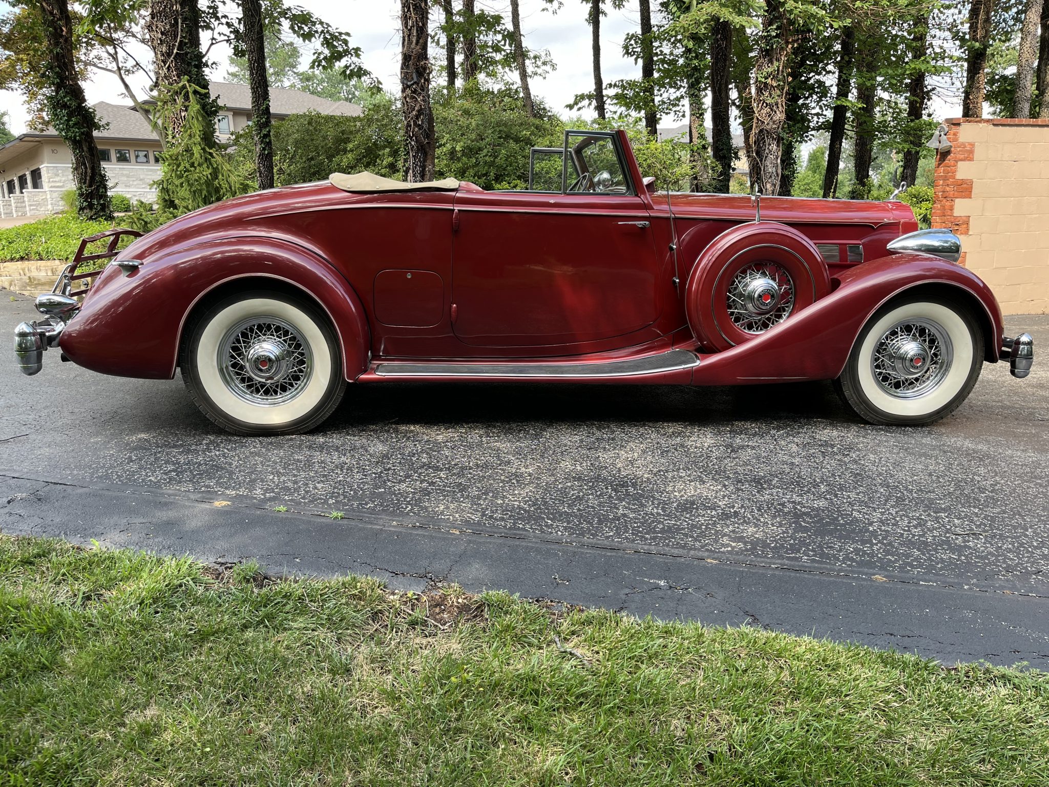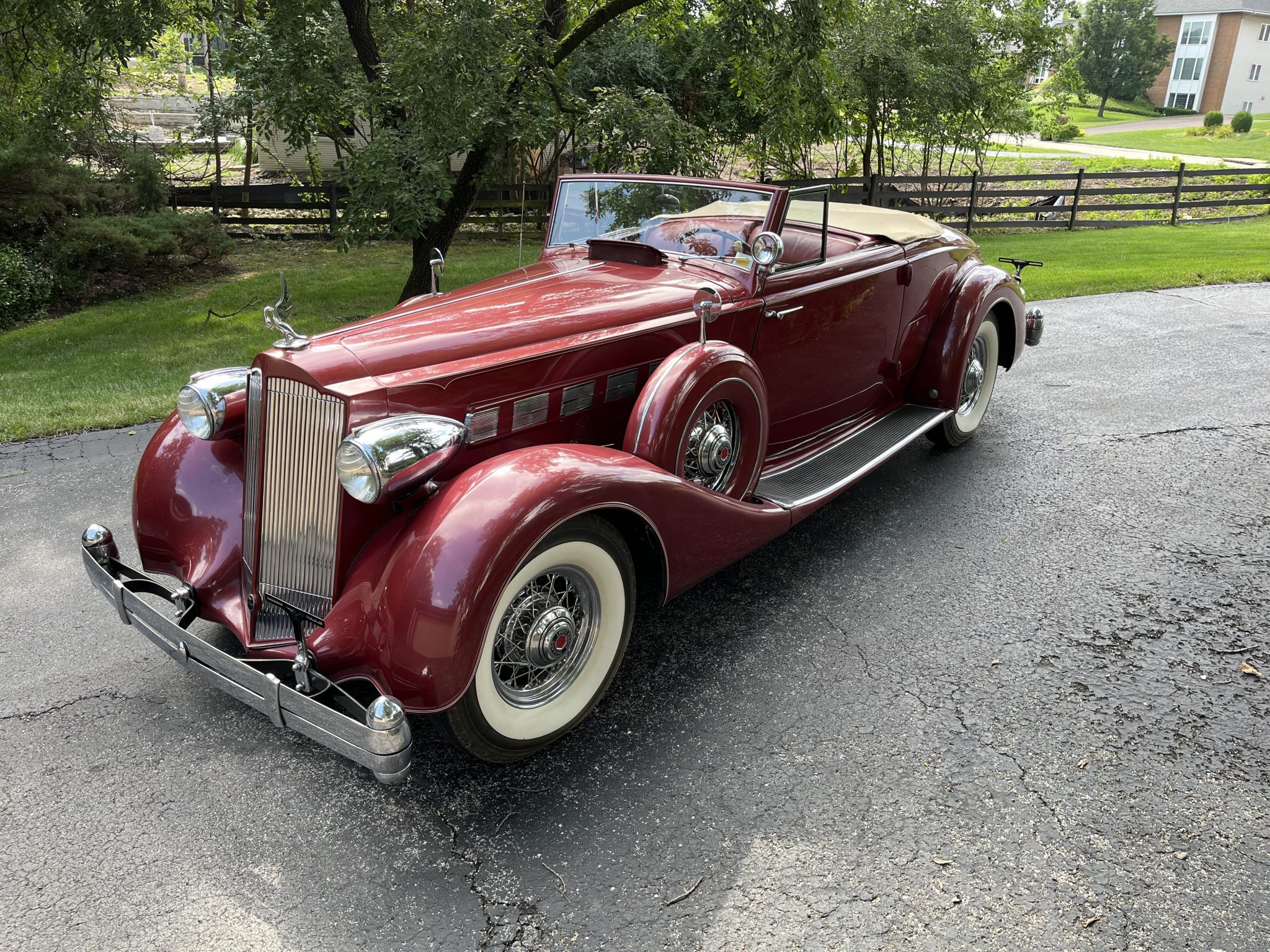 The chrome wire wheels are mounted with radial wide whitewall tires that were reportedly installed in 2013. Matching spare wheels housed in body-color hard covers are located on both front fenders. The Series 1404 rode on a 139″ wheelbase and featured semi-elliptical leaf springs at all four corners as well as a Bijur chassis lubrication system. Stopping power is provided by mechanical drums at each wheel. The tan soft top features a glass rear window and can be seen raised in the gallery.