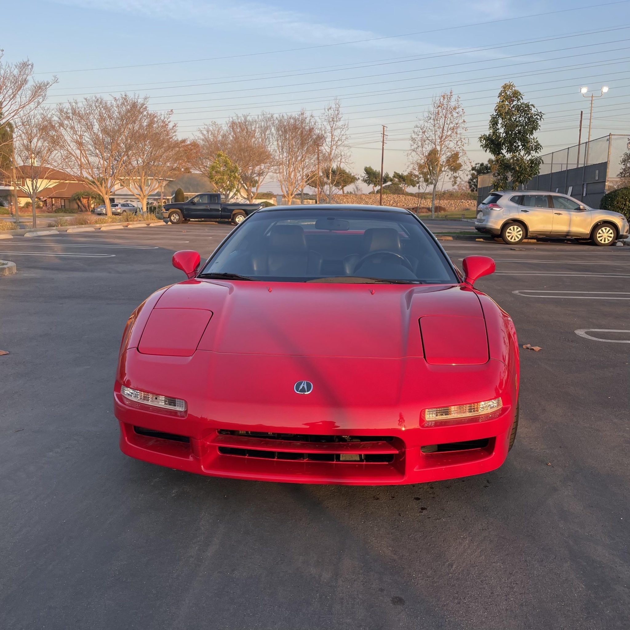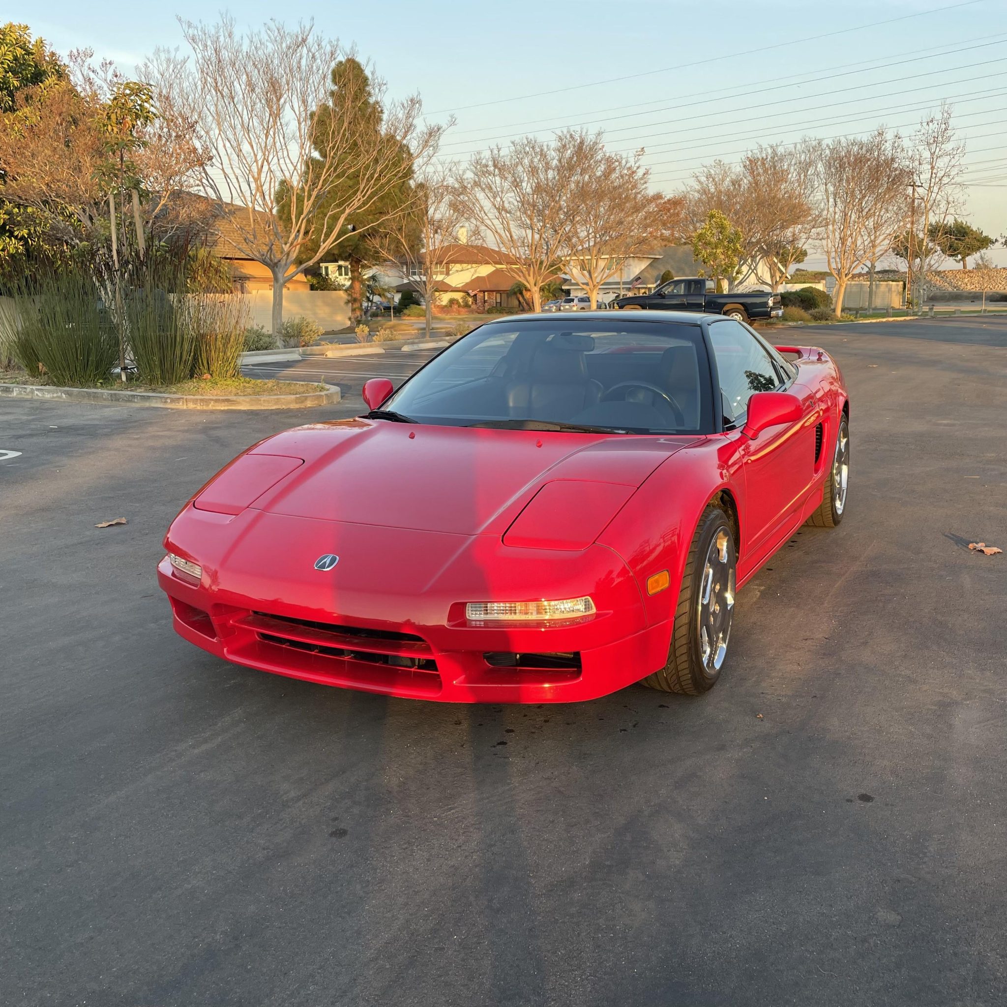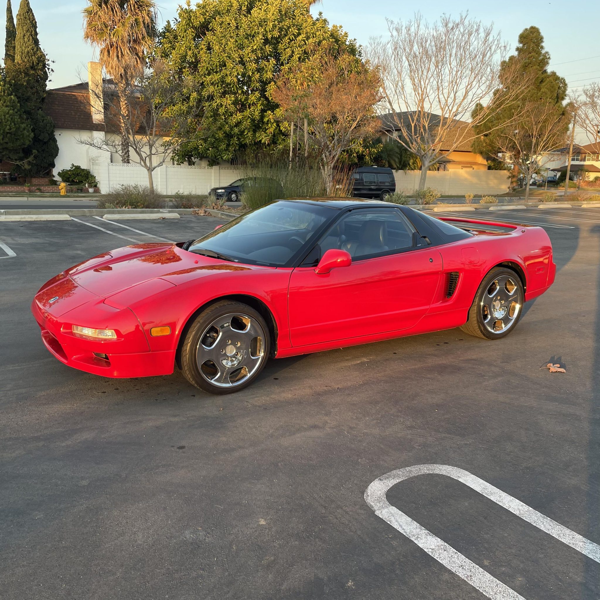 Chrome 17″ Club Linea wheels are mounted with staggered-width Yokohama S Drive tires. The car features a four-wheel double-wishbone suspension with front and rear stabilizer bars, and braking is handled by NSX-branded calipers over vented rotors at each corner. Curb damage is noted on the right-front wheel.