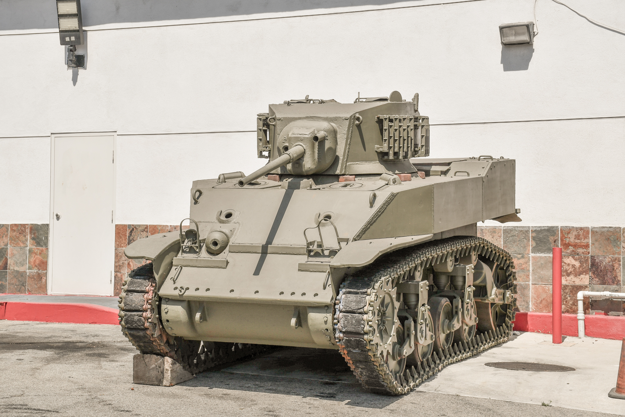 The Stuart M5A1 uses vertical volute suspension and utilizes four road wheels per side in addition to idler wheels out back and track tensioner rollers mounted to the top of each bogie.