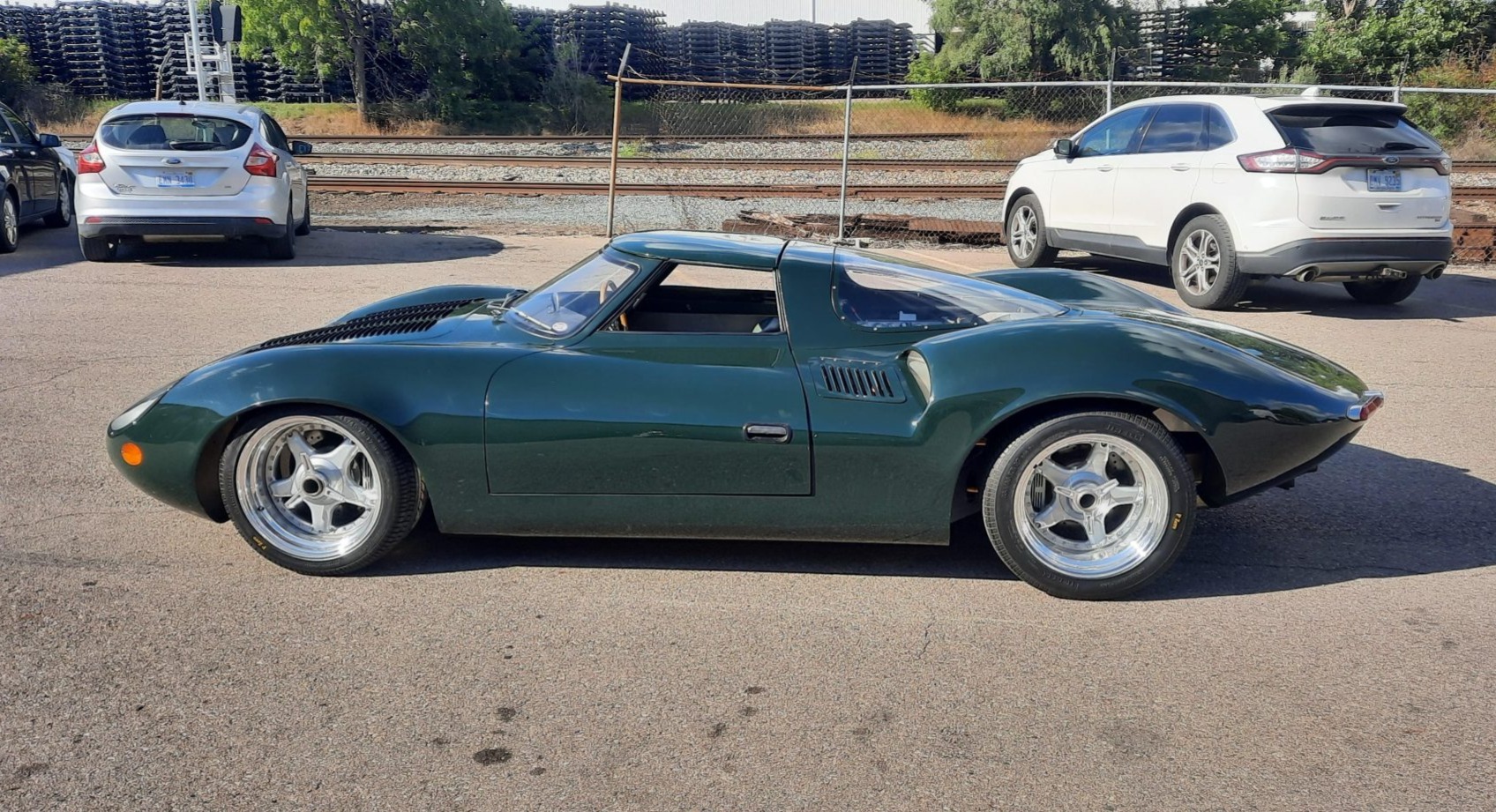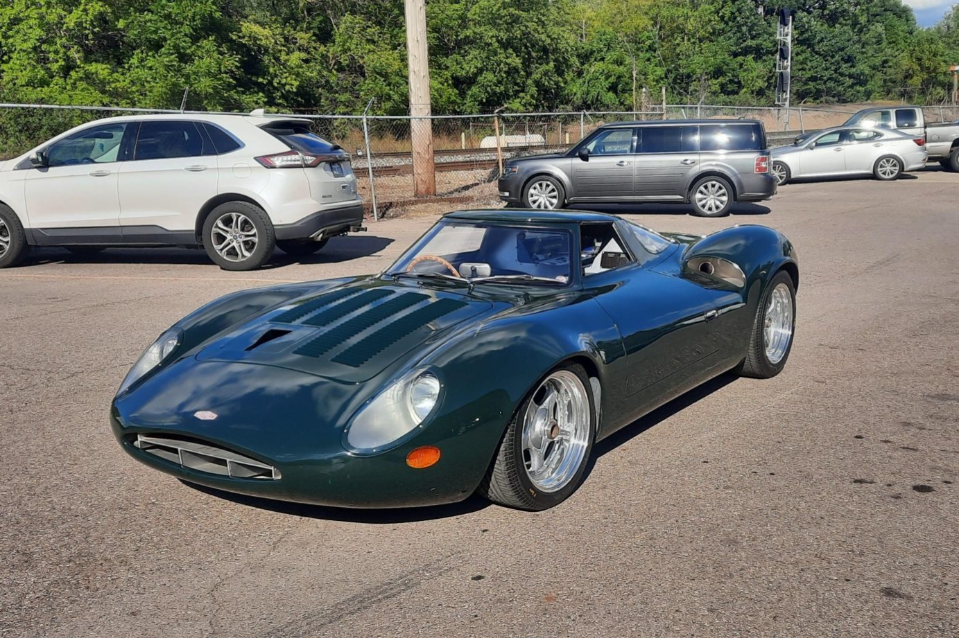 While the original XJ13 was based on an aluminum monocoque, this replica is said to have been built around a space frame to which aluminum panels were affixed. Fiberglass bodywork simulating that of the XJ13 is finished in green, and various touchups and scrapes are noted in the finish. The louvered hood panel was repainted to address peeling. Features include a removable roof panel, a plexiglass engine cover, faired headlights, E-Type taillights, and a single NACA duct offset in the hood panel.